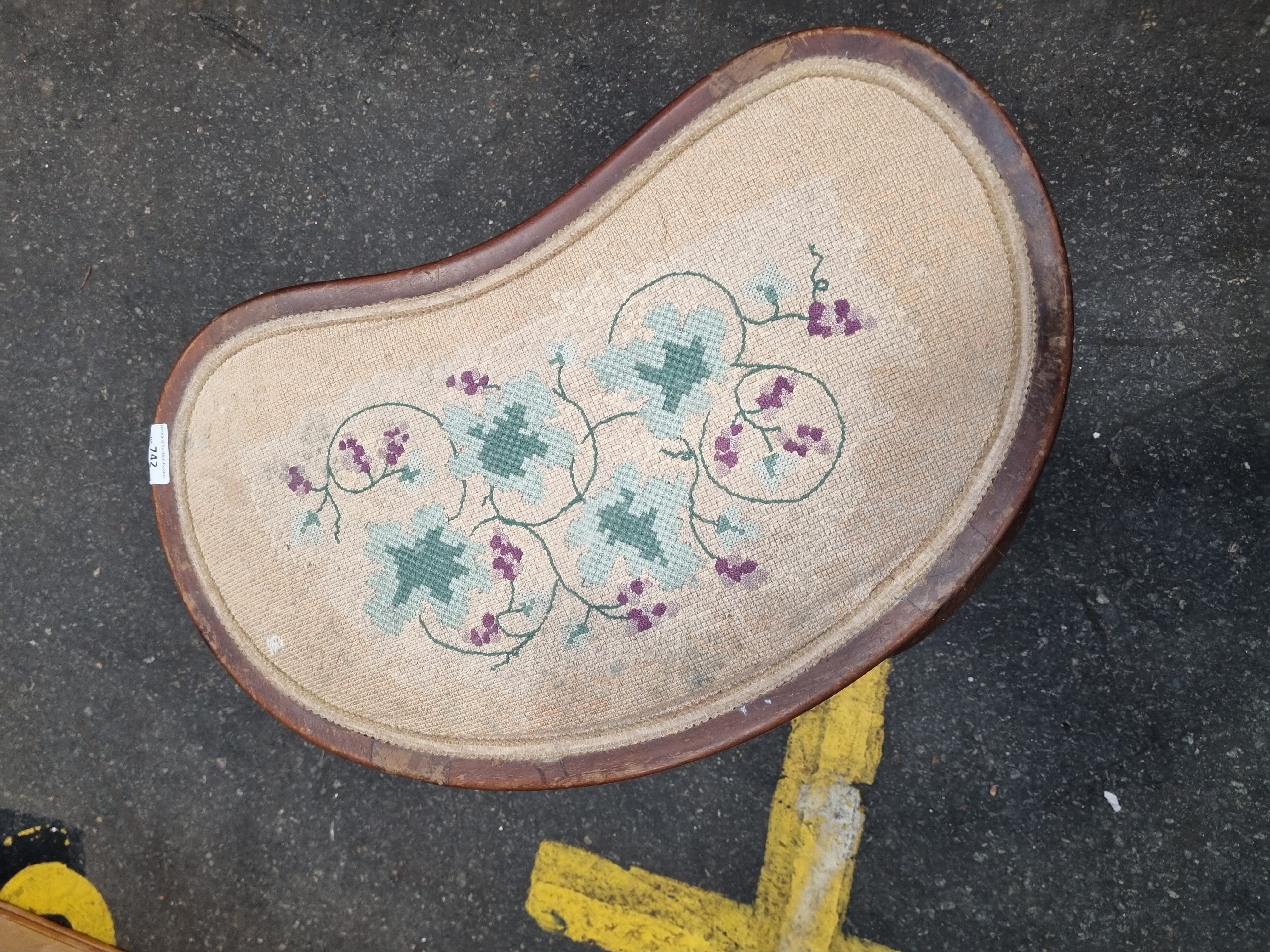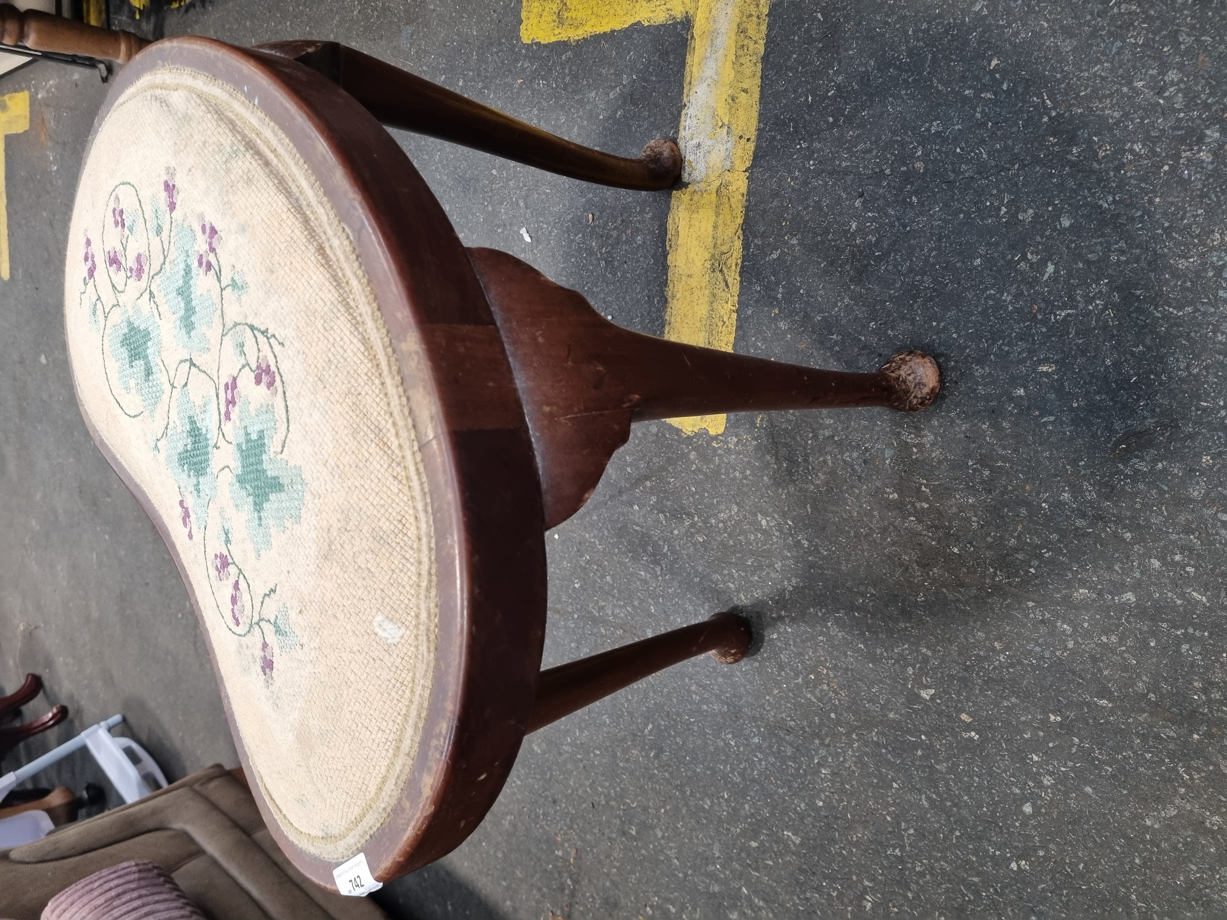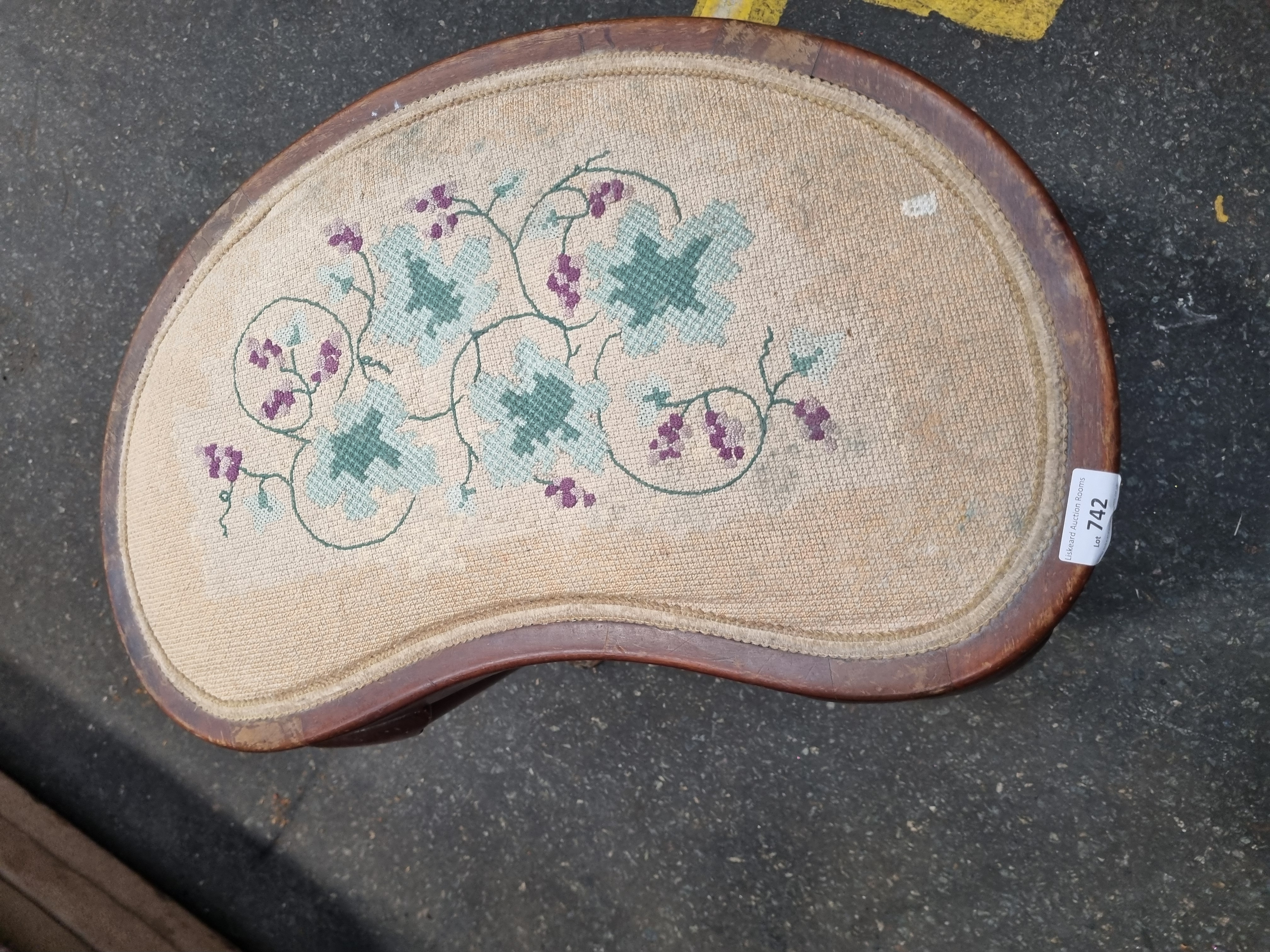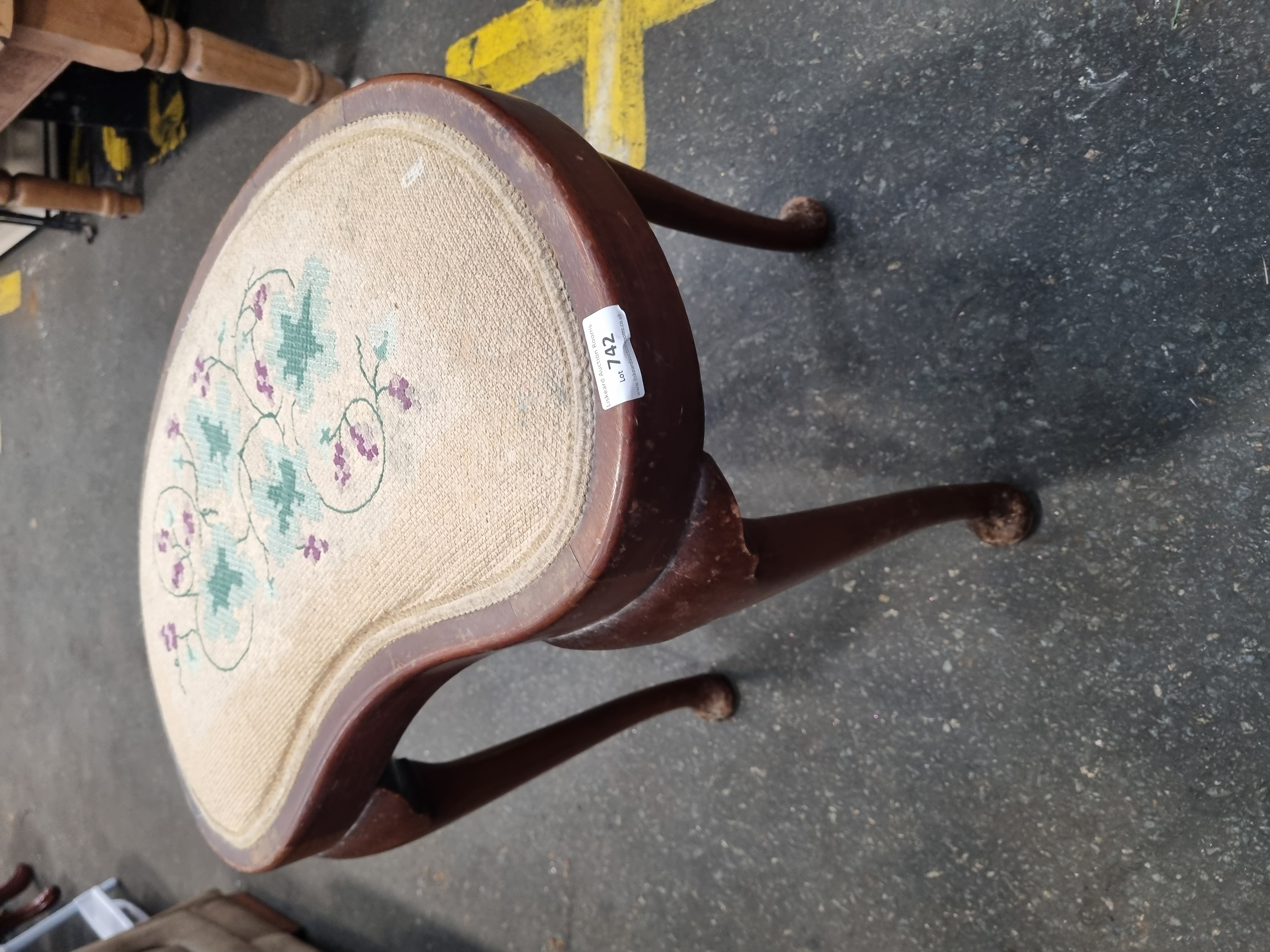 An early 20th century mahogany dressing table stool of kidney shaped form, designed in the Edwardian Queen Anne revival style. The stool features an inset upholstered seat with a needlepoint tapestry cover, hand worked with scrolling foliate and floral motifs in shades of sage green and purple on a cream ground. The frame is supported by four slender cabriole legs, each terminating in a traditional pad foot. A white rectangular adhesive label for Liskeard Auction Rooms is affixed to the side of the seat frame.