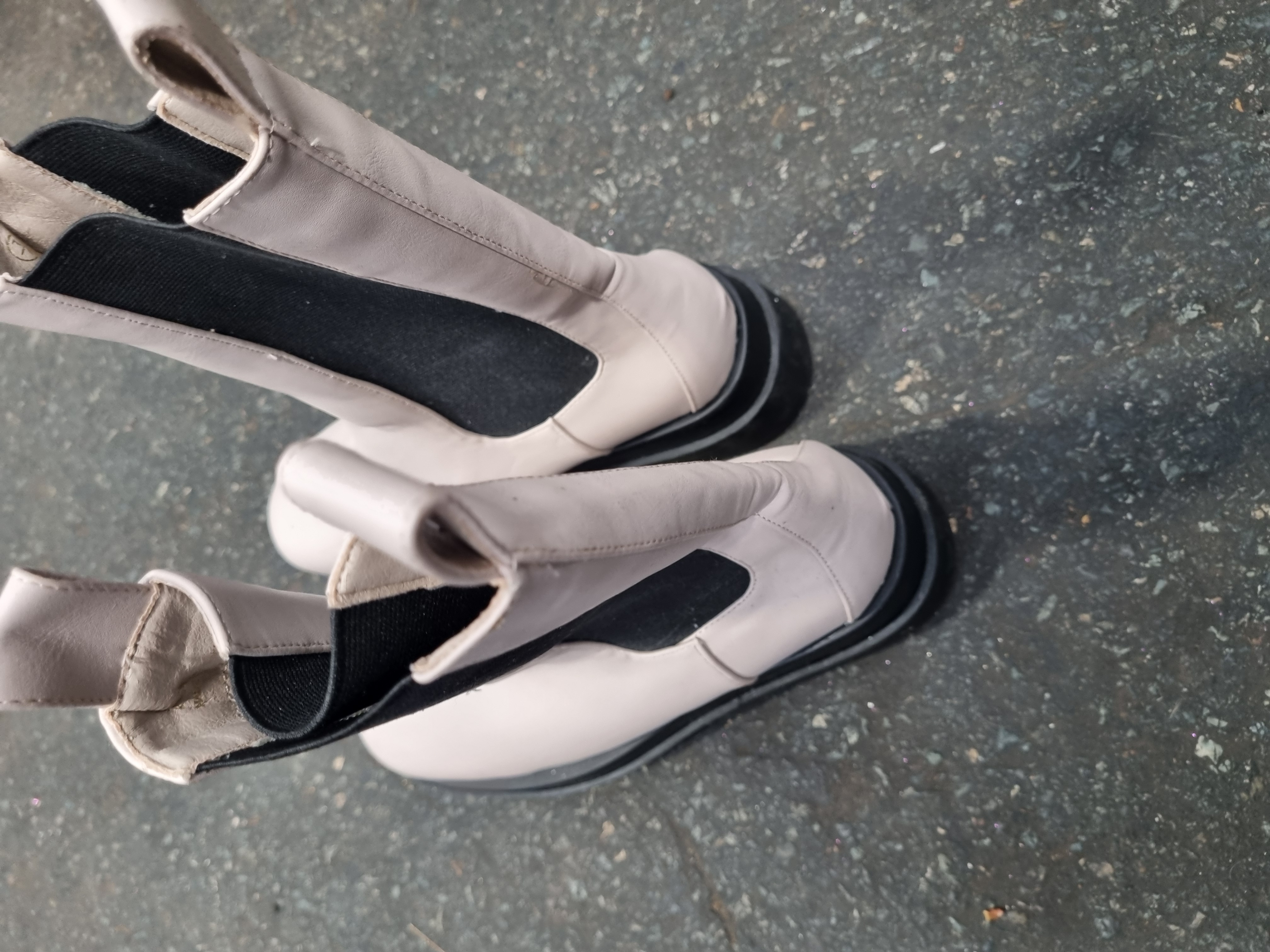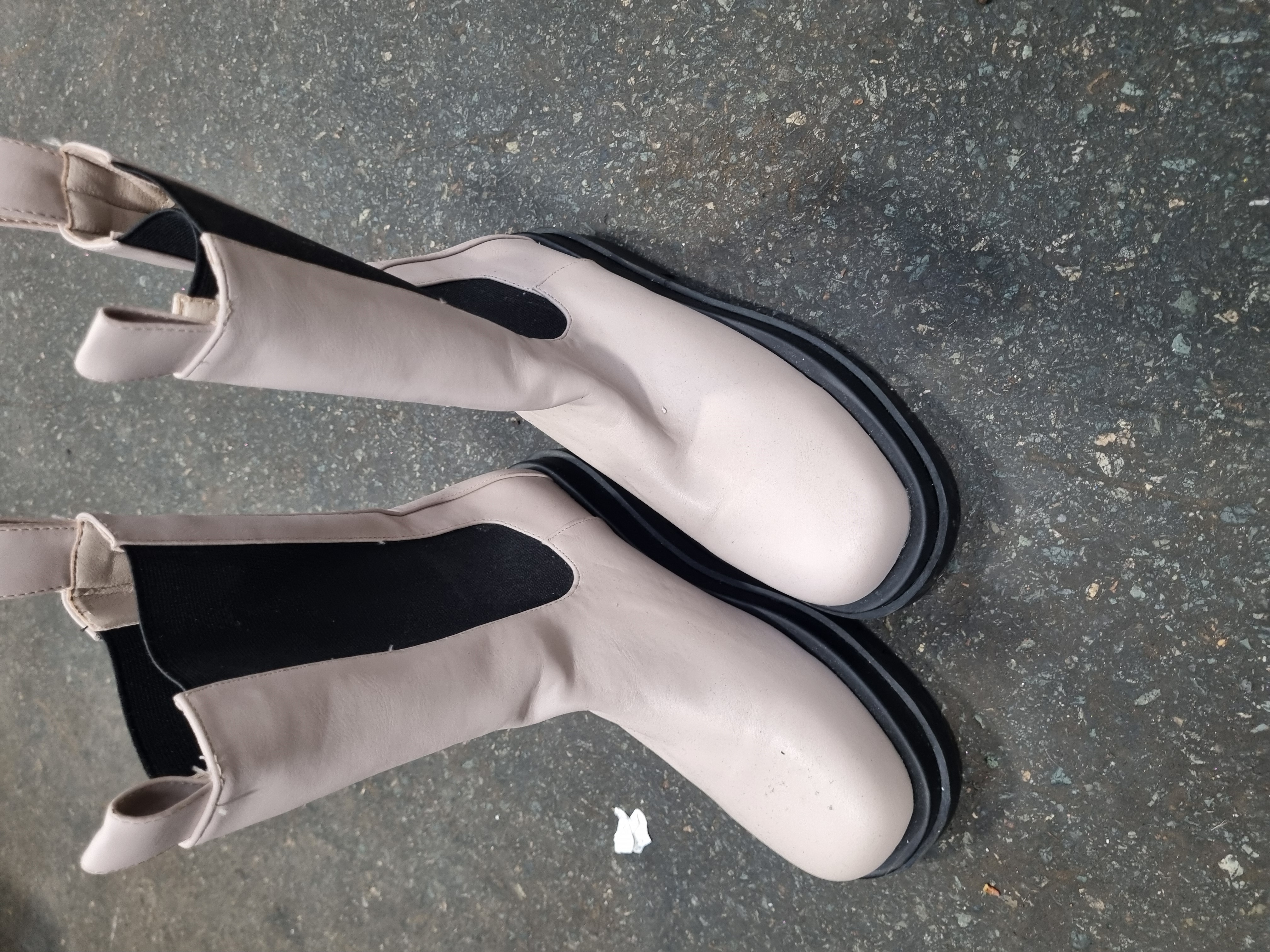 A pair of contemporary tall Chelsea boots in the Bottega Veneta Tire style. The uppers are crafted in a beige Sea Salt tone with contrasting black elasticated gussets and twin pull tabs at the collar. The design features a chunky black rubber lugged platform sole with a distinctive wavy upper edge. A circular size stamp for a European 41 is visible to the interior. No other brand markings are present.
