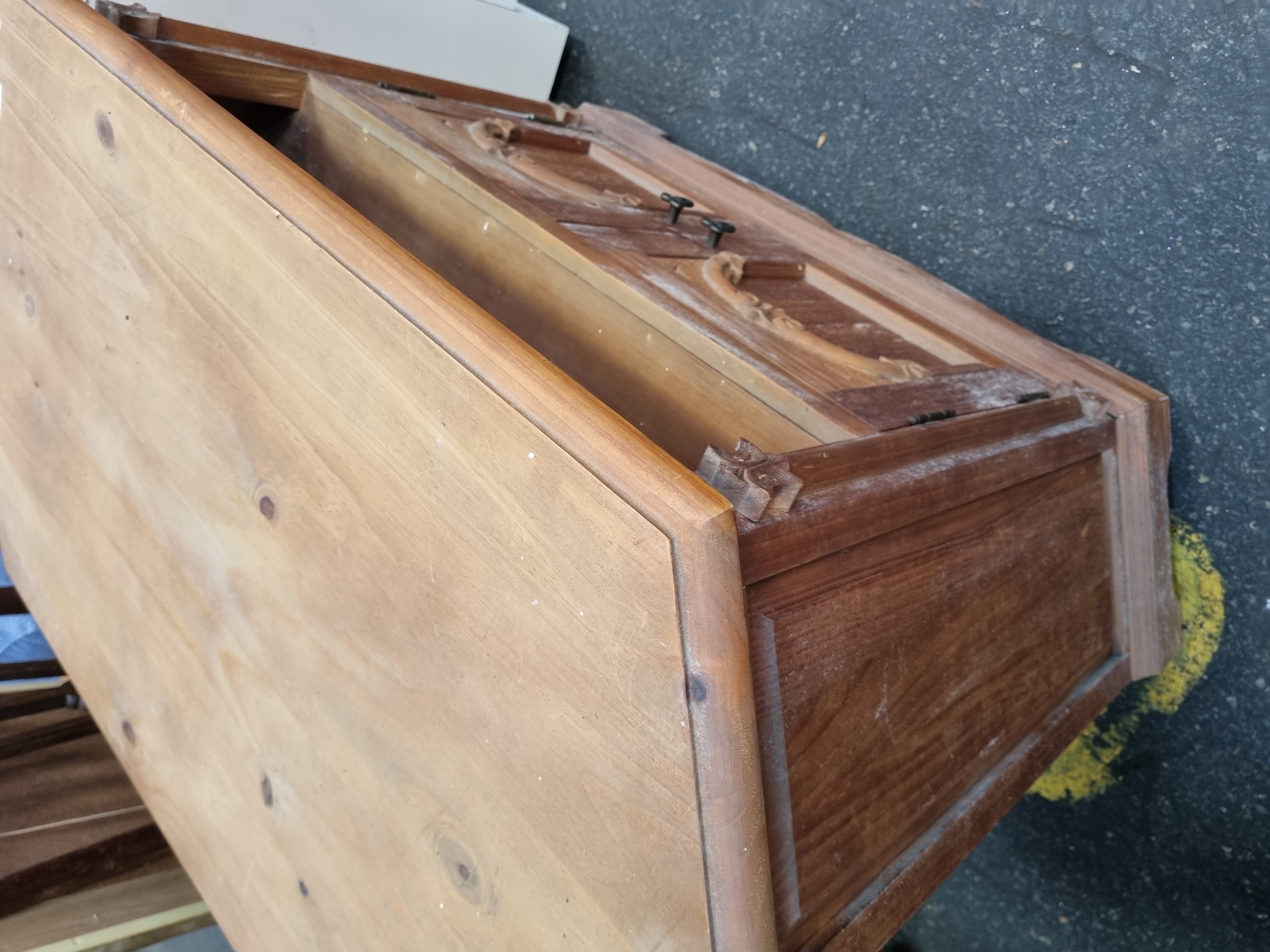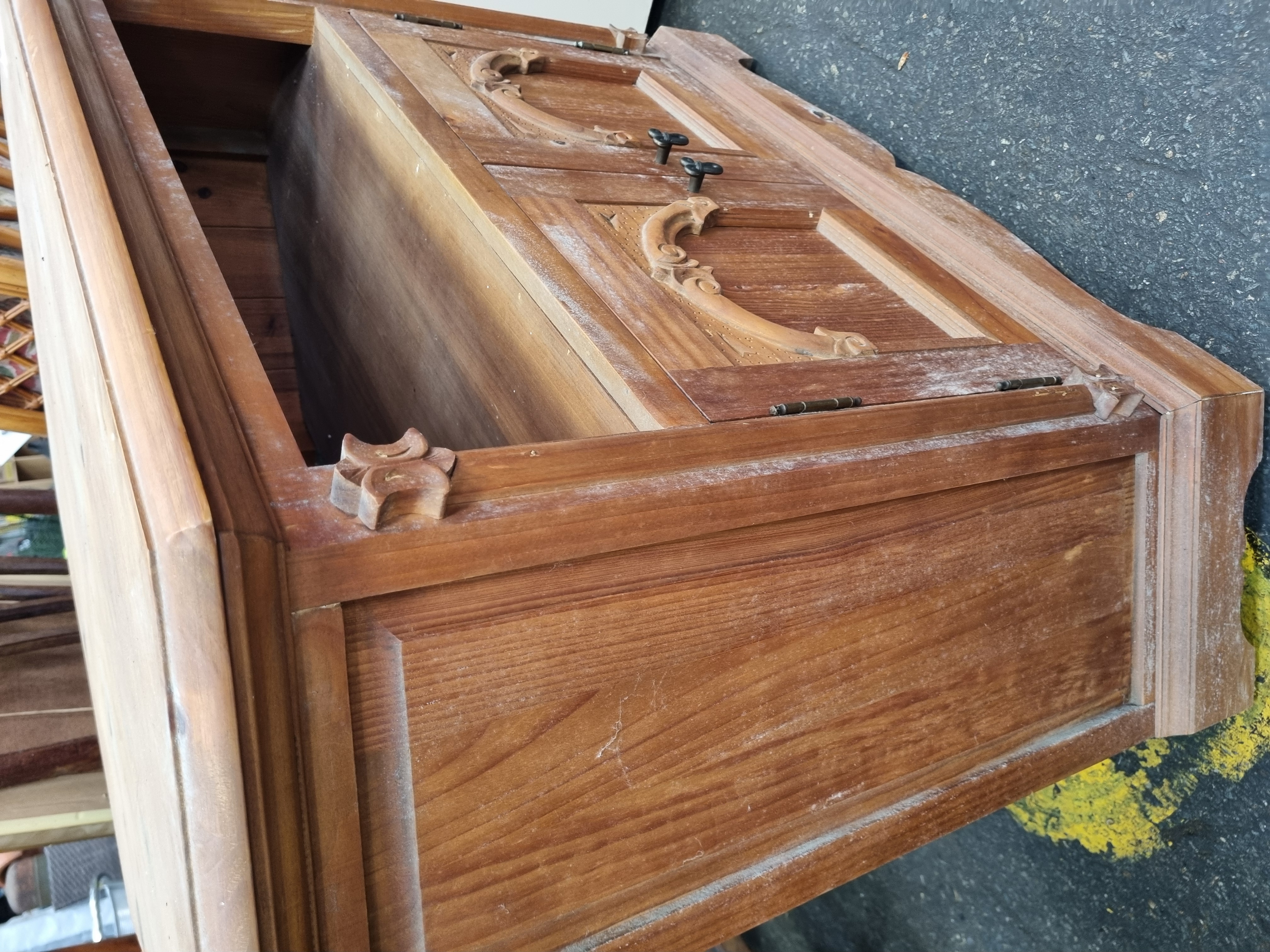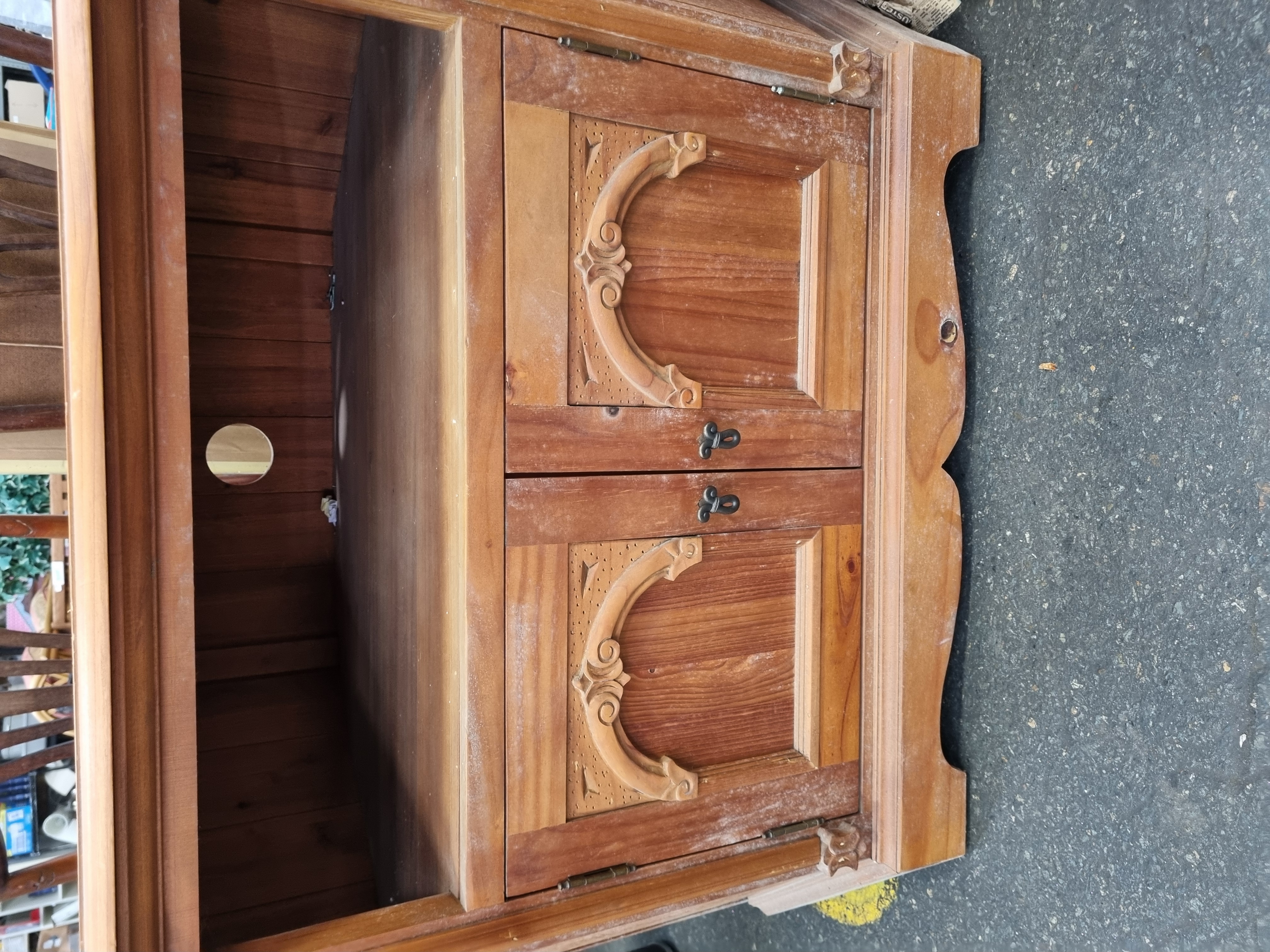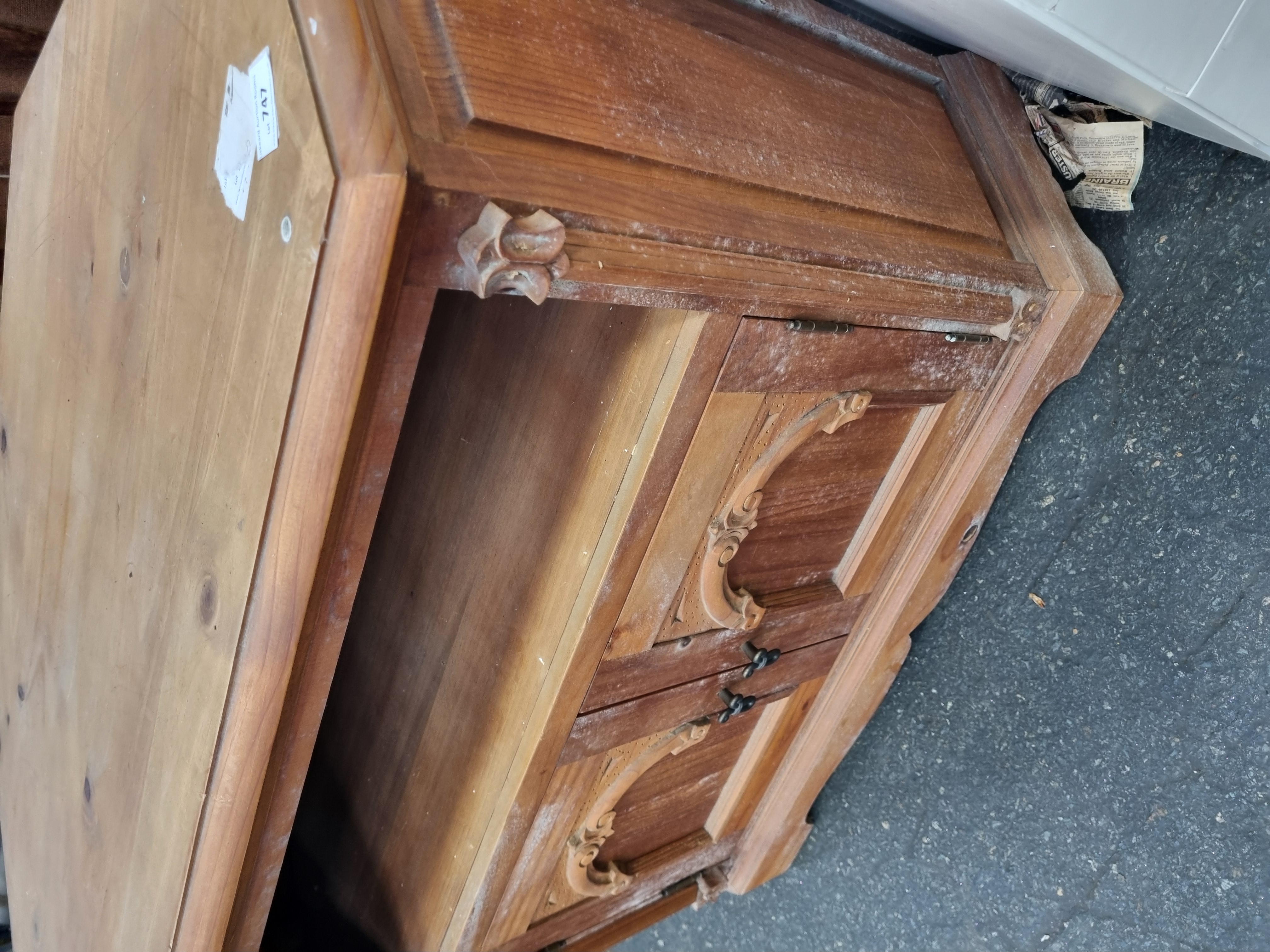 A single-piece media cabinet constructed from solid pine with a medium honey-toned finish. The upper section comprises an open shelf featuring a circular cable-management aperture to the rear panel. The lower section contains a two-door cupboard, each door featuring a raised panel decorated with applied C-scroll wood carvings and pin-punched detailing. The piece is fitted with small metal pull knobs and external barrel hinges, and it stands on a shaped, scalloped plinth base. A white paper auction tag marked Lot 747 is adhered to the top surface.