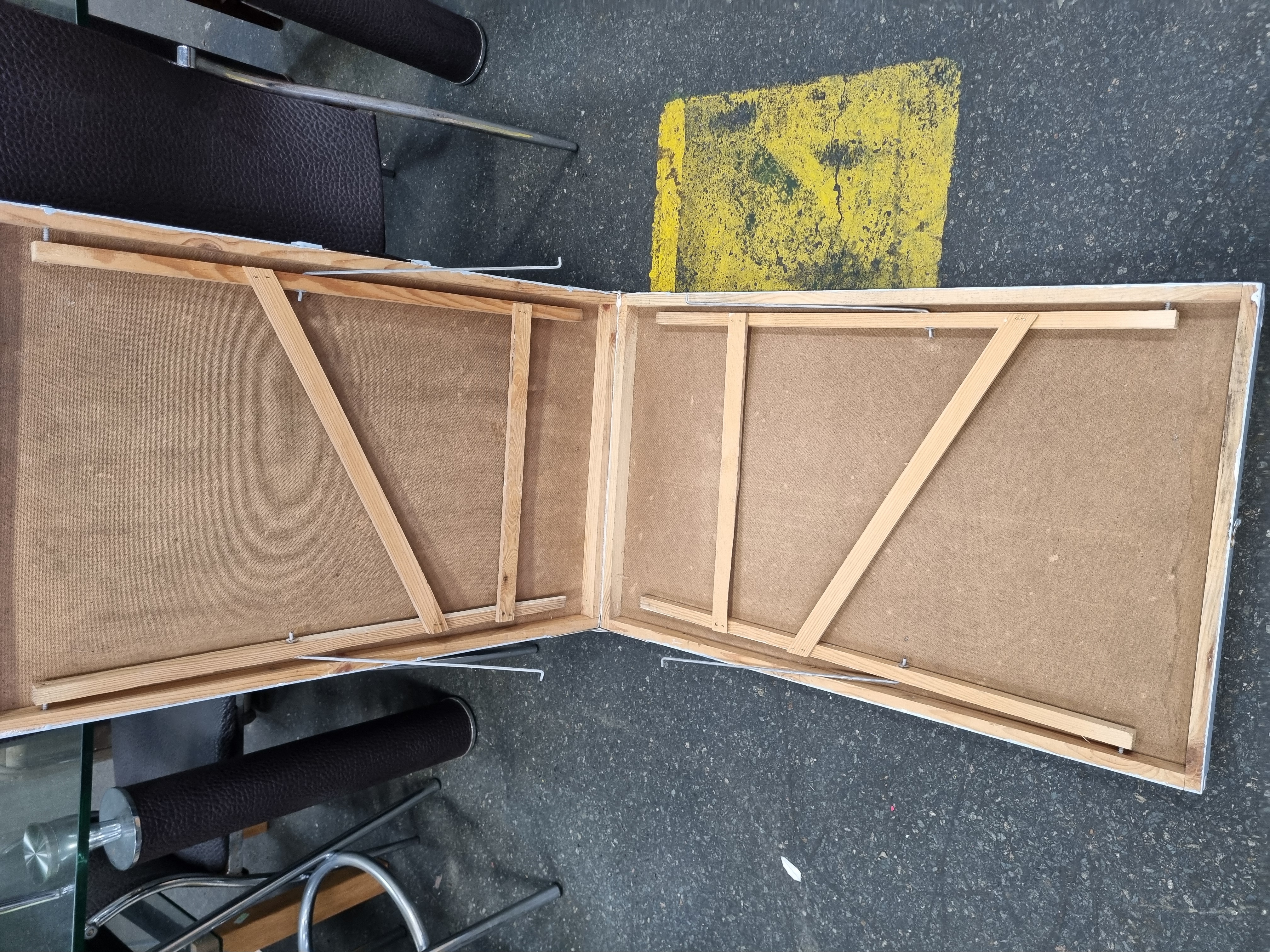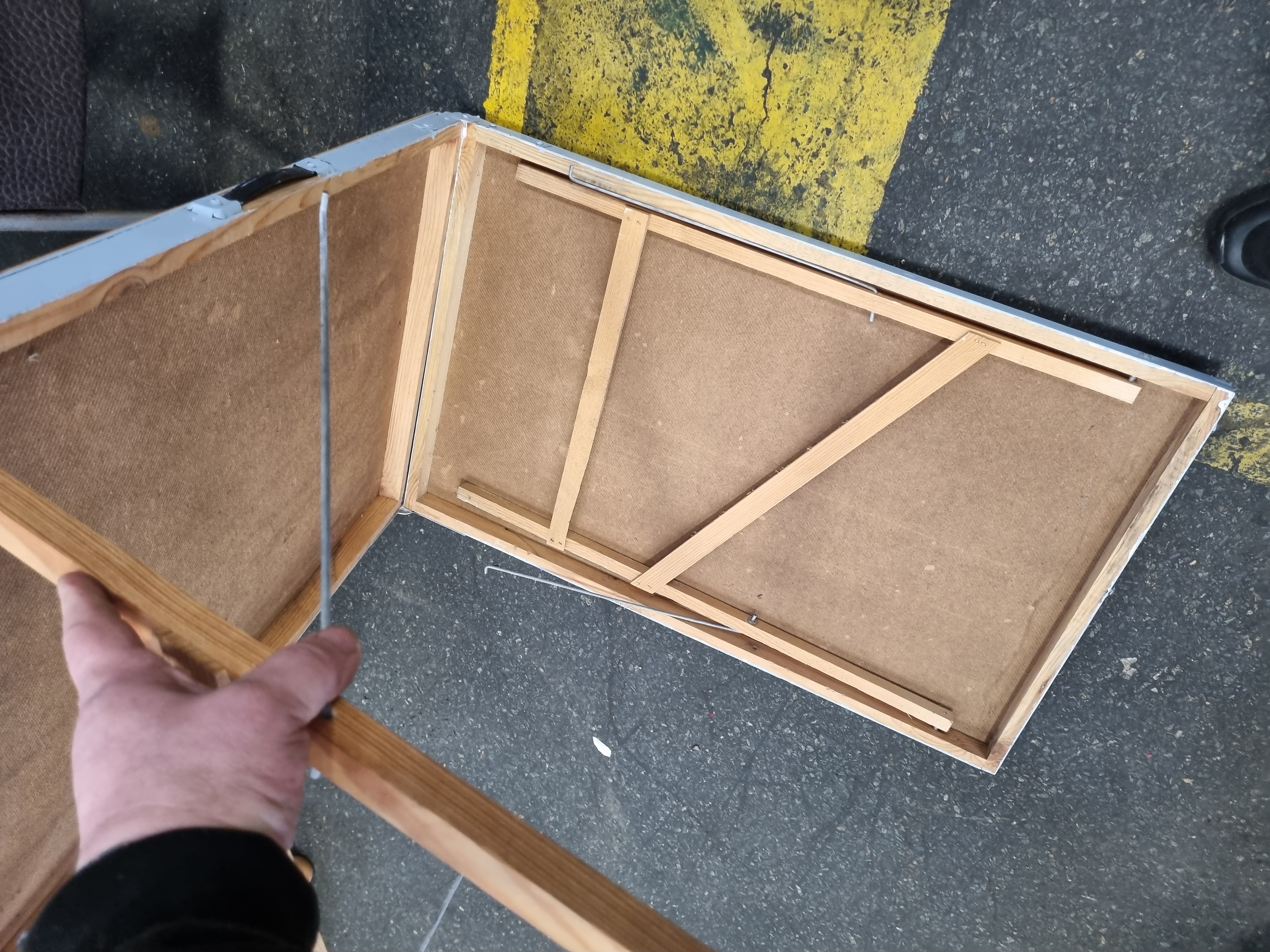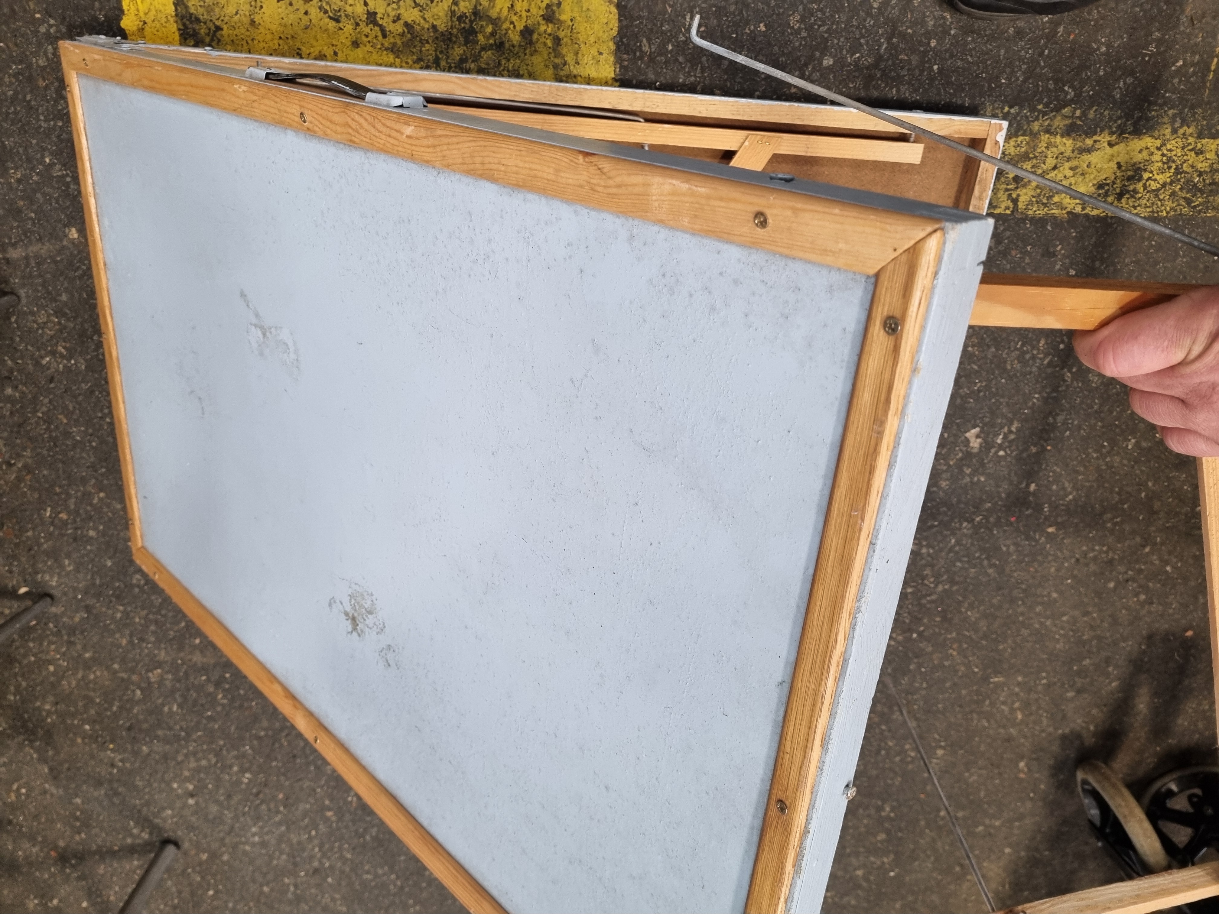 A portable folding trestle table comprising two rectangular wooden-framed panels hinged together to form a self-contained carrying case. The top work surfaces are finished in a light grey-blue tone. The underside reveals a hardboard base reinforced with Z-pattern wooden bracing and is fitted with metal hook-and-eye stay rods for stability. A black handle is attached to the exterior frame for transport.
