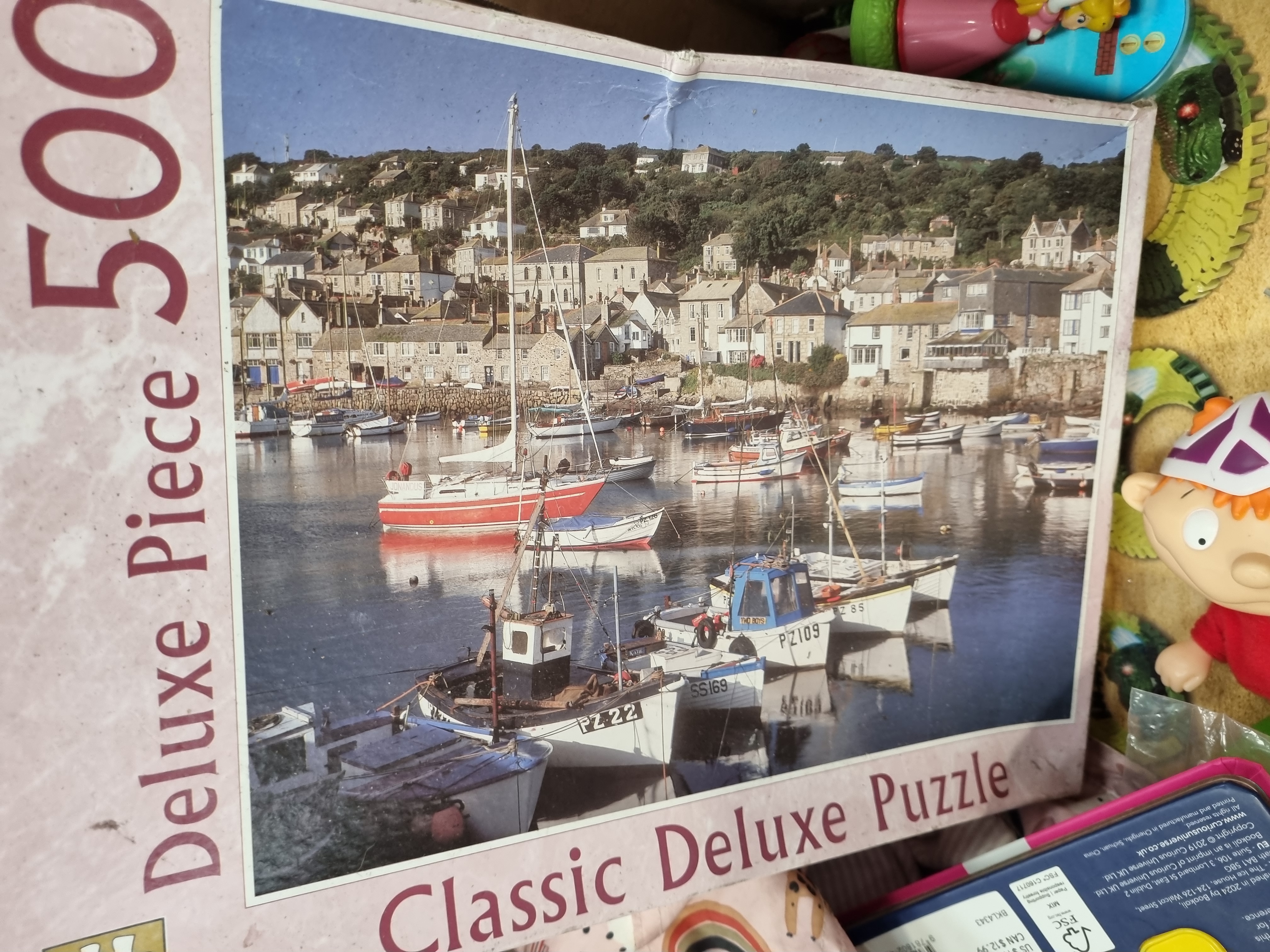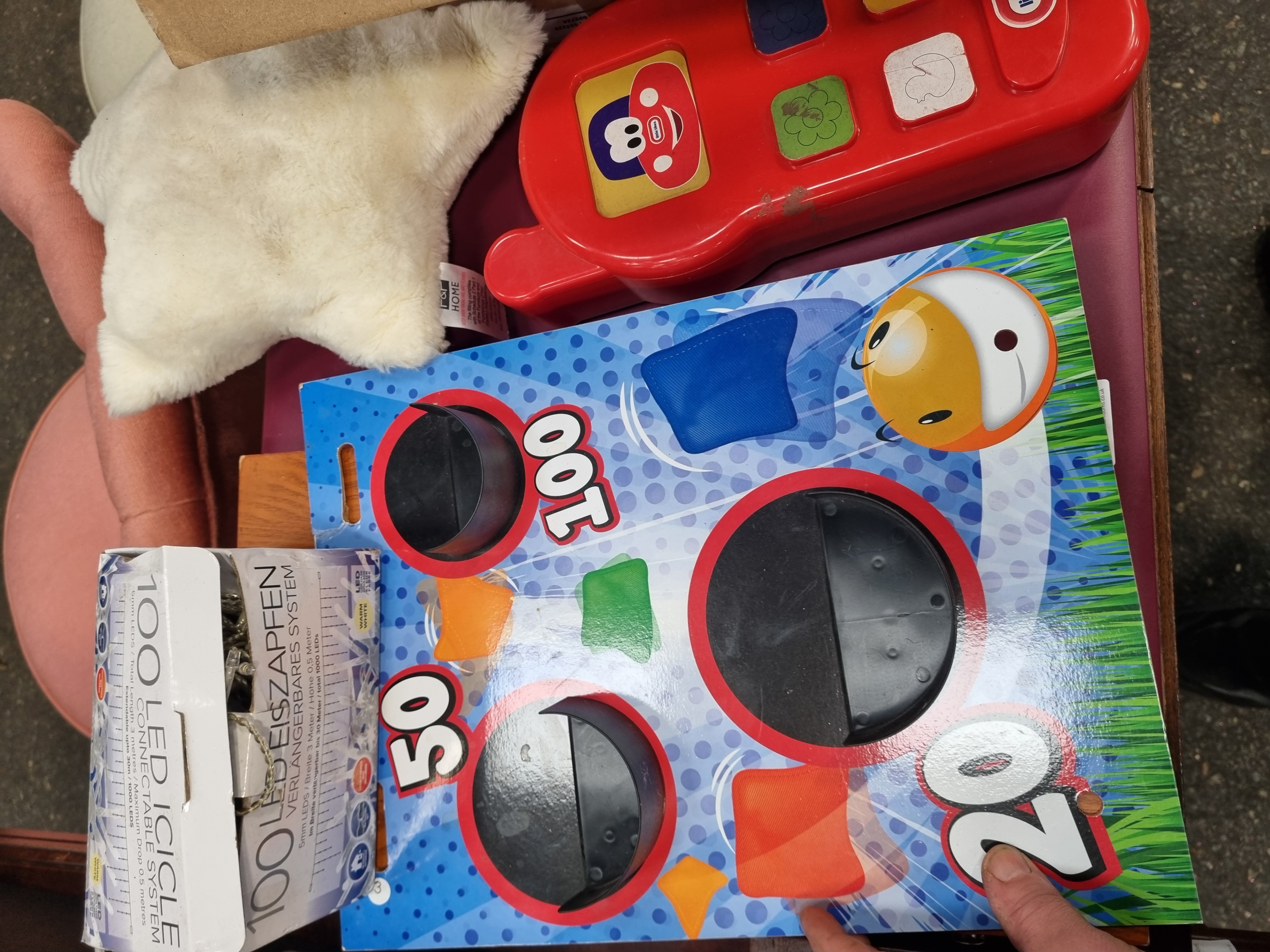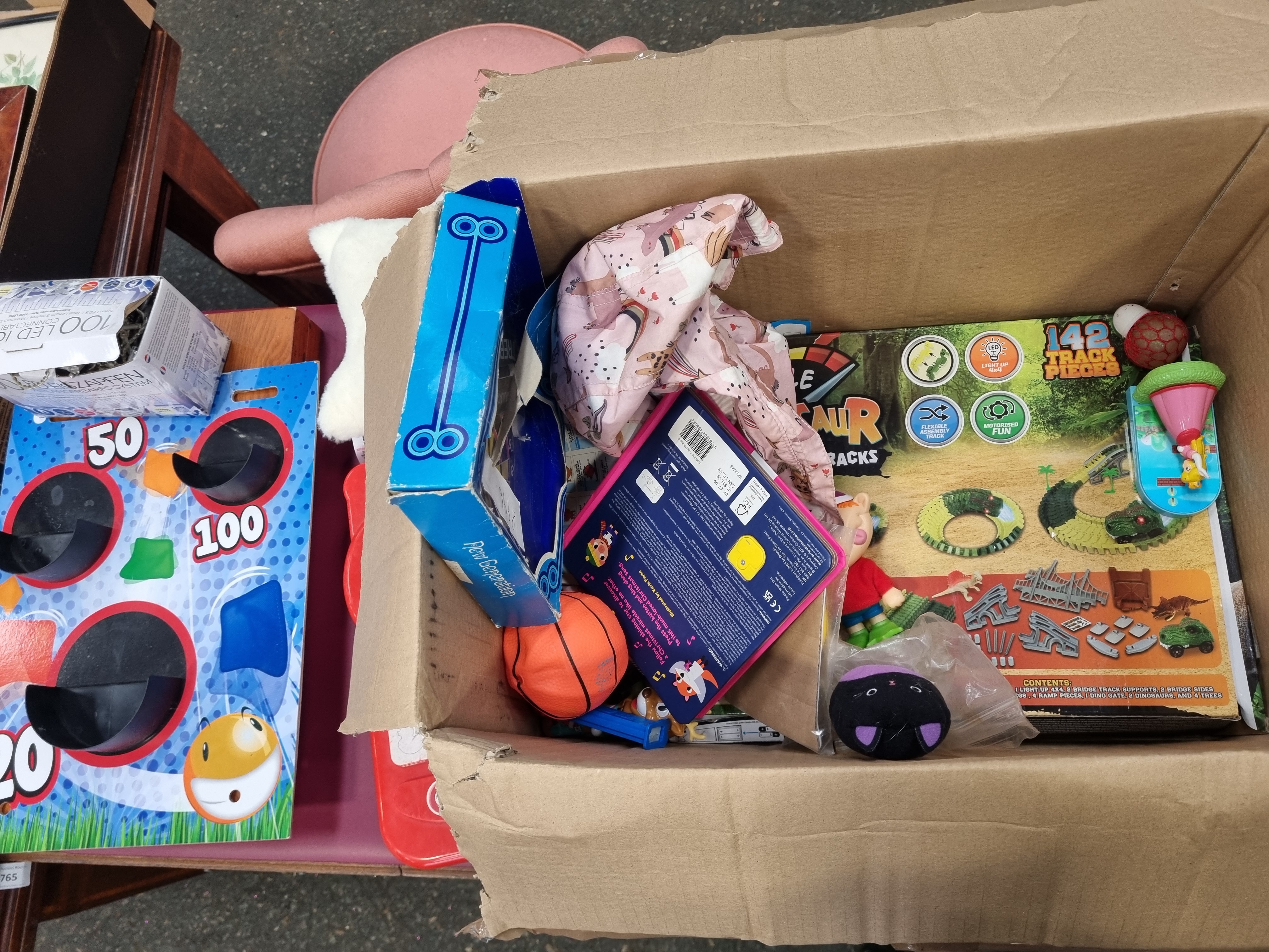 This collection comprises an assortment of childrens toys, games, and associated items. Boxed sets include a Flexible Dinosaur Adventure Tracks set containing 142 pieces, a Chad Valley Be U Sticker Machine with templates and rolls, and a Bookoli 500-piece Classic Deluxe jigsaw puzzle featuring a harbour scene with vessels marked PZ 22, PZ 109, and SS 169. Also included is a box of F&F Home 100 LED warm white icicle lights. Notable loose items include a red Little Tikes plastic handheld activity toy, a pair of black Spy Gear toy binoculars, and a printed cardboard bean bag target game. The lot further includes a Play Generation branded box, a small basketball-style toy, two plush items including a white star by F&F Home and a black and purple cat, a plastic container of assorted crayons, and various small plastic figurines and accessories. The items are primarily constructed from moulded plastic, printed cardboard, and synthetic fabrics.