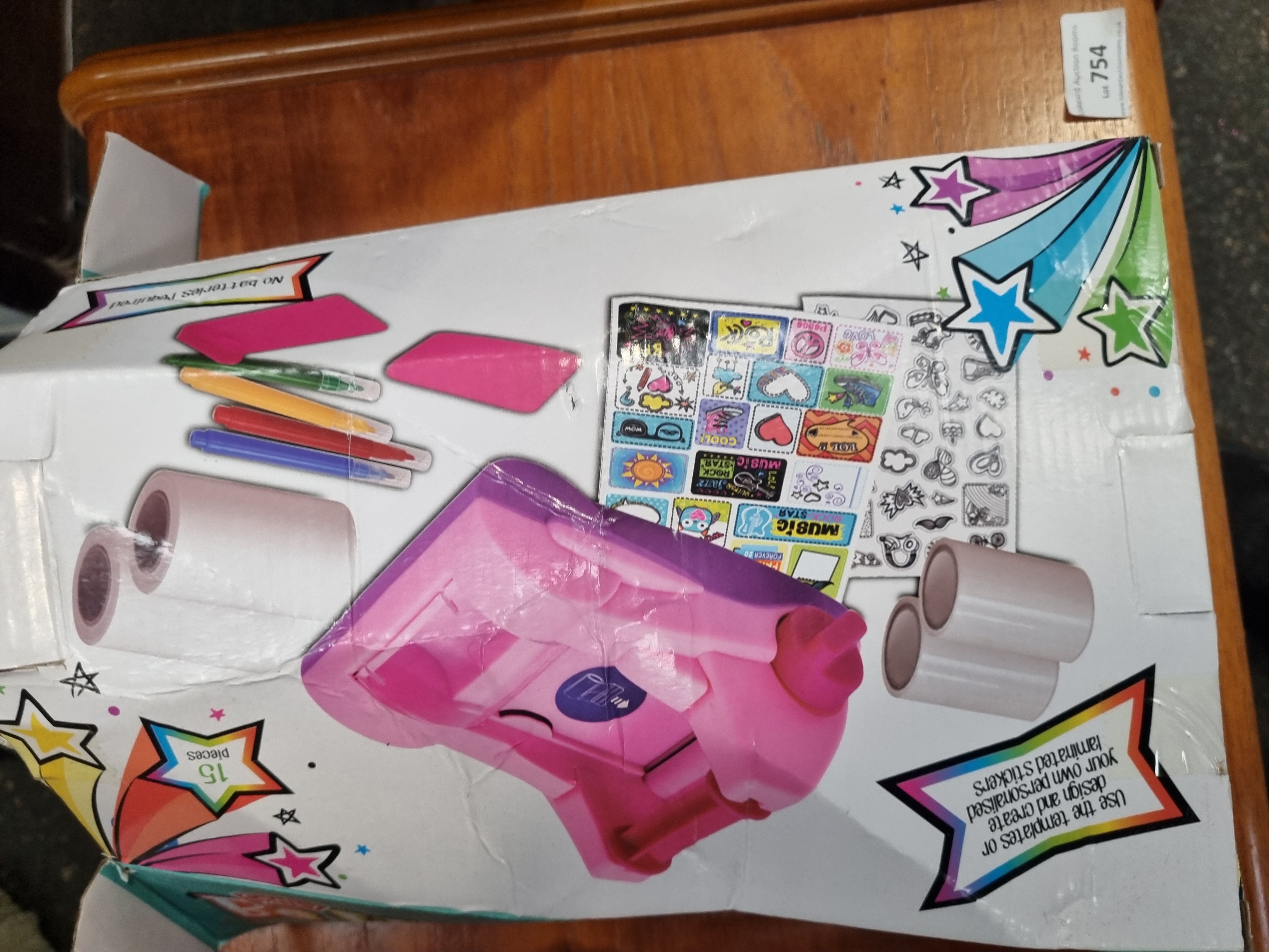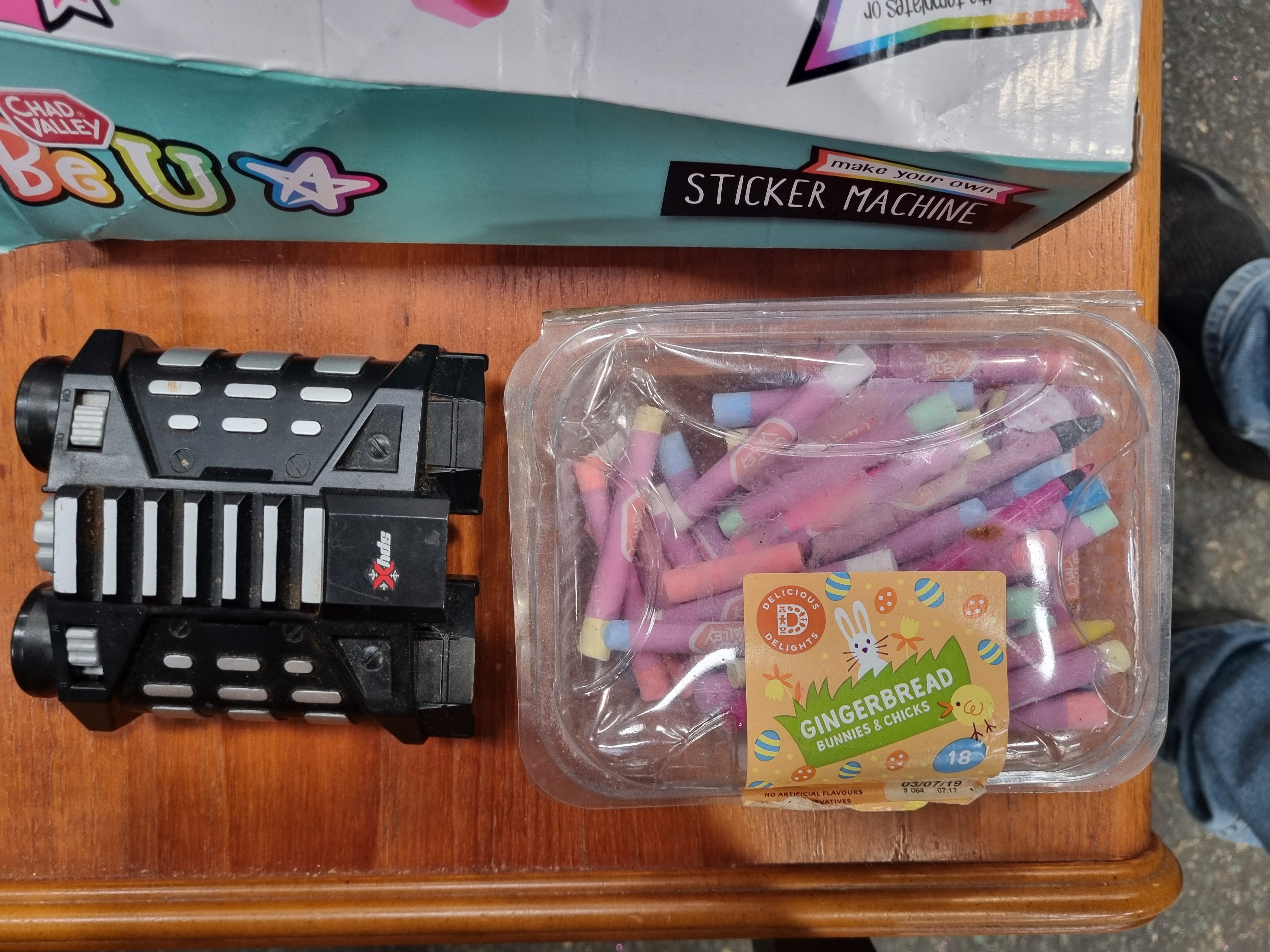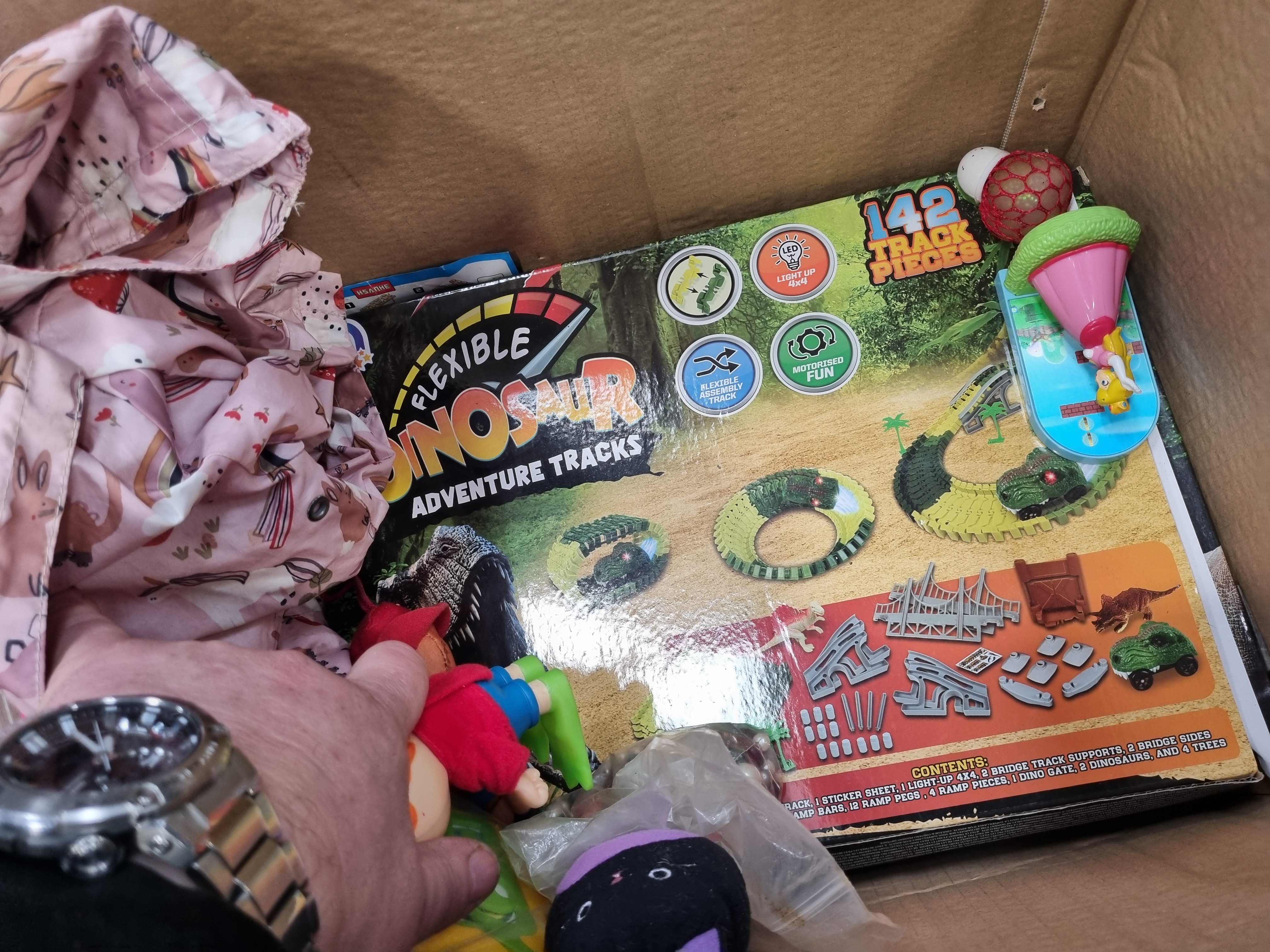 This collection comprises an assortment of childrens toys, games, and associated items. Boxed sets include a Flexible Dinosaur Adventure Tracks set containing 142 pieces, a Chad Valley Be U Sticker Machine with templates and rolls, and a Bookoli 500-piece Classic Deluxe jigsaw puzzle featuring a harbour scene with vessels marked PZ 22, PZ 109, and SS 169. Also included is a box of F&F Home 100 LED warm white icicle lights. Notable loose items include a red Little Tikes plastic handheld activity toy, a pair of black Spy Gear toy binoculars, and a printed cardboard bean bag target game. The lot further includes a Play Generation branded box, a small basketball-style toy, two plush items including a white star by F&F Home and a black and purple cat, a plastic container of assorted crayons, and various small plastic figurines and accessories. The items are primarily constructed from moulded plastic, printed cardboard, and synthetic fabrics.