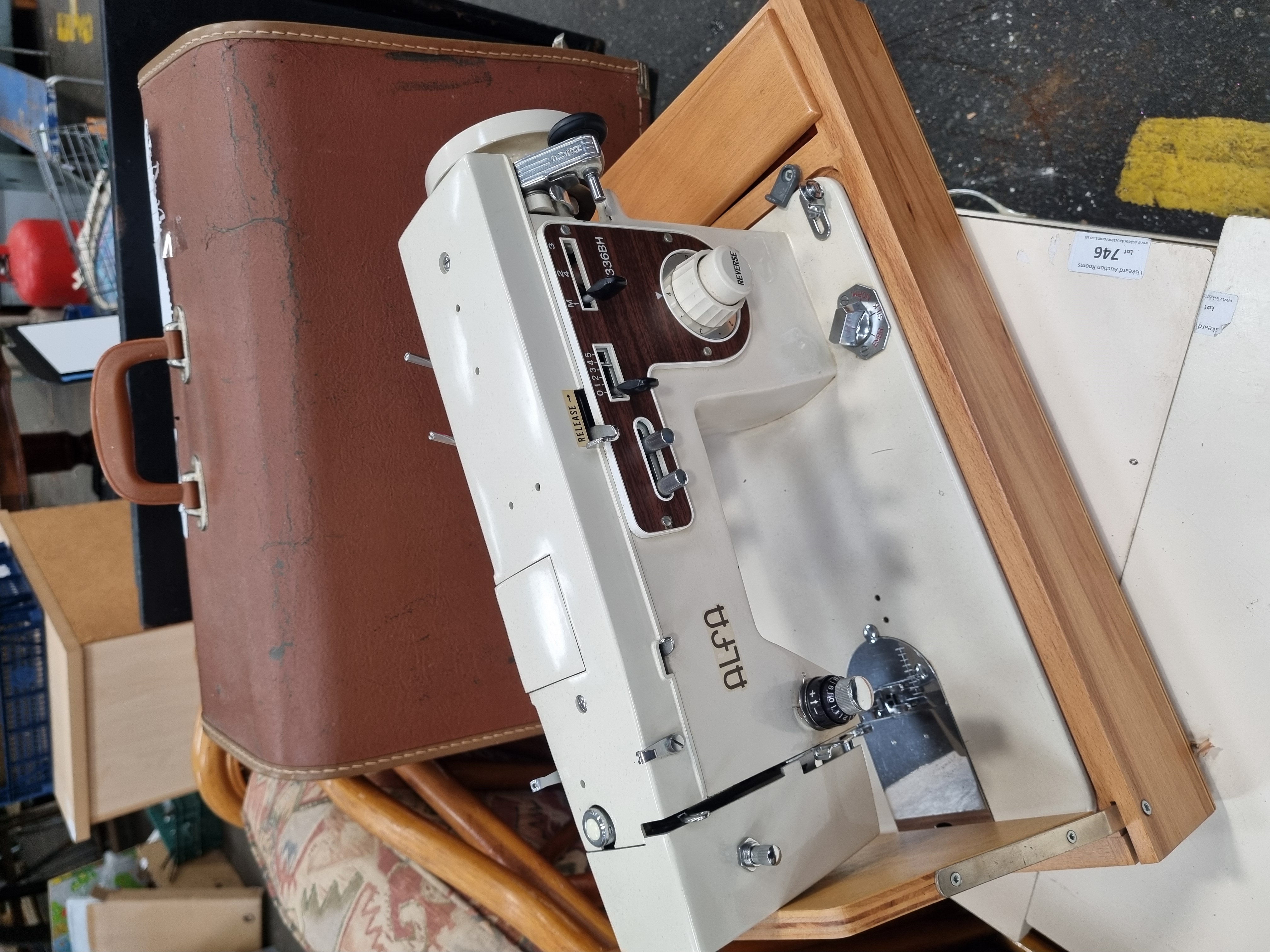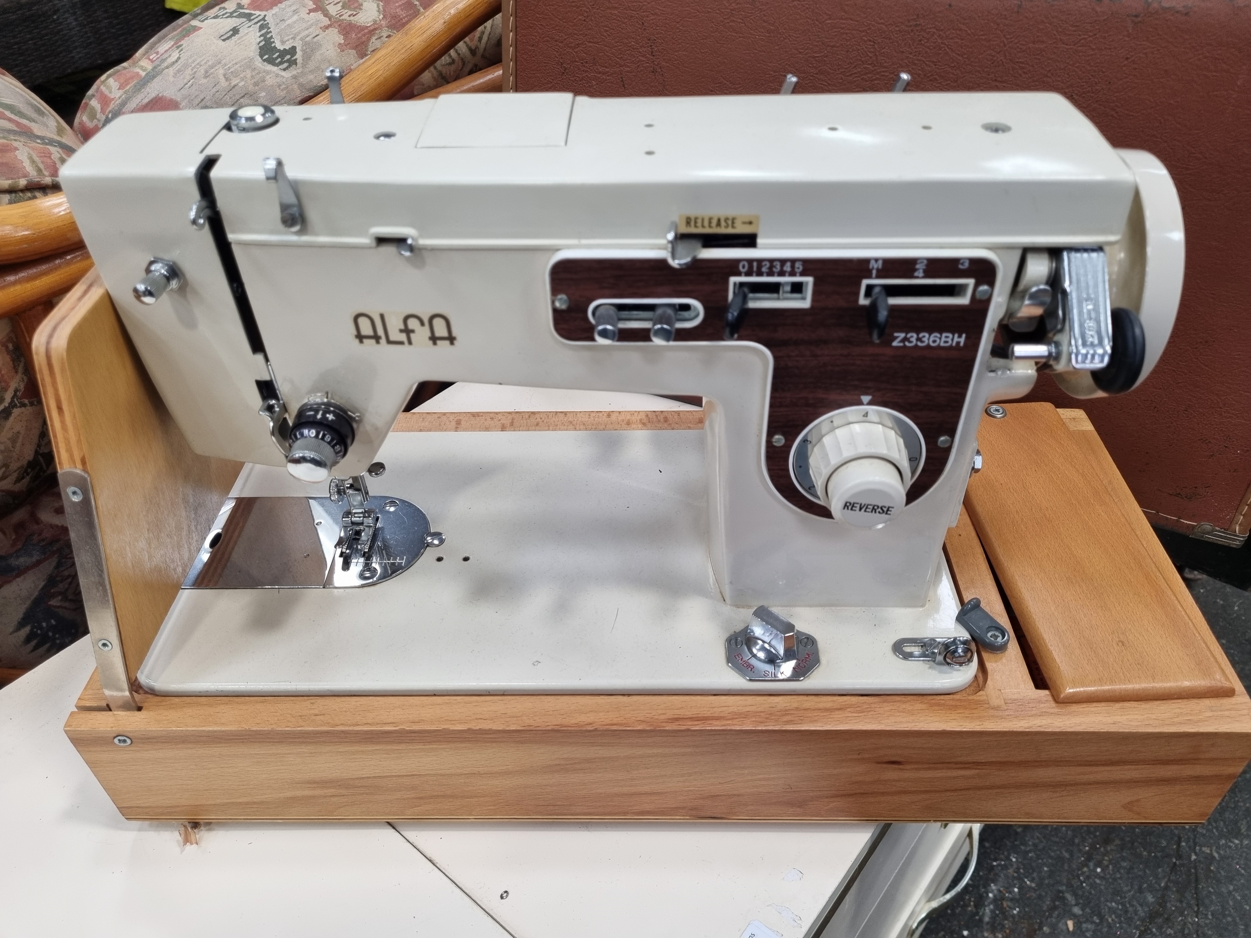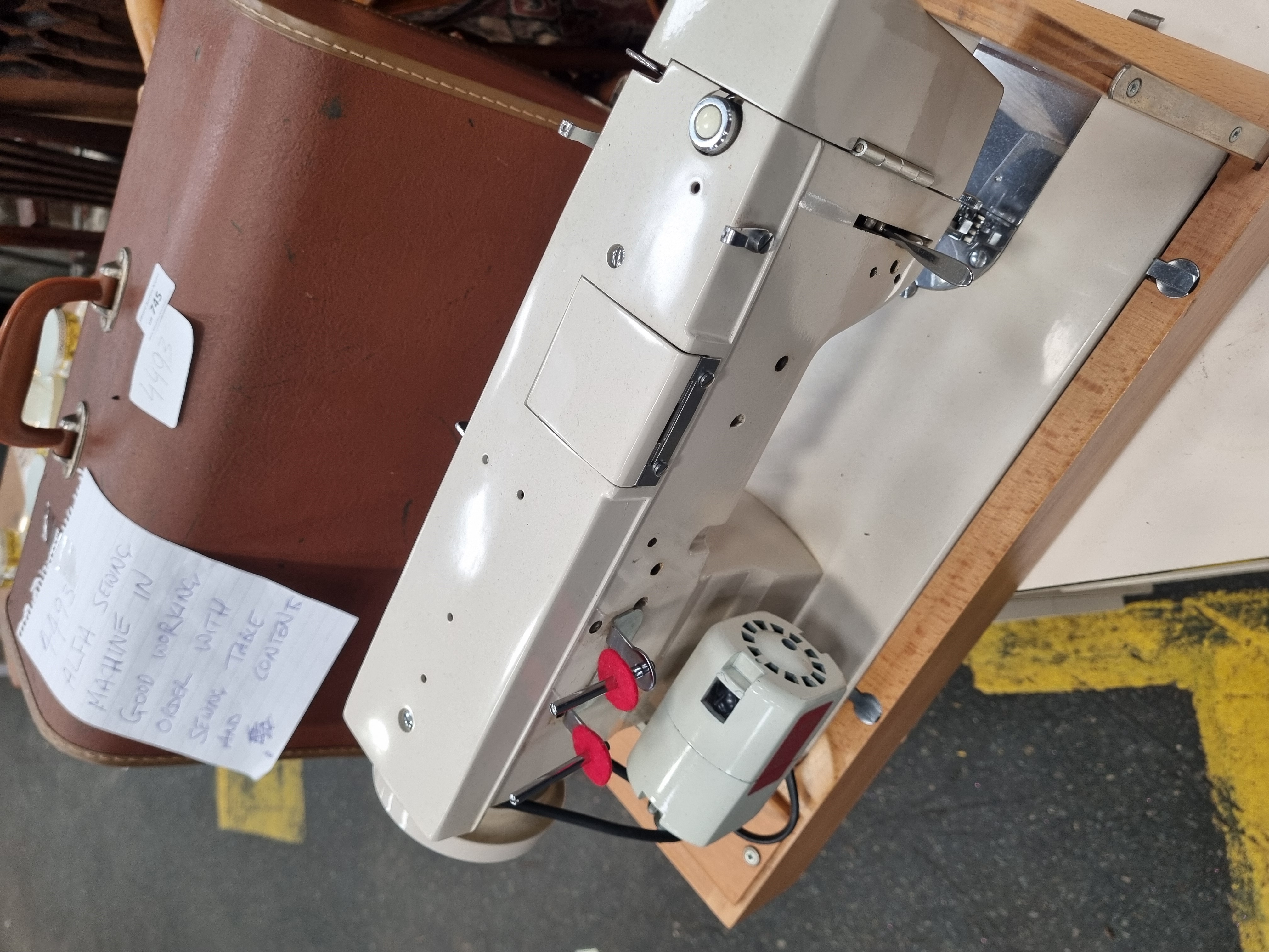 Lot 756: An Alfa Z336BH Sewing Machine with Case and a Singer Sewing Table