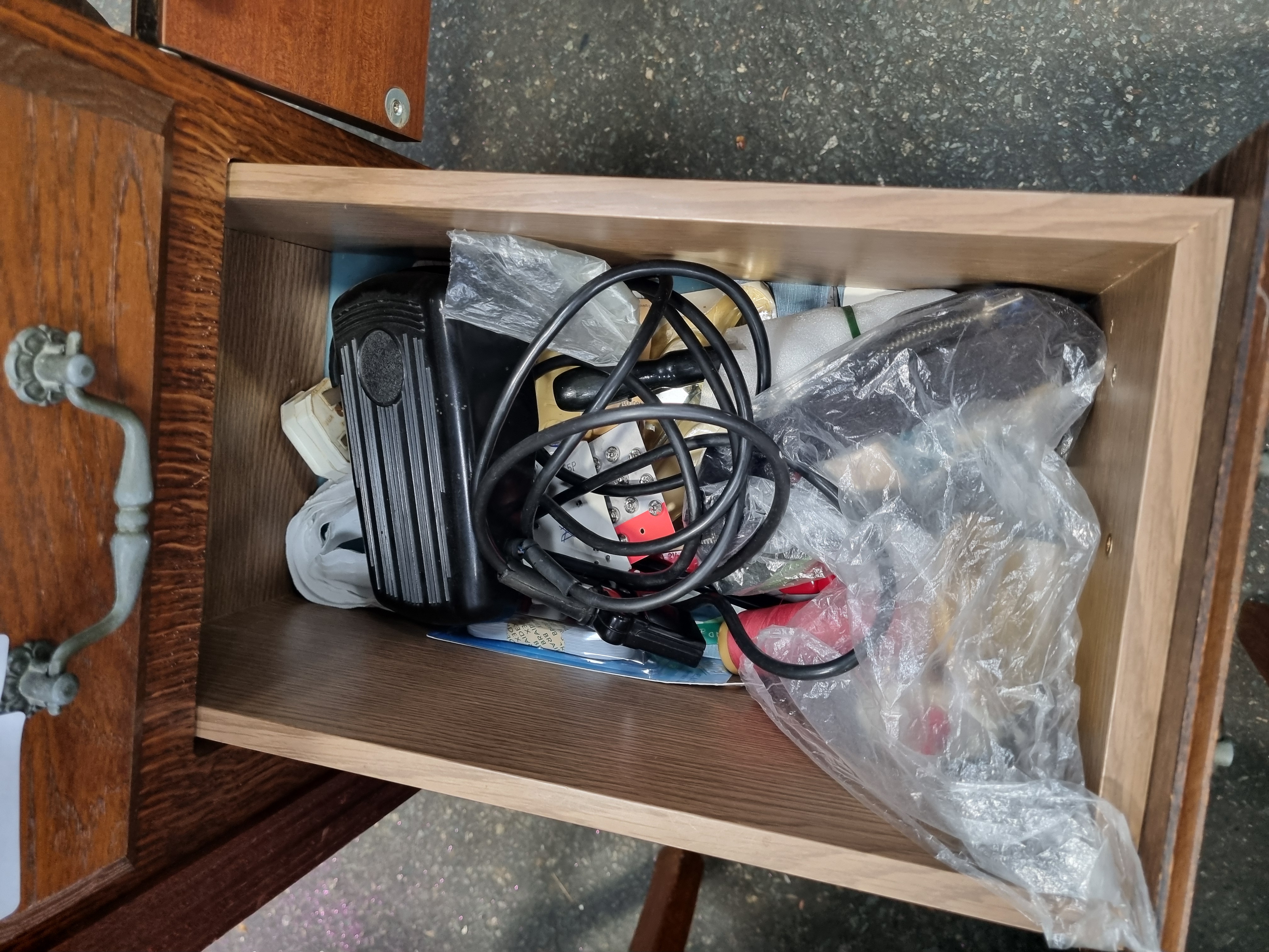 A vintage Alfa Z336BH electric zig-zag sewing machine and an associated Singer sewing table. The machine features a cream-coloured metal body with a wood-grain effect decorative panel, an external motor with belt drive, and a two-spool pin setup. Control interfaces include a reverse stitch dial and selectors for stitch width and pattern, with a base dial marked for Silk, Norm, and Embr. The machine is mounted on a wooden base and is accompanied by a brown textured hard-shell carrying case with a tan handle and metal latches. The sewing table is constructed from wood with a dark brown stain and features a purple leatherette inset top. It is designed with three drawers on the left side fitted with brass-finished bail handles. The central front panel is hinged to reveal a plastic-lined well for the sewing machine and includes an integrated Singer branded ruler. The lot includes a foot pedal and an assortment of sewing accessories including thread spools, bobbins, and marking chalk.