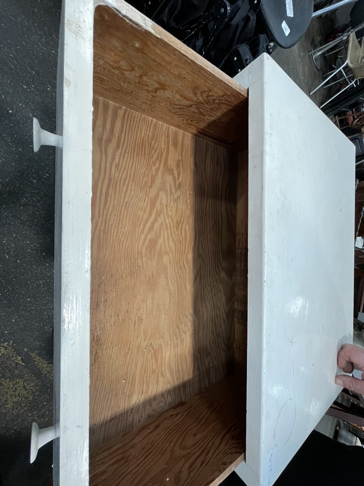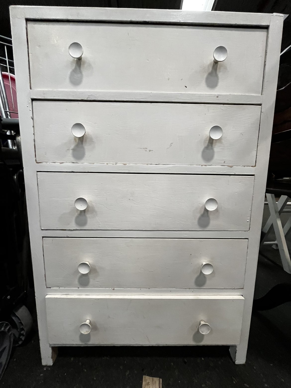 A mid-20th-century chest of drawers of simple, functional design. The tallboy configuration comprises five full-width drawers with flat fronts. The exterior is currently finished in a heavy white paint. Internal drawer components, including sides and bottoms, are constructed from plywood with a prominent grain, and the drawers are assembled using nailed or stapled joints rather than traditional dovetails. The back of the carcass is formed of five vertical solid wood planks with a dark brown stain. The unit is fitted with ten flared conical knobs, also finished in white, and stands on a slightly recessed plinth base. No manufacturer marks are present; visible labels are temporary auction house lotting tags.