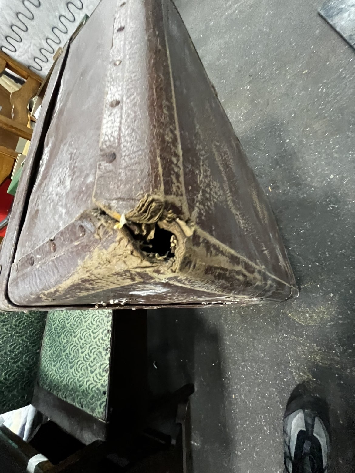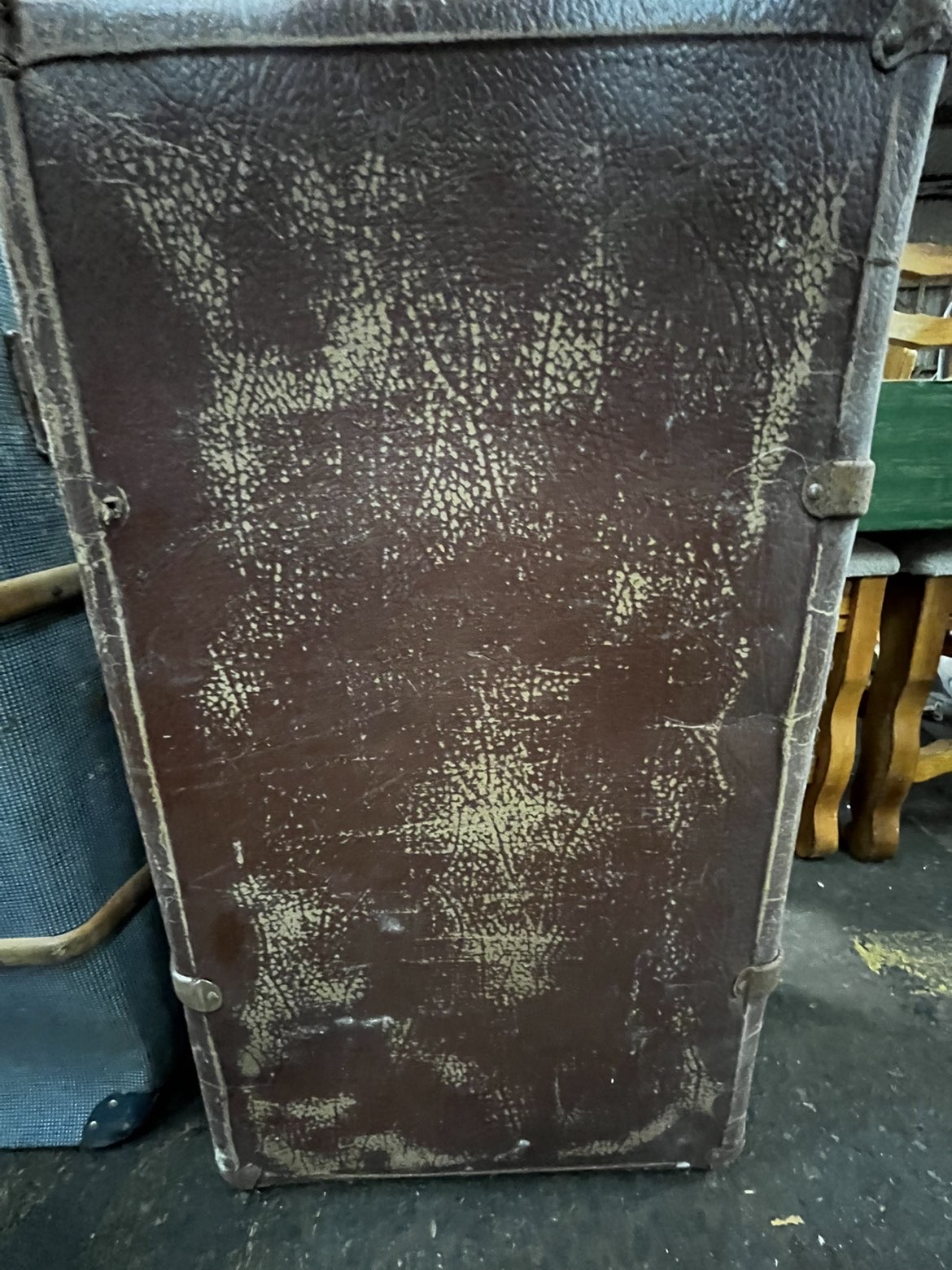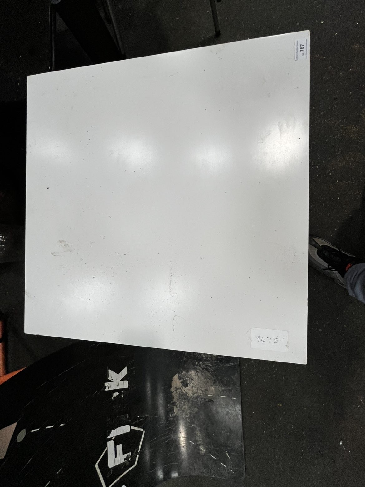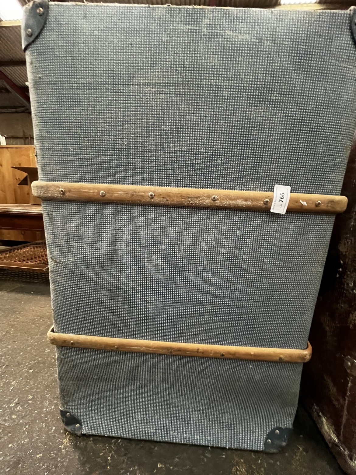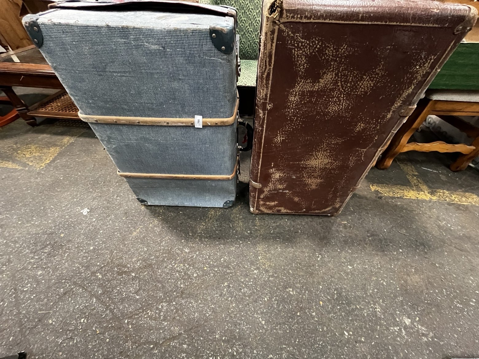 This lot features two vintage travelling trunks and a separate square white panel. The first trunk is constructed with a brown textured exterior, likely vulcanised fibre or leather, featuring metal hasps and protective corner pieces. The second trunk is covered in a blue and white chequered fabric and is reinforced with horizontal wooden slats secured by metal rivets. This piece includes blue metal corner protectors and carries a white auction tag for Lot 766. The third item is a square white panel, possibly a shelf or display board, which bears a Lot 767 tag and a sticker numbered 9475. No manufacturer names or maker’s marks were identified during inspection.