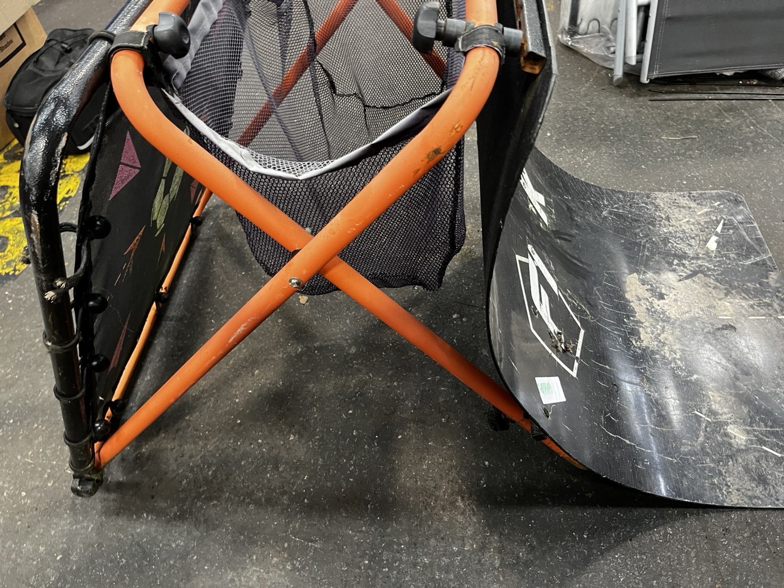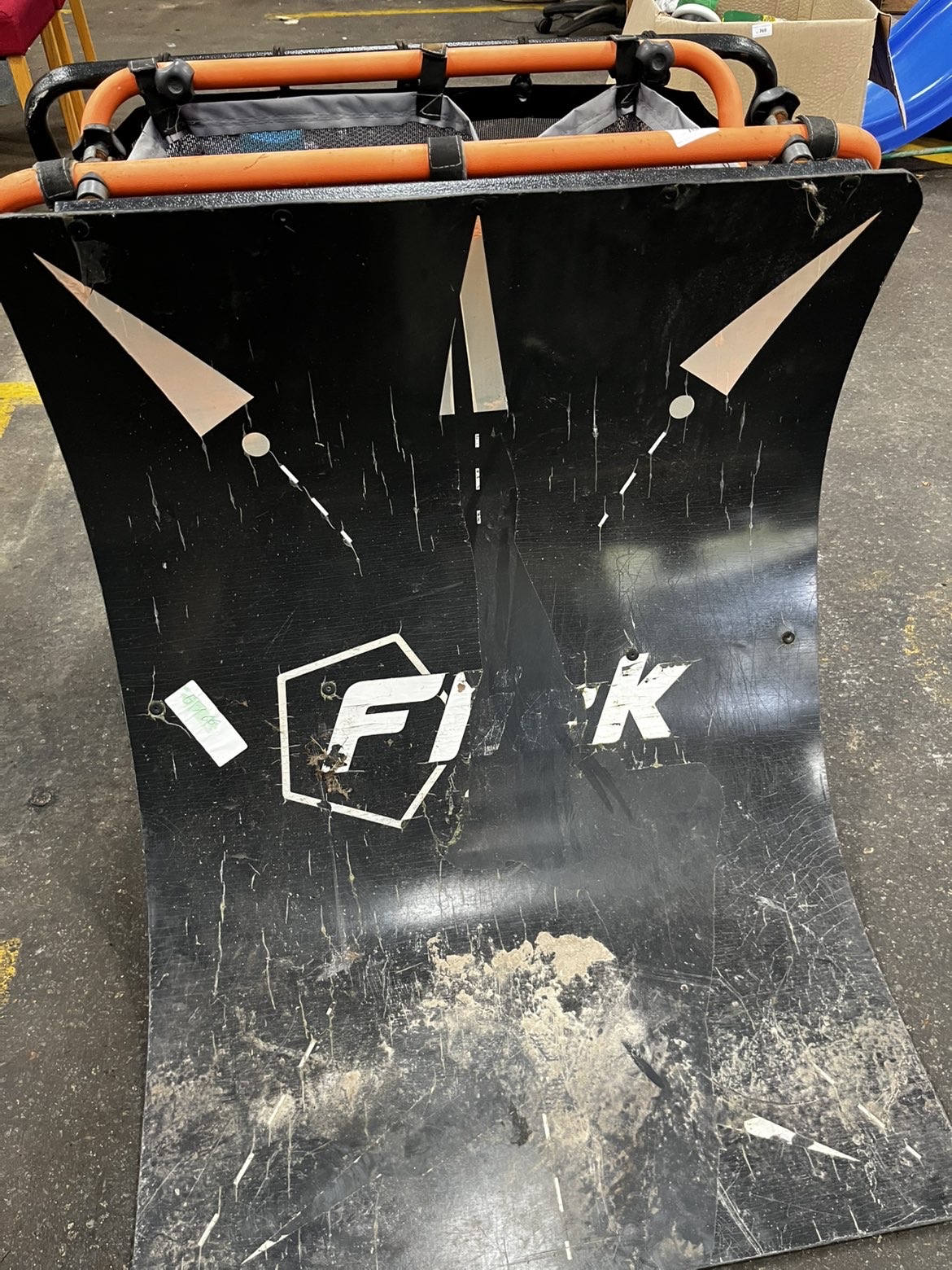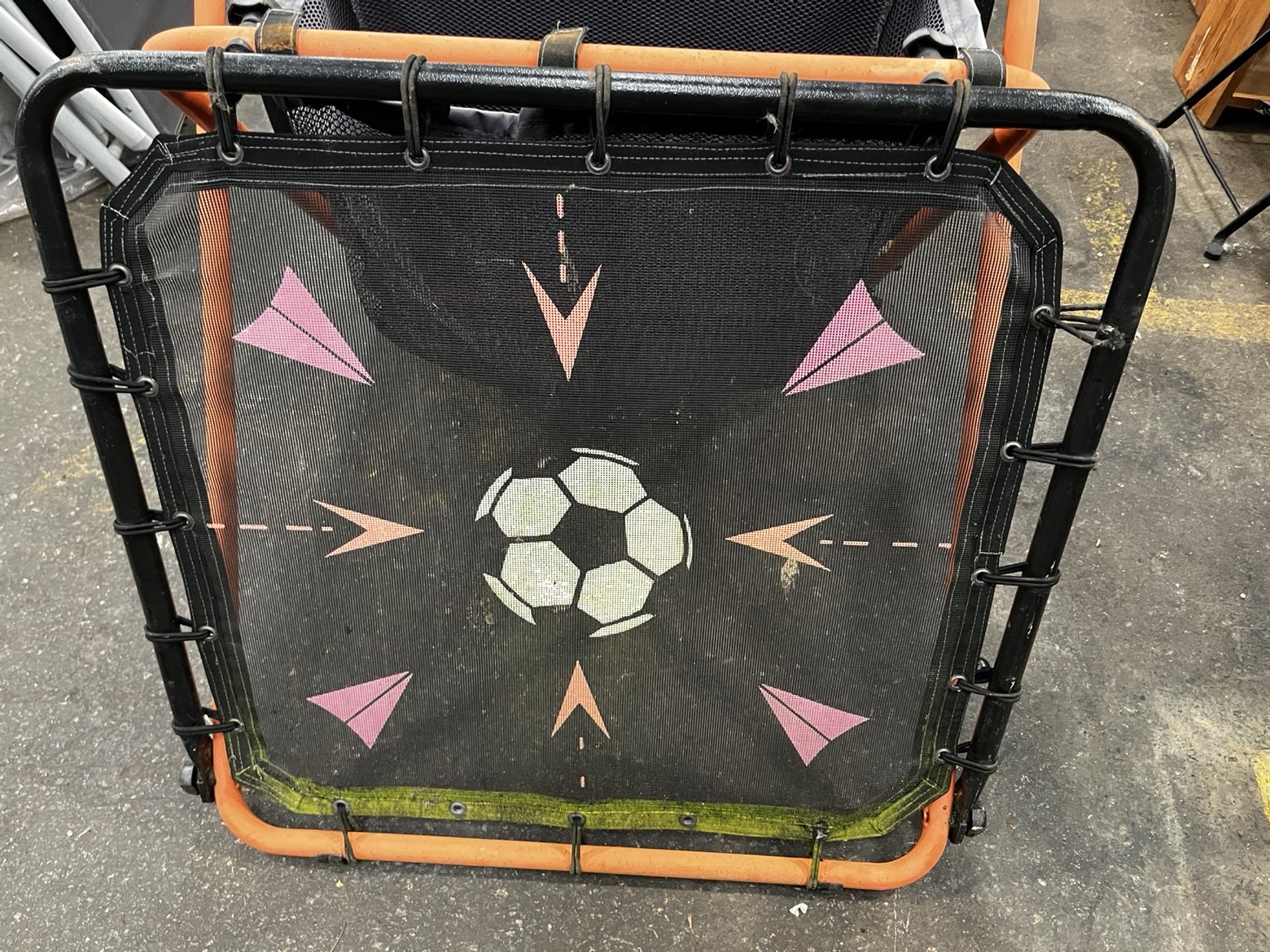 A multi-functional football training aid by the brand Football Flick. The item features a foldable orange-painted metal frame that supports three distinct training components. On one side is a black mesh rebounder net tensioned by bungee cords, decorated with a white football graphic and directional arrows in pink and orange. The opposite side consists of a curved black plastic ramp designed for ball return and passing drills. A central grey mesh basket is suspended within the frame to serve as a target for lobbing or for ball storage. The curved plastic section bears a partial white brand logo. The frame includes an adhesive auction label from Liskeard Auction Rooms for lot 768.