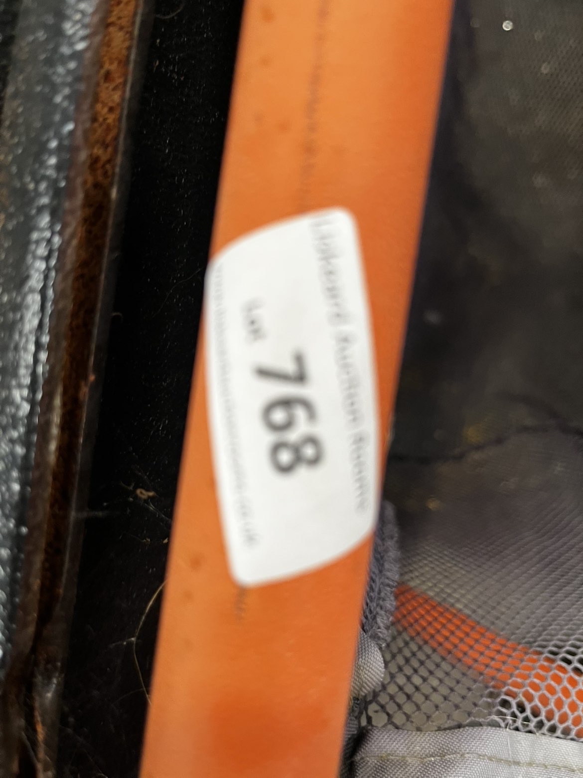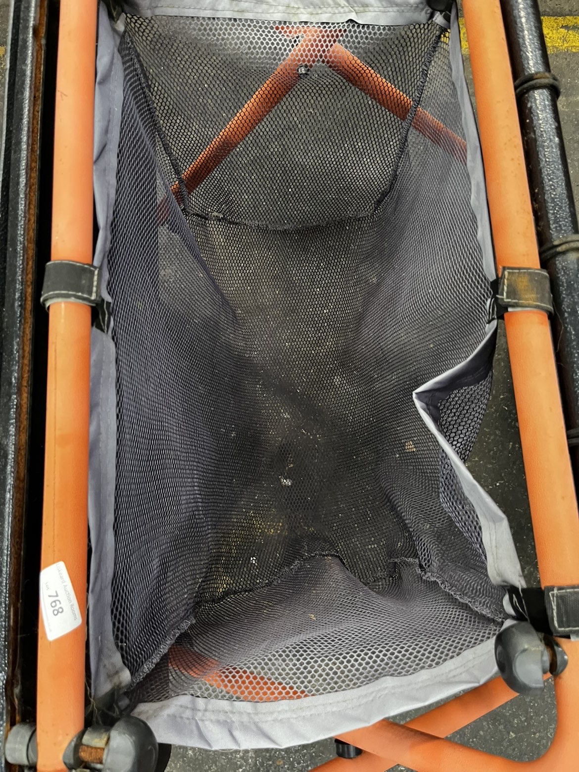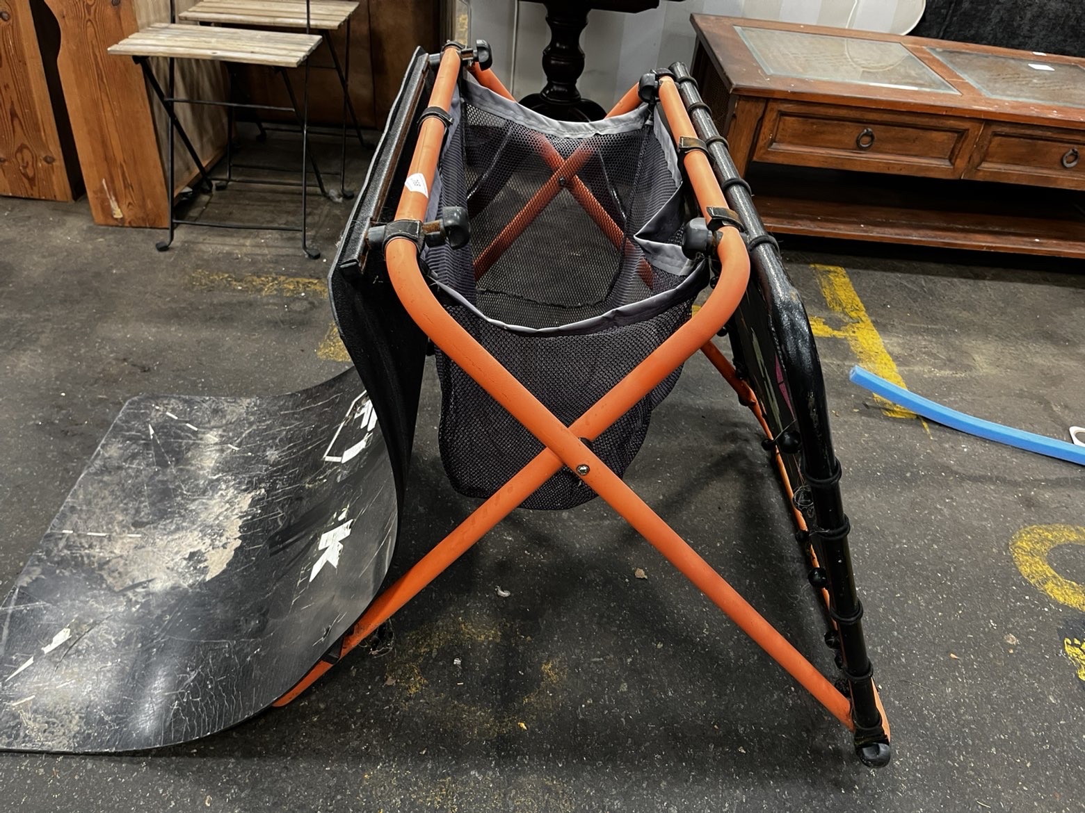 A multi-functional football training aid by the brand Football Flick. The item features a foldable orange-painted metal frame that supports three distinct training components. On one side is a black mesh rebounder net tensioned by bungee cords, decorated with a white football graphic and directional arrows in pink and orange. The opposite side consists of a curved black plastic ramp designed for ball return and passing drills. A central grey mesh basket is suspended within the frame to serve as a target for lobbing or for ball storage. The curved plastic section bears a partial white brand logo. The frame includes an adhesive auction label from Liskeard Auction Rooms for lot 768.