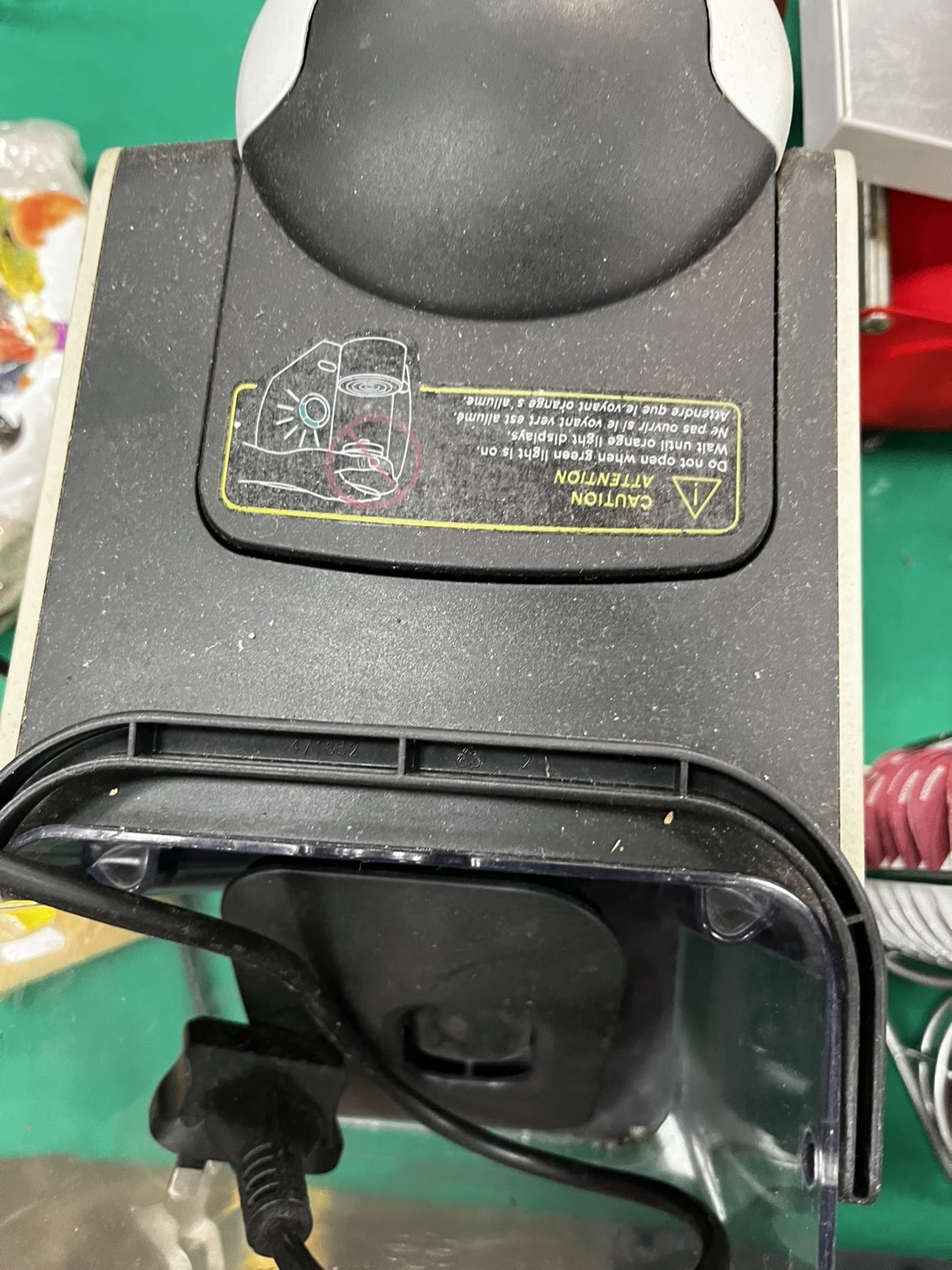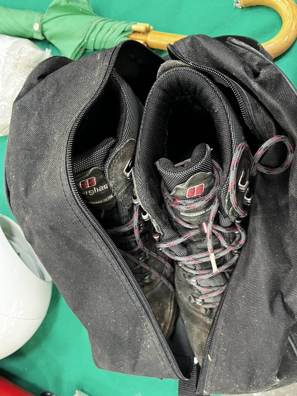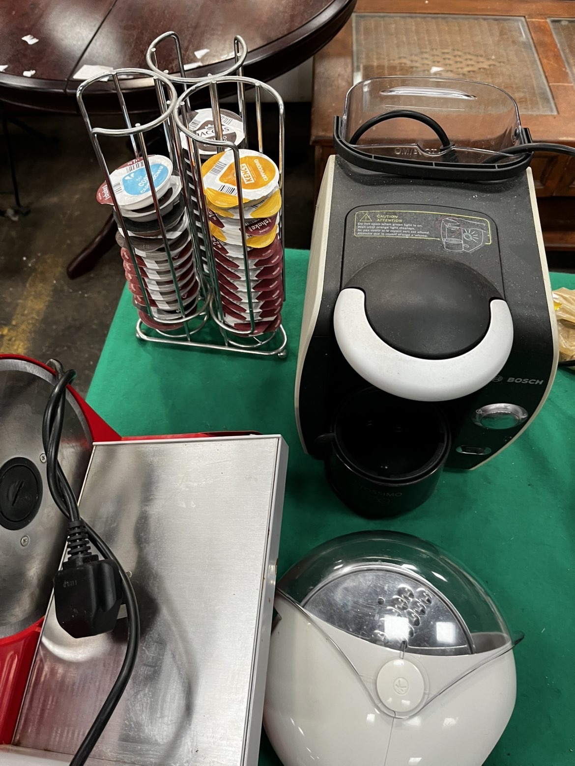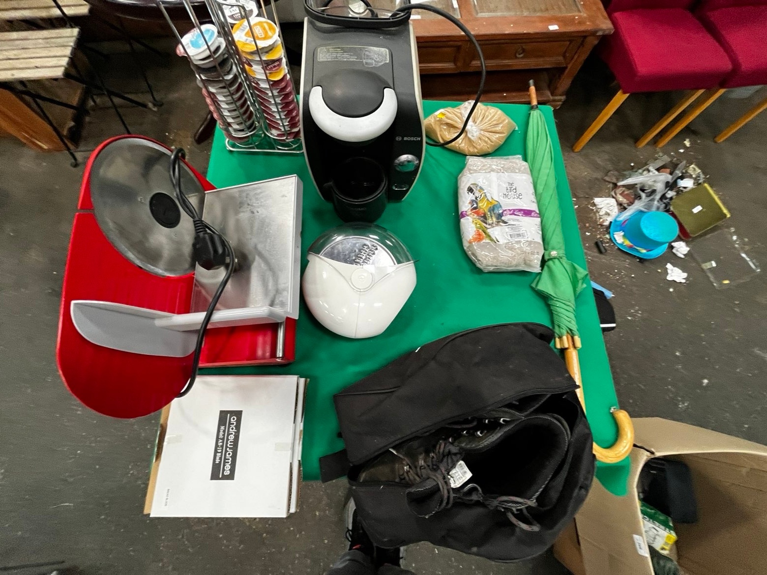 This auction lot comprises an assortment of domestic appliances and outdoor equipment. Featured is a Bosch Tassimo pod-based coffee machine, finished in black and white, accompanied by two chrome-plated wire rotating pod holders containing a variety of coffee and milk capsules. The lot includes a red and silver Andrew James electric food slicer, which comes with a cardboard box lid for a Model AS-19 Bread Blade. Also present is a white dome-shaped kitchen appliance with a clear plastic lid. For outdoor use, there is a pair of black Berghaus hiking boots, marked as engineered in Italy, stored within a black zippered fabric carry bag. A full-length green umbrella with a wooden shaft and curved handle is included. Miscellaneous items consist of two bags of bird seed from The Bird House and a small blue novelty top hat.