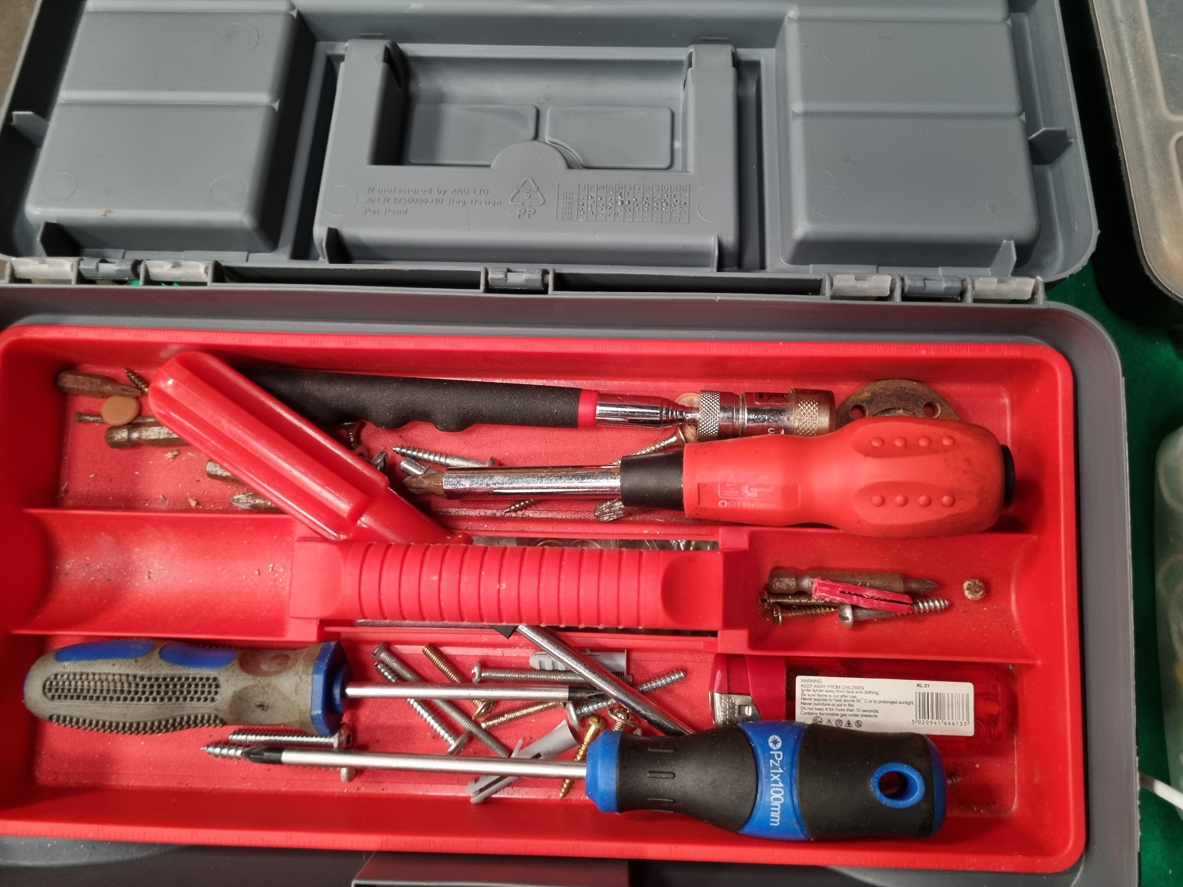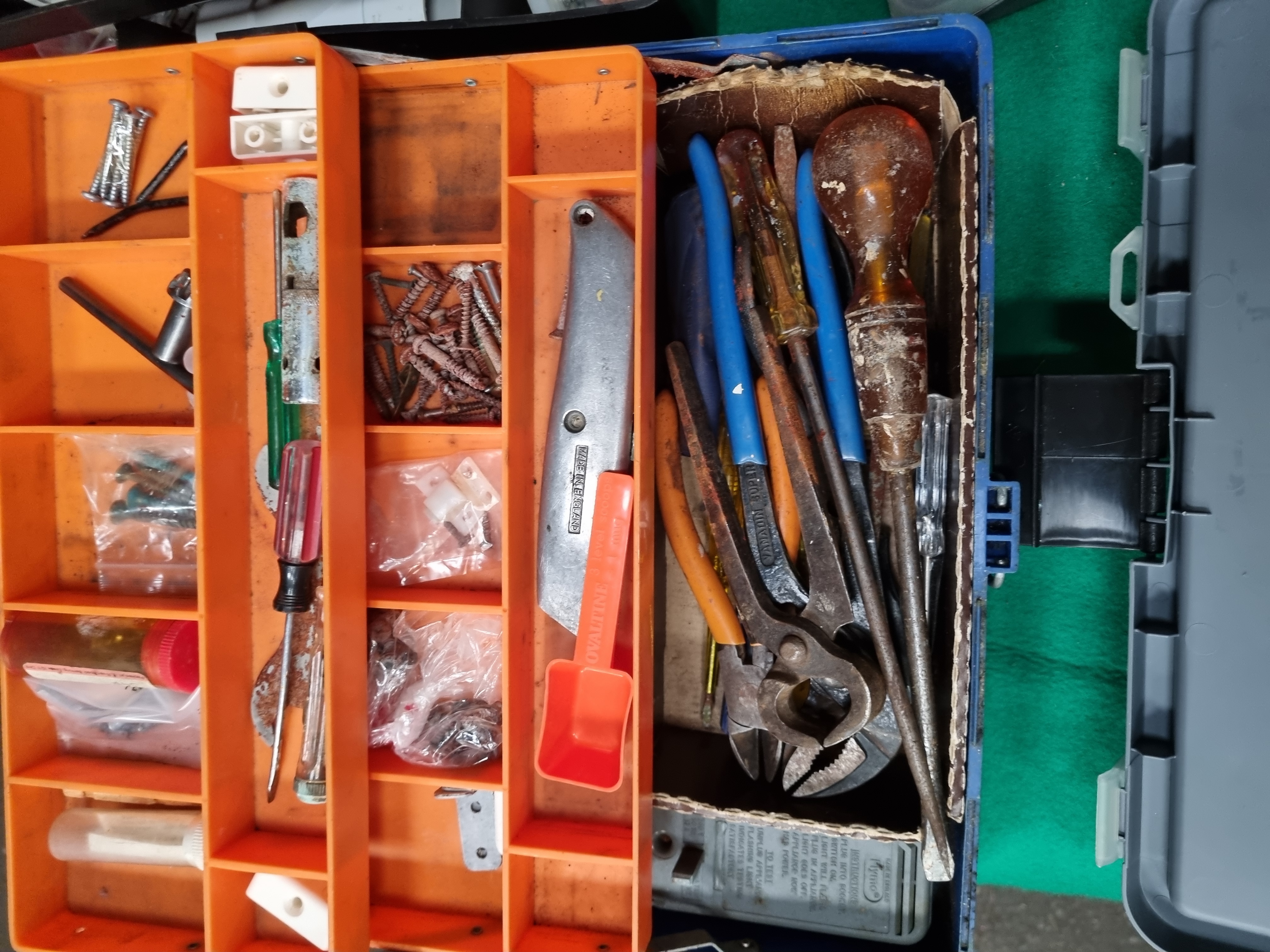 This lot comprises a collection of domestic hand tools and workshop storage solutions. The assortment includes a Mac Allister PTX Universal 15-piece multi-tool accessory set housed in a plastic case. Hand tools feature a metal-bodied retractable utility knife stamped Made in England, various screwdrivers including a blue and black handled example marked Pz1x100mm, and a vintage wooden-handled bradawl. Other tools include pliers and wire cutters. The lot also contains an orange plastic scoop with moulded Ovaltine branding. Storage components include a grey plastic toolbox manufactured by Zag Ltd (Art No 1250000210) and multiple plastic hardware organisers. These organisers contain a quantity of assorted fasteners, including wood screws, machine screws, and plastic wall plugs. Materials used in the construction of these items include tool steel, wood, and various plastics such as polypropylene and high-impact polystyrene.