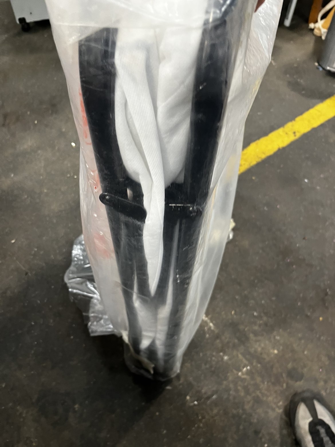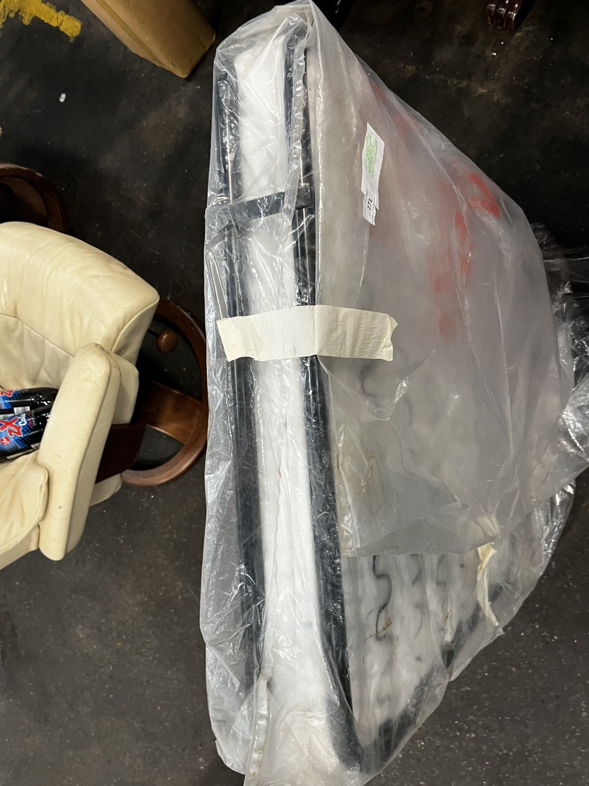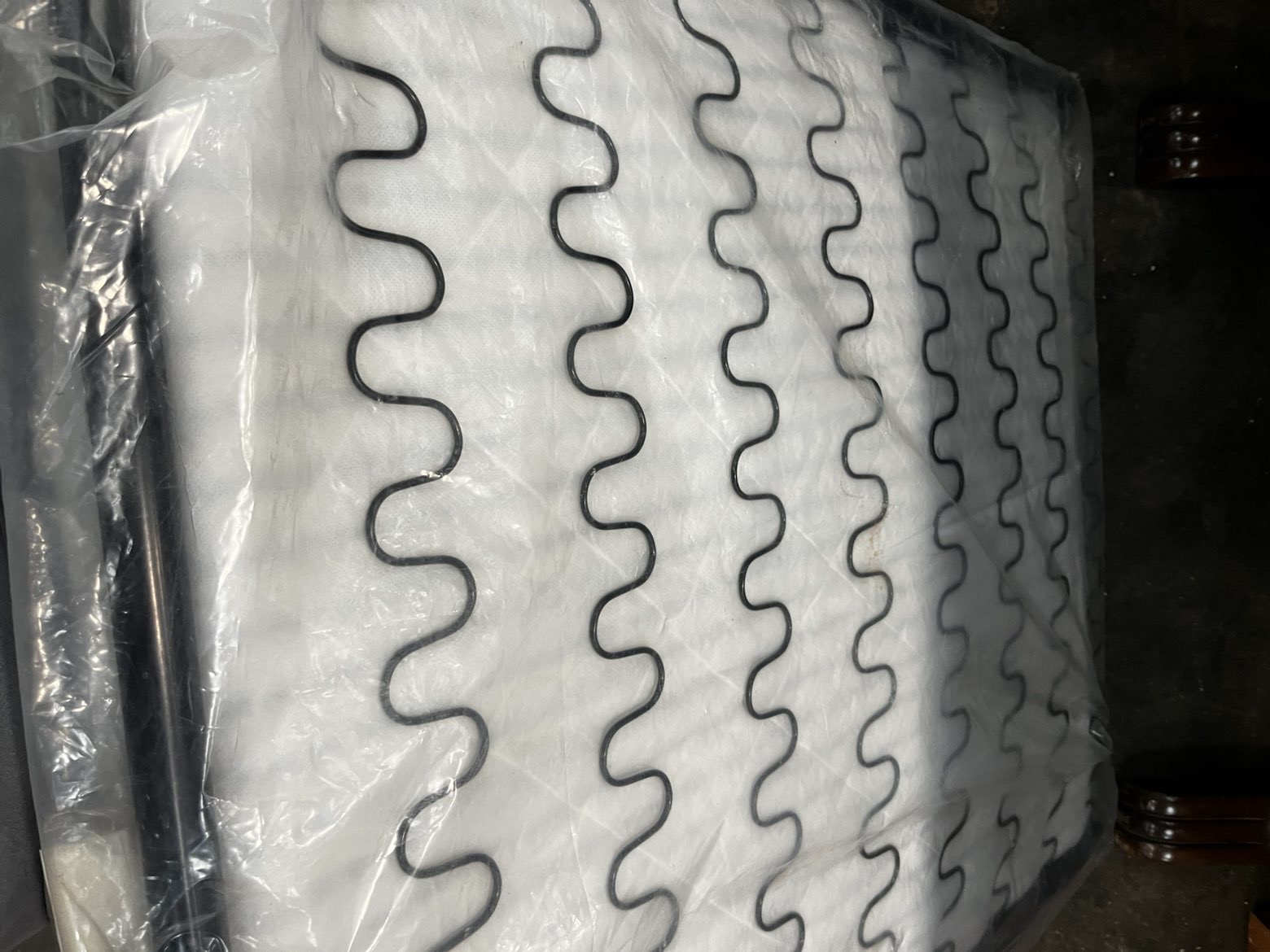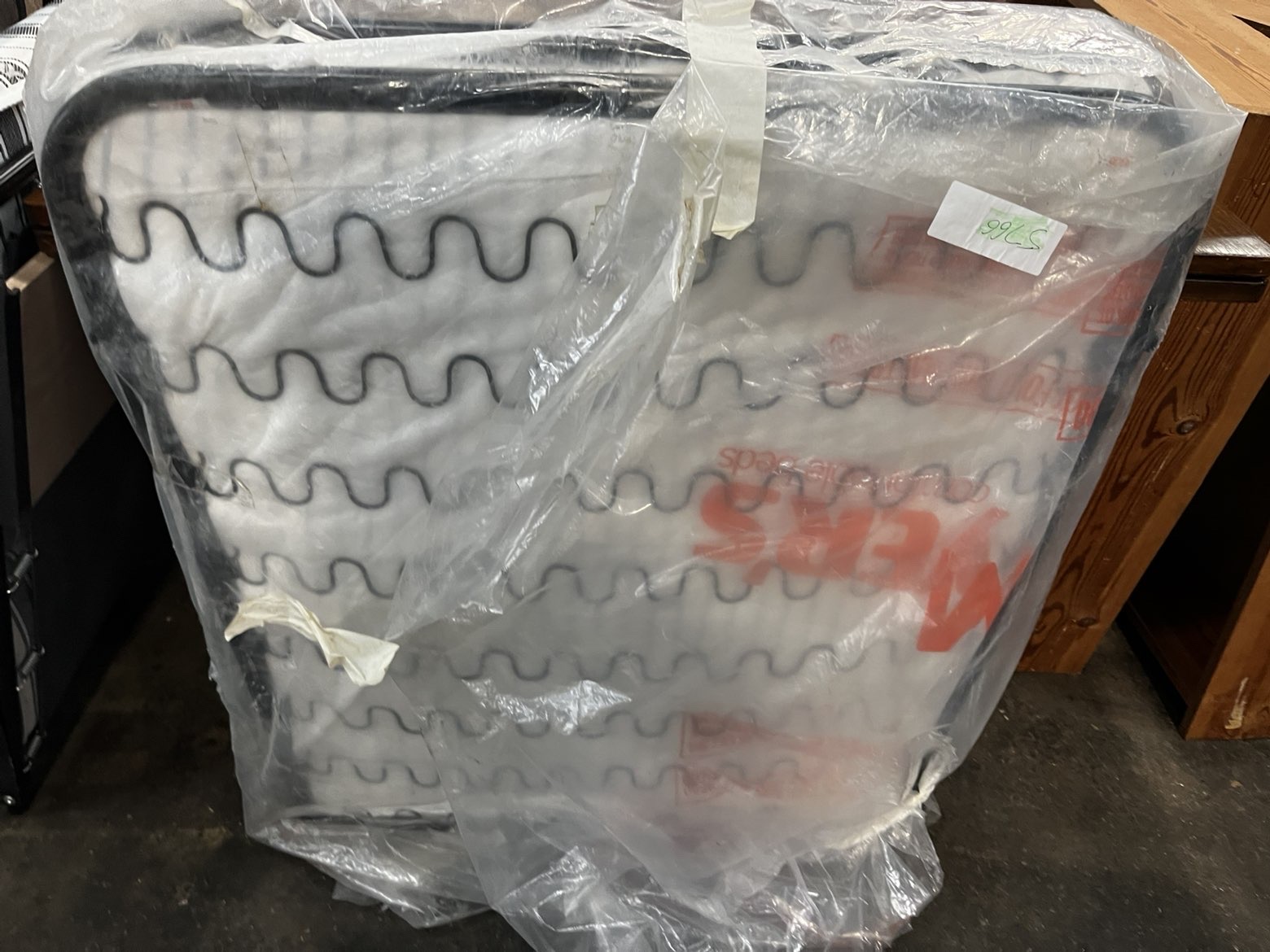 A Myers folding guest bed, commonly known as a Z-bed, featuring a black-coated tubular metal frame. The support base consists of sinuous zig-zag wire springs which hold a white padded mattress. The unit is designed to fold into three sections for ease of storage. The mattress cover and plastic packaging are marked with the red block letter Myers logo above the words comfortable beds.