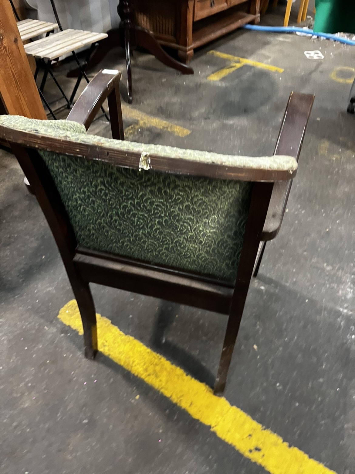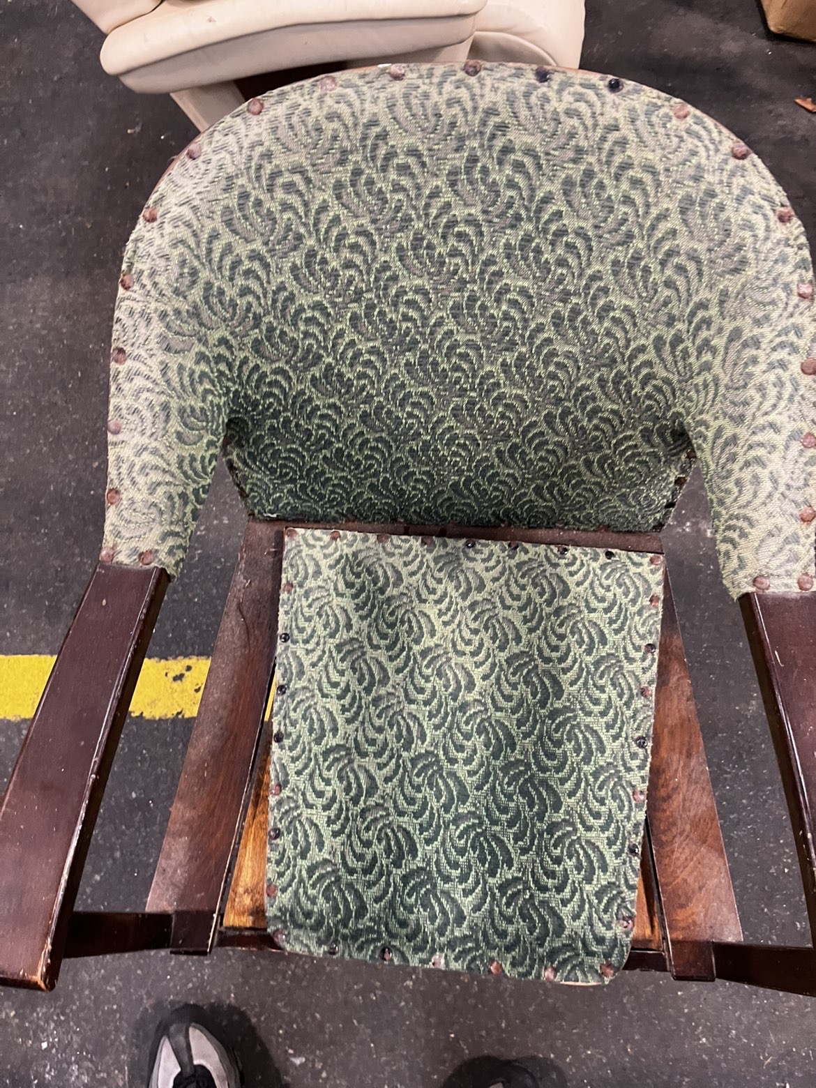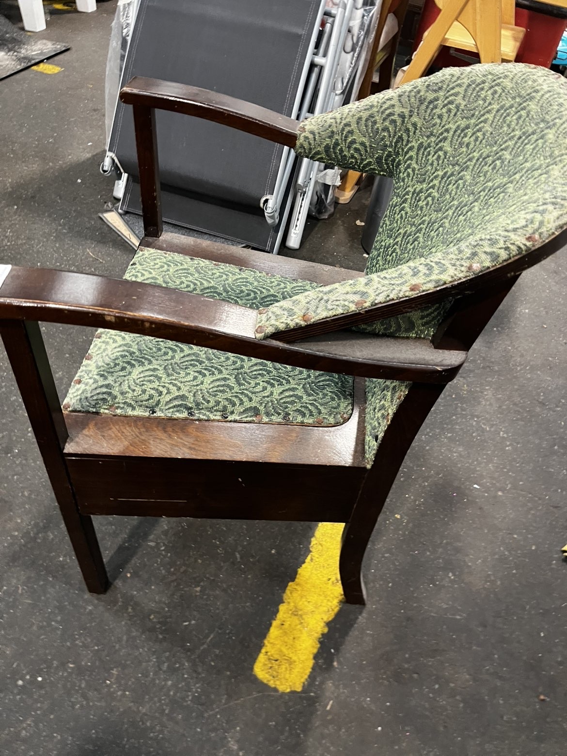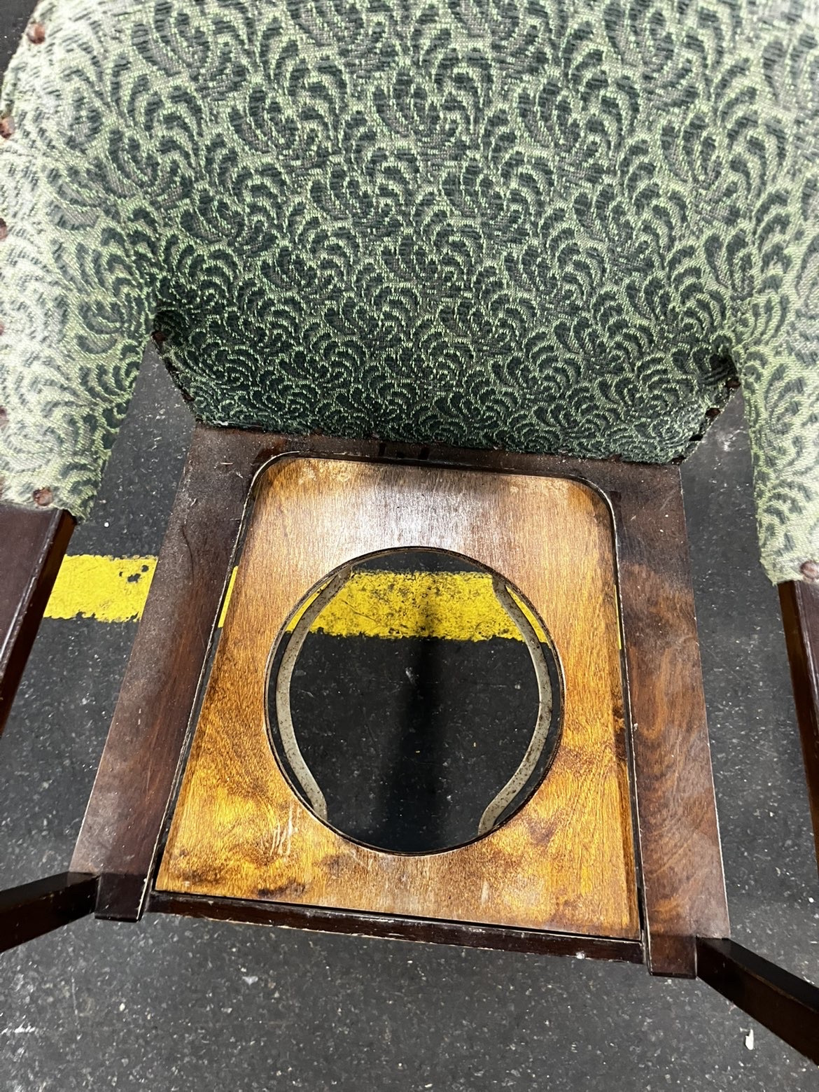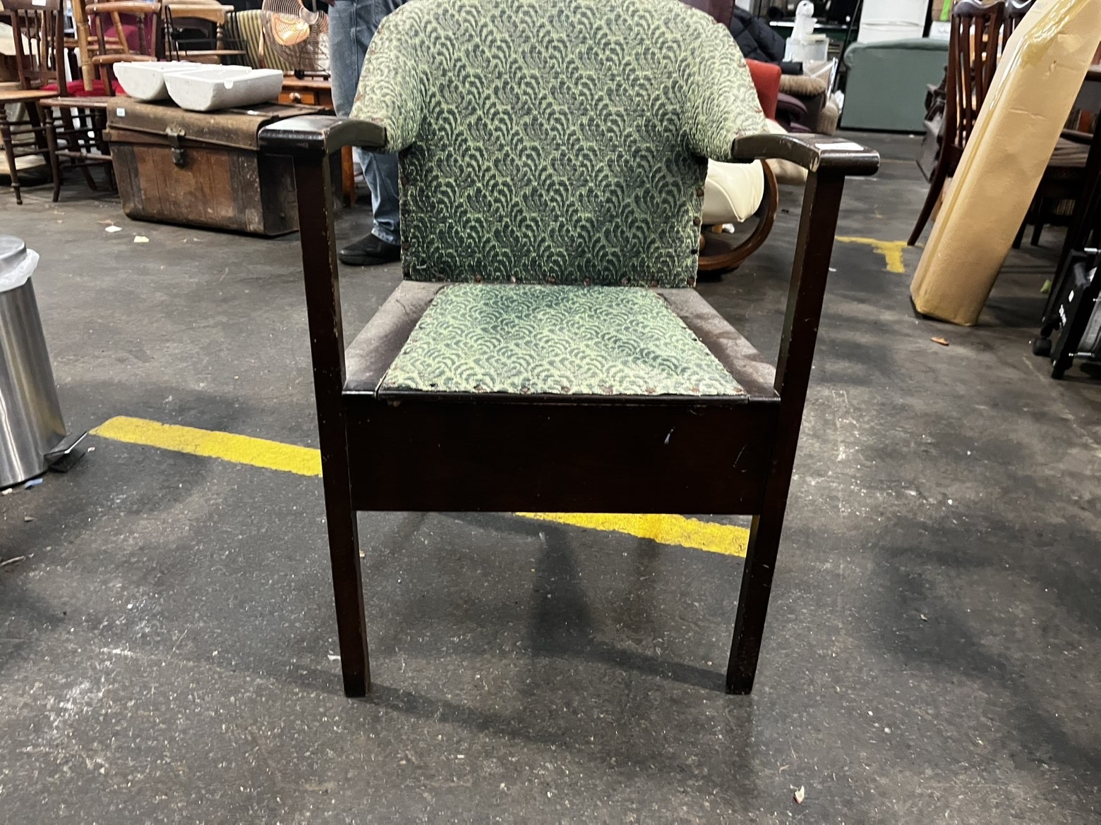 An early to mid-20th century commode armchair of Art Deco influence, constructed from dark-stained solid wood. The chair features a curved, wrap-around backrest and arms, fixed-upholstered in a green and grey textured jacquard fabric with a repeating scrolled pattern, secured to the frame with brass-headed upholstery tacks. The seat consists of a removable upholstered pad that lifts to reveal a wooden base board with a central circular aperture designed to house a commode pan. The frame is built with a deep boxed seat section, straight front legs, and splayed rear legs. A small metal latch is present on the rear of the backrest. No maker’s marks are visible. The chair bears a contemporary auction label for Liskeard Auction Rooms, Lot 774.