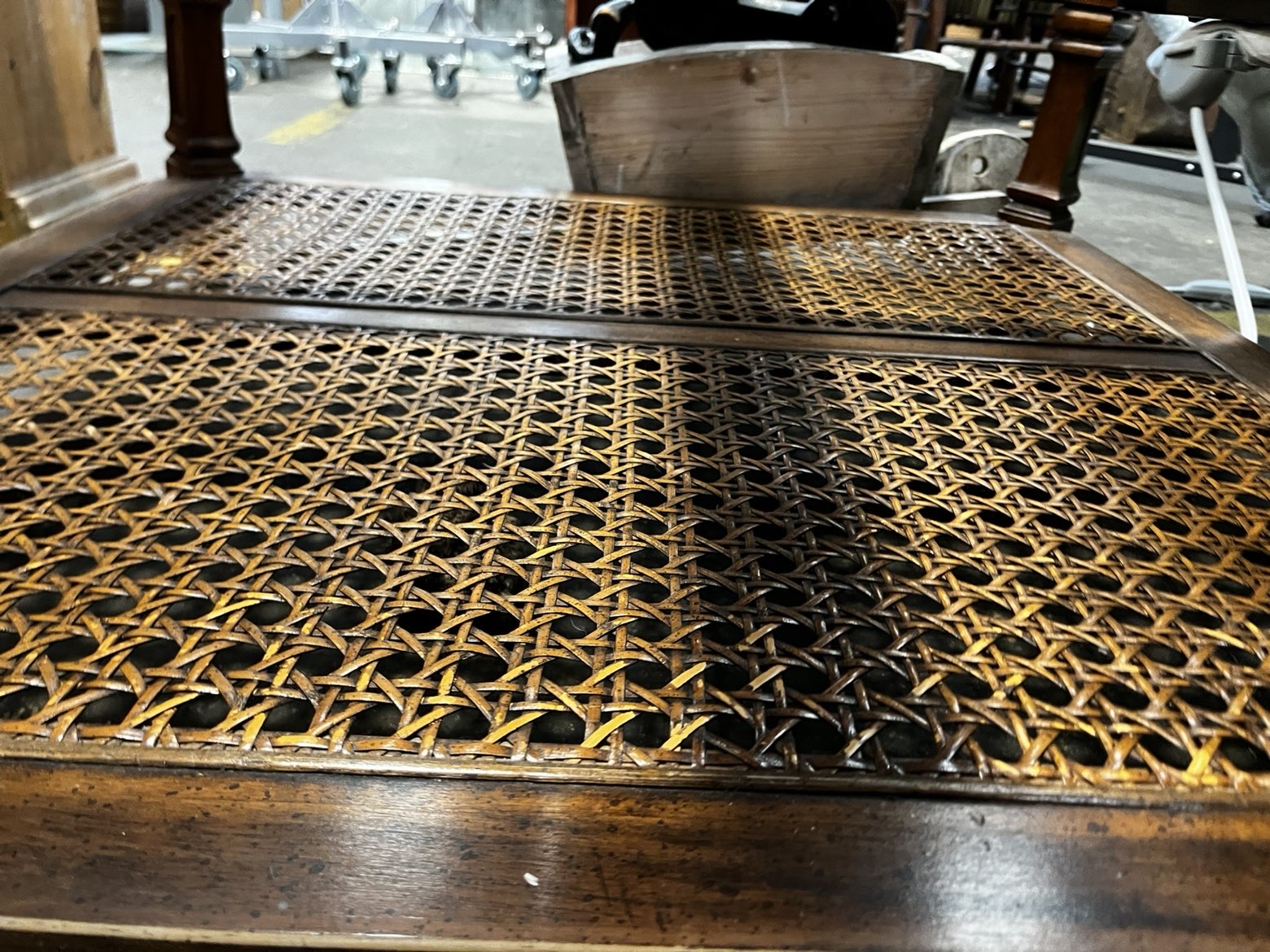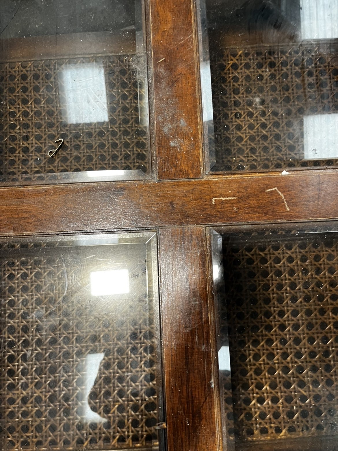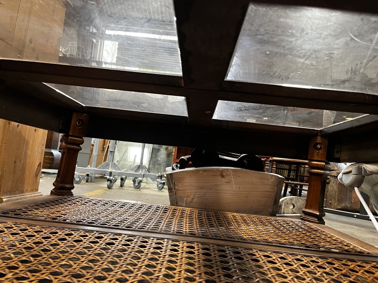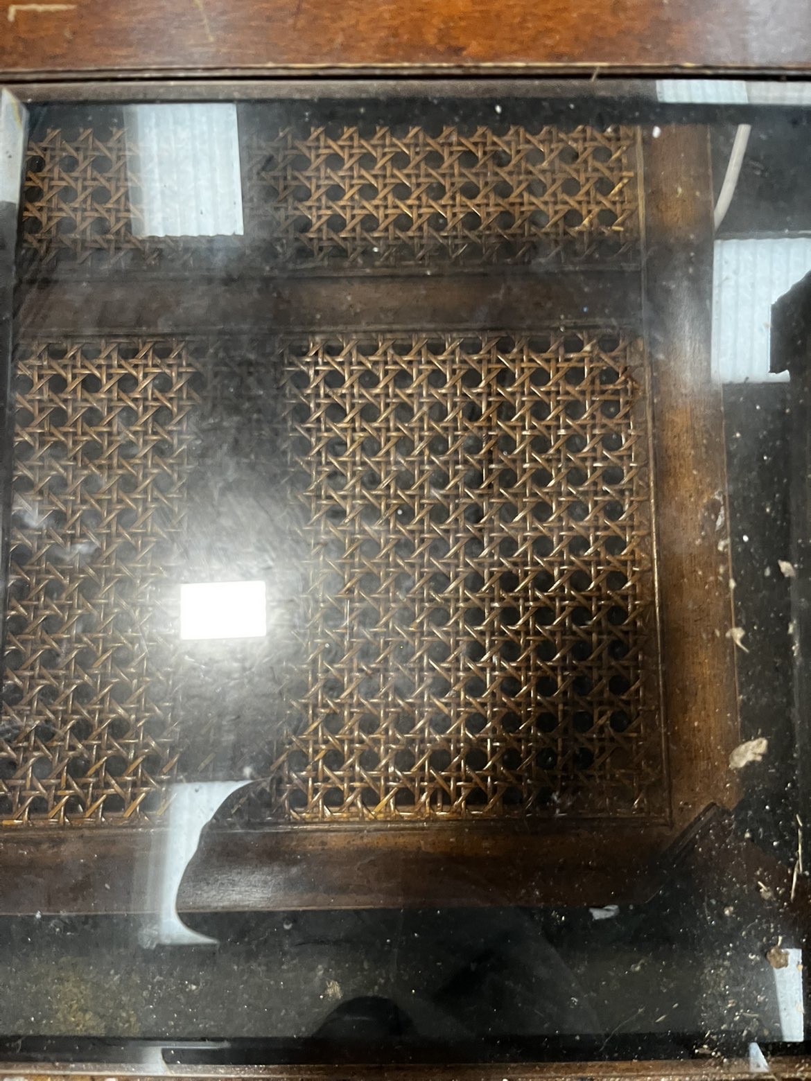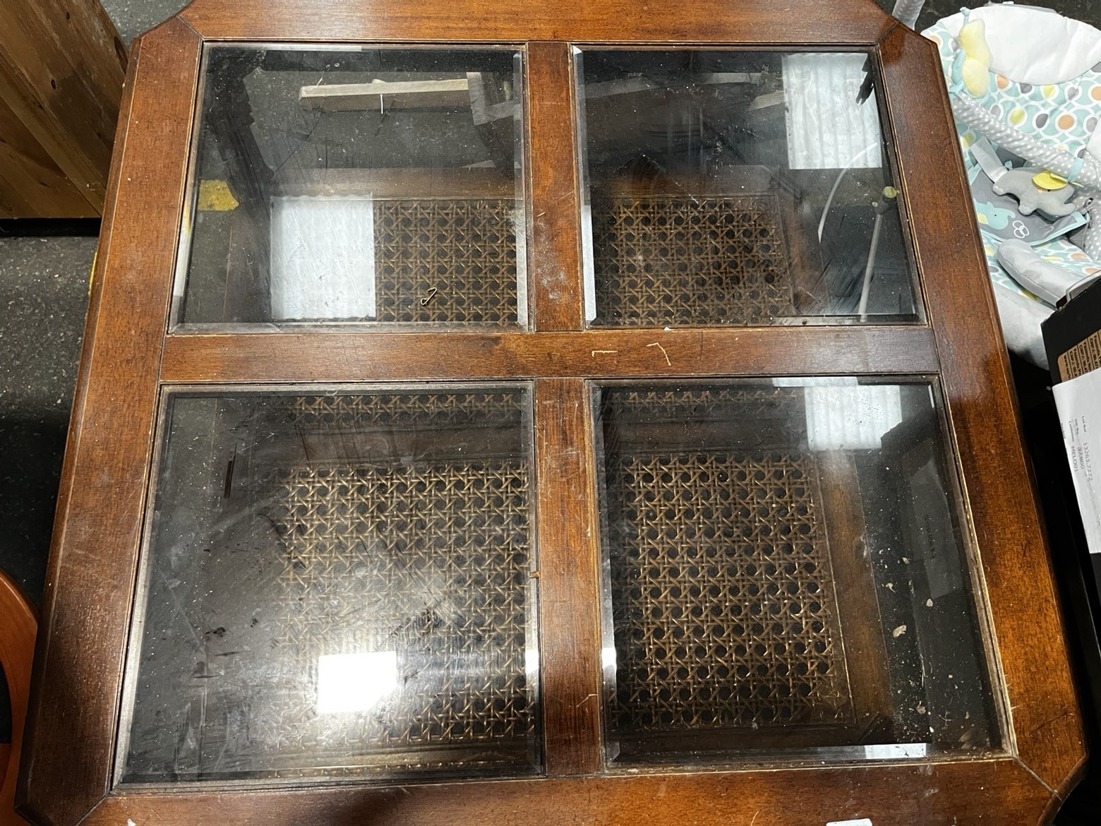 A square-form two-tier coffee table constructed from mahogany-stained hardwood. The upper tier features a wooden frame divided into four sections, each inset with a bevelled glass pane. The outer edge of the top frame is detailed with light-coloured stringing inlay. The lower tier mirrors the layout of the top, with four panels inset with woven cane rattan work. The structure is supported by four square-section legs featuring simple turned detailing at the shoulders and finishing in plain feet. A paper auction sticker is adhered to the frame reading Liskeard Auction Rooms, Lot 776.