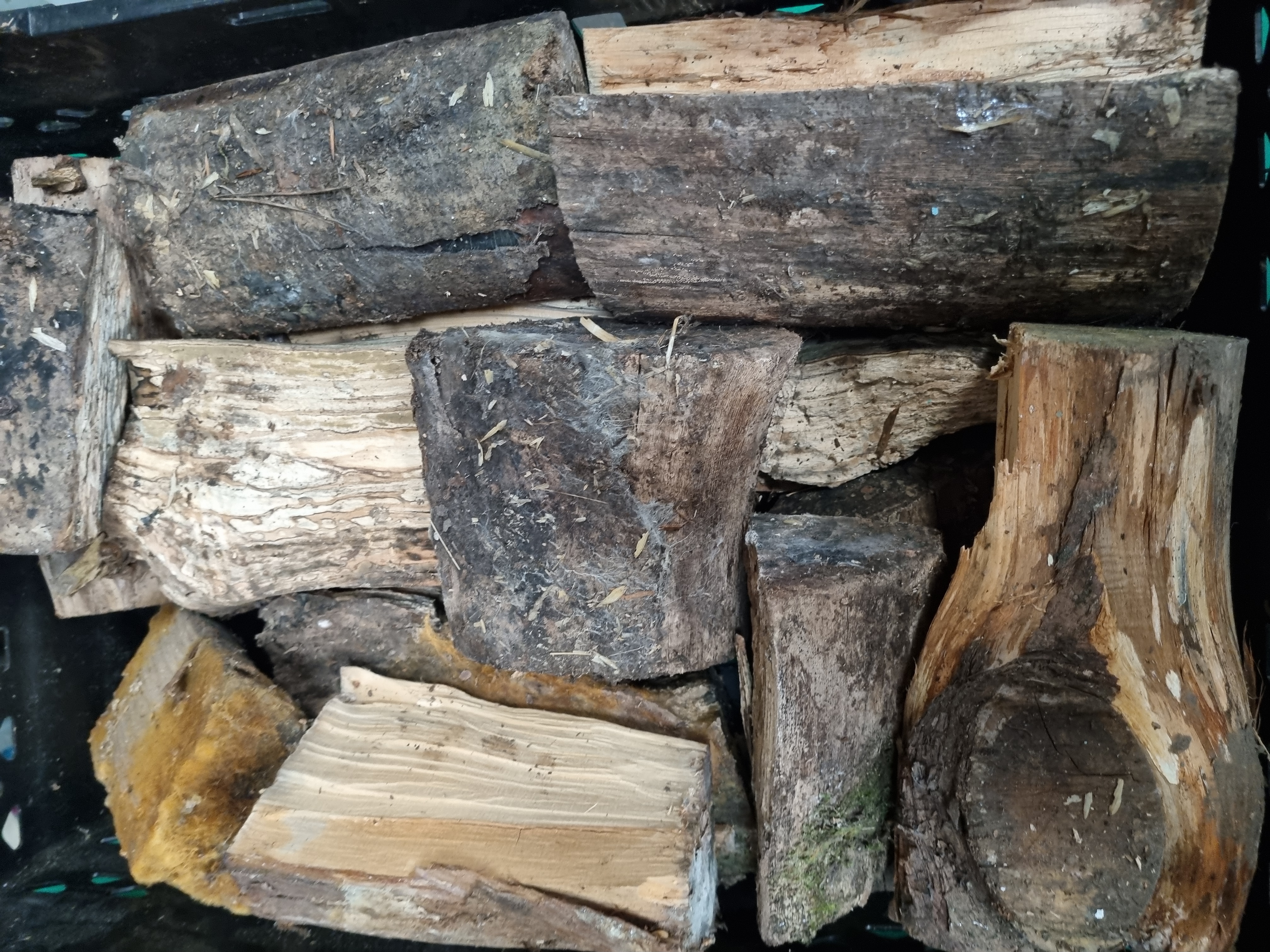 A collection of seasoned firewood logs, split into various sizes suitable for a domestic fireplace or wood-burning stove. The wood appears to be a mix of hardwoods and softwoods, exhibiting natural weathering and aging with visible bark and grain patterns. Some logs show instances of moss and fungal growth. The collection is presented in two black plastic rectangular vented crates. No maker’s marks, brands, or labels are visible on the timber or the containers.