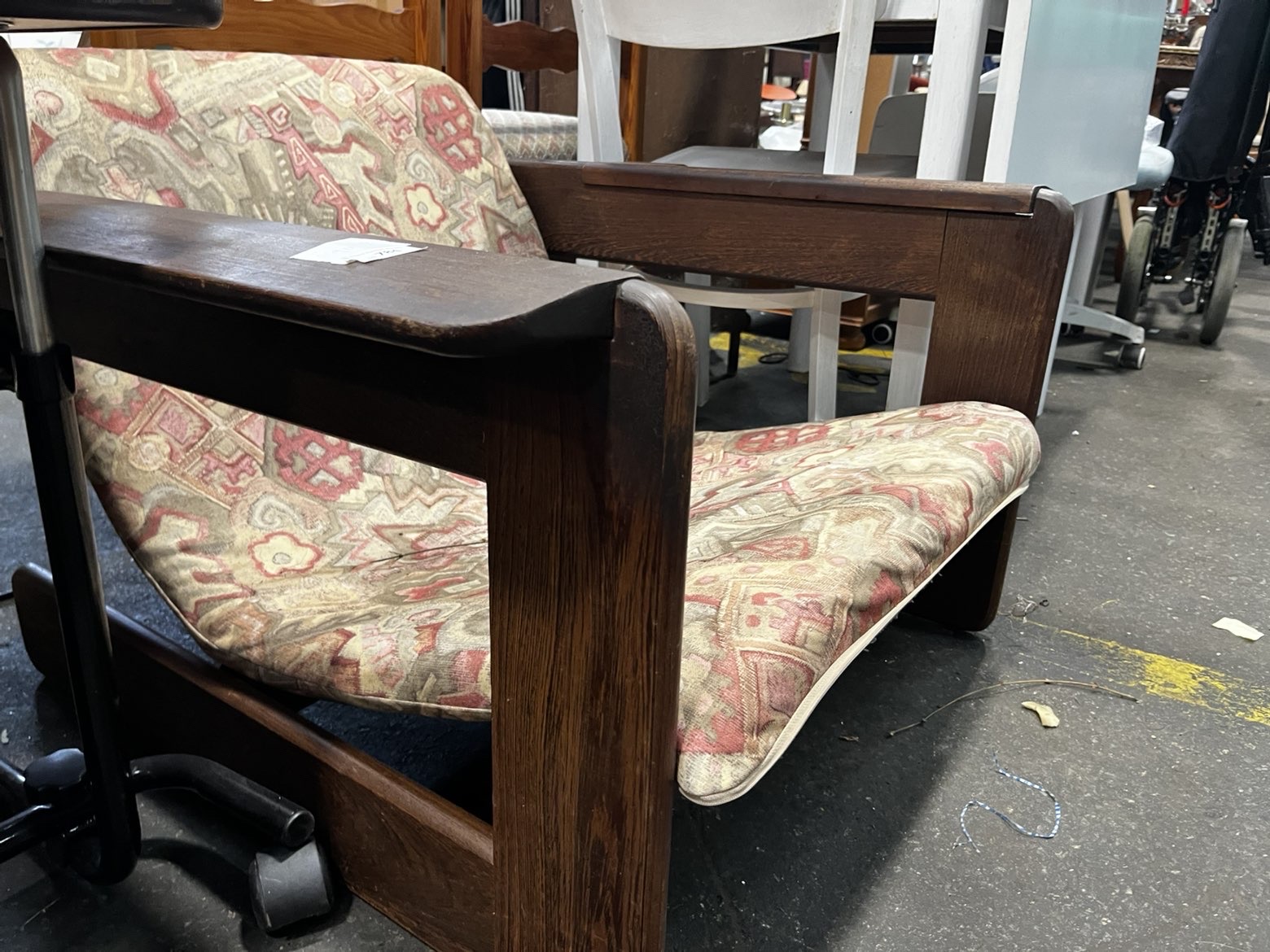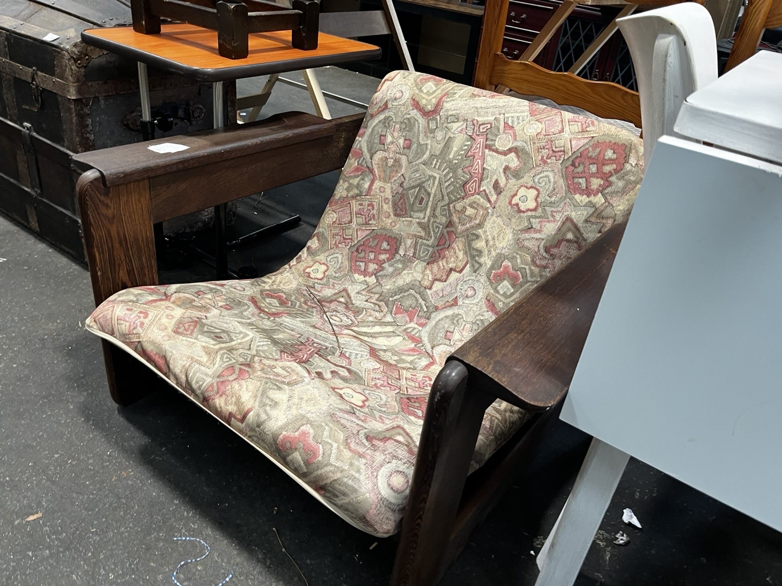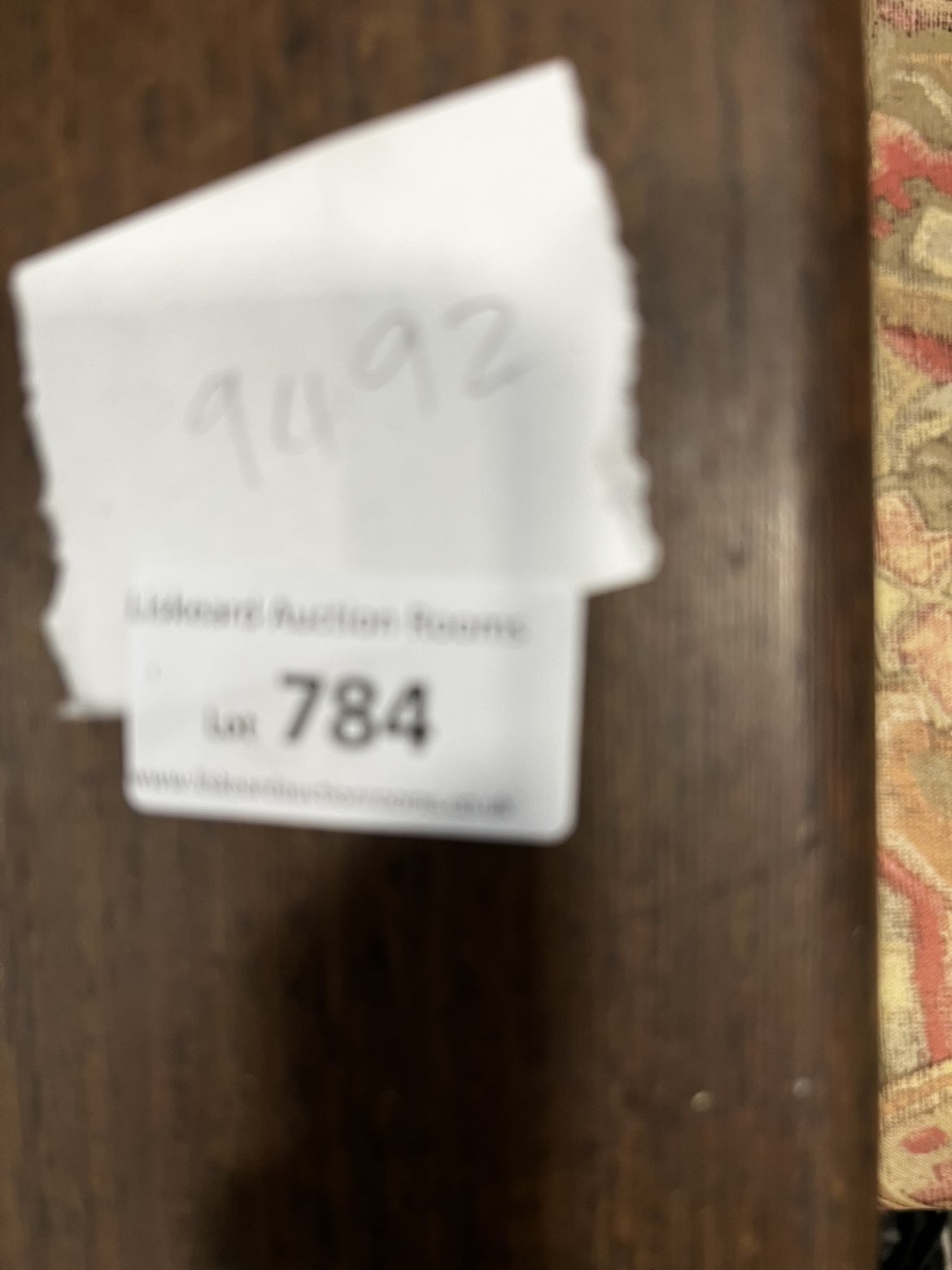 A single low-slung lounge armchair following a studio furniture or brutalist aesthetic. The frame is constructed from a dark-stained hardwood, likely oak, showing a prominent grain through the finish. The chair is characterised by its heavy-set construction and exceptionally wide, flat-topped armrests. Mortise and tenon joinery is visible where the horizontal seat rails meet the upright arm supports. It features a continuous, single-piece padded seat and back cushion. The upholstery is a tapestry-style weave with an all-over abstract and geometric pattern in muted tones of dusty pink, grey, tan, and cream. A paper auction tag from Liskeard Auction Rooms is present on one armrest, indicating lot number 784 and a handwritten reference number 9492. No manufacturer marks or labels are visible.