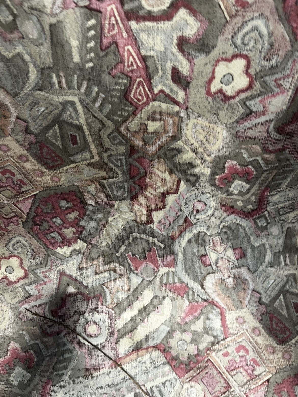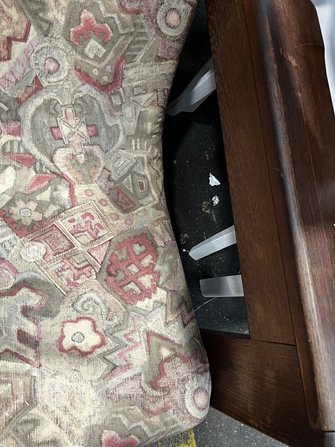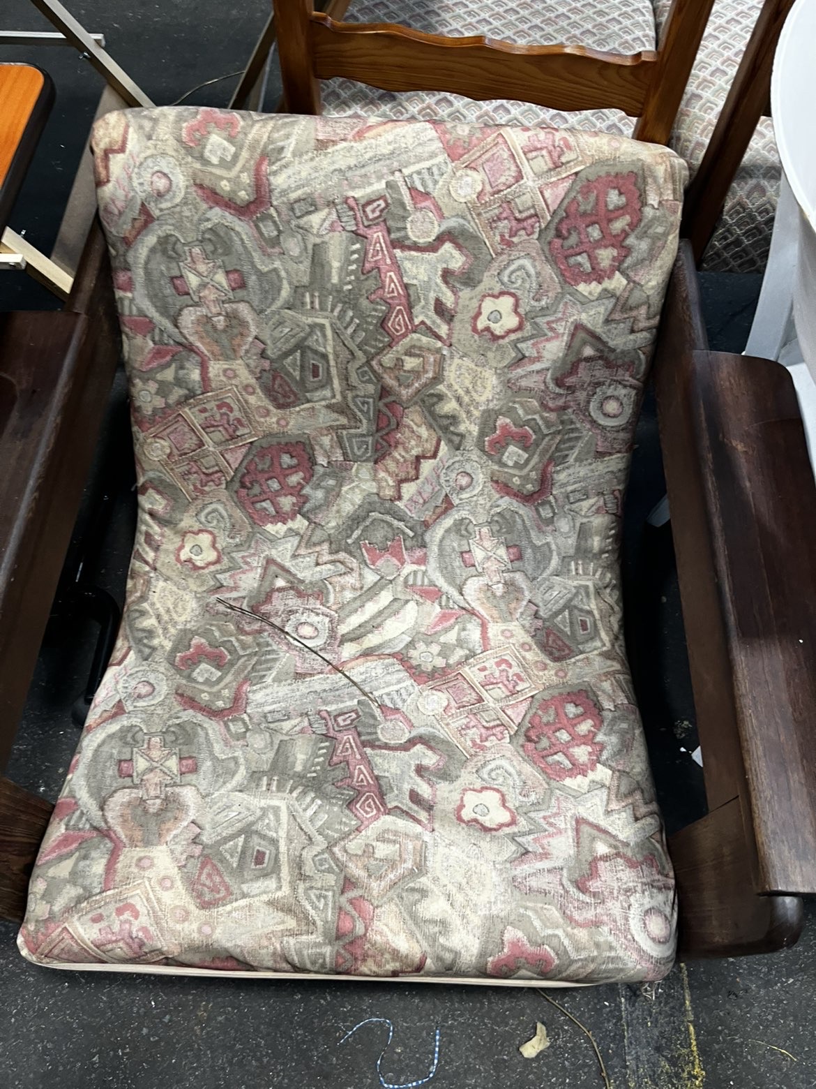 A single low-slung lounge armchair following a studio furniture or brutalist aesthetic. The frame is constructed from a dark-stained hardwood, likely oak, showing a prominent grain through the finish. The chair is characterised by its heavy-set construction and exceptionally wide, flat-topped armrests. Mortise and tenon joinery is visible where the horizontal seat rails meet the upright arm supports. It features a continuous, single-piece padded seat and back cushion. The upholstery is a tapestry-style weave with an all-over abstract and geometric pattern in muted tones of dusty pink, grey, tan, and cream. A paper auction tag from Liskeard Auction Rooms is present on one armrest, indicating lot number 784 and a handwritten reference number 9492. No manufacturer marks or labels are visible.