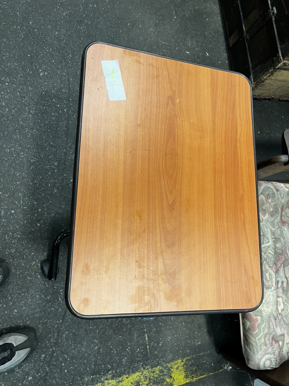 This lot consists of two separate tables of differing styles and periods. The first is an oak occasional table, a 20th-century reproduction in the 17th-century Jacobean style, finished with a dark stain. It features a solid rectangular top with a squared edge over a carved frieze decorated with a repeating nulled oval motif. The table is supported by four turned cup and cover legs which transition into square blocks joined by a low-profile rectangular perimeter stretcher. A handwritten numeral 4 is visible on the underside. The second item is a modern height-adjustable utility or over-bed table. It features a rectangular top with rounded corners, finished in a light wood-effect laminate with a black plastic protective edge. The black powder-coated metal frame consists of an H-shaped base fitted with four twin-wheel plastic castors and twin telescopic uprights with plastic hand-tightening knobs for height adjustment.