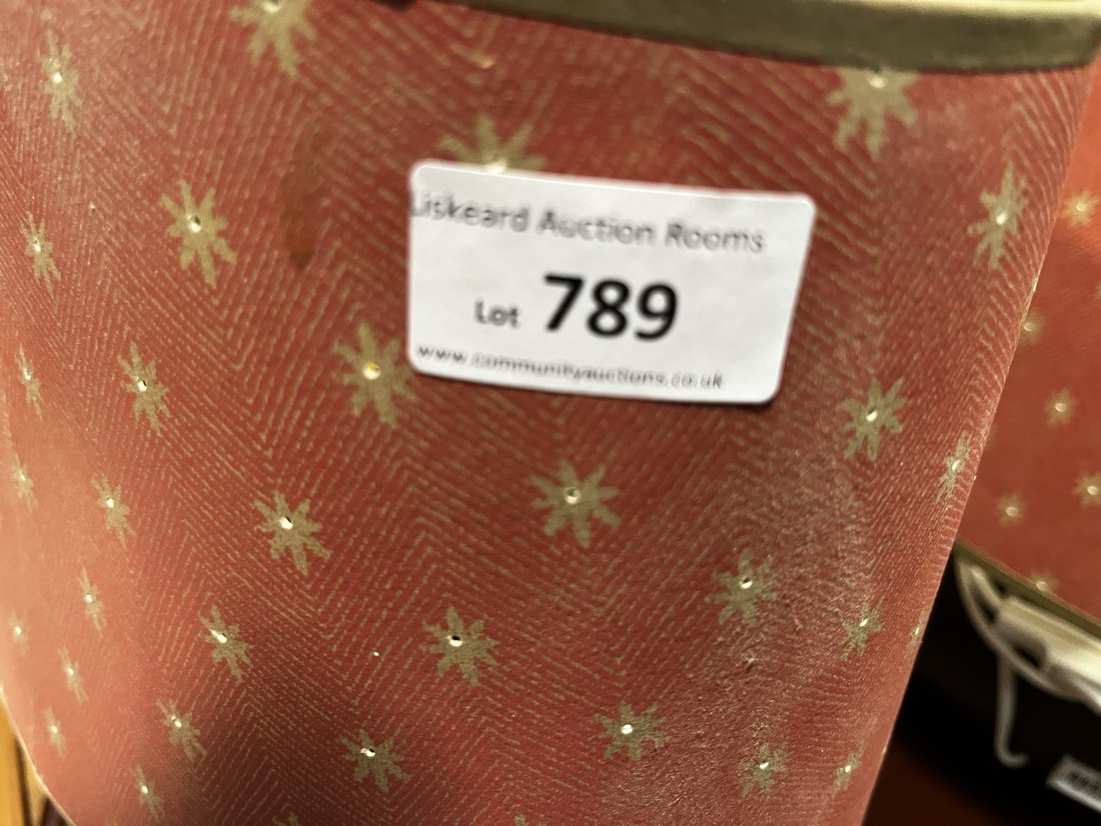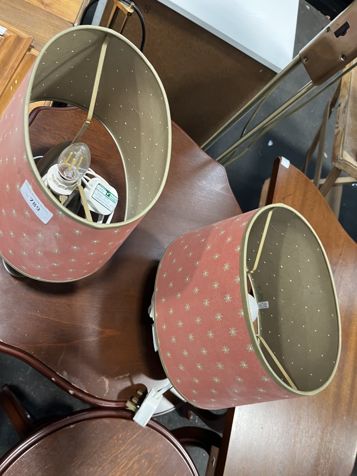 A pair of table lamps with dark ovoid-shaped bases and coral-coloured cylindrical shades featuring gold-toned starburst patterns and perforated detailing.