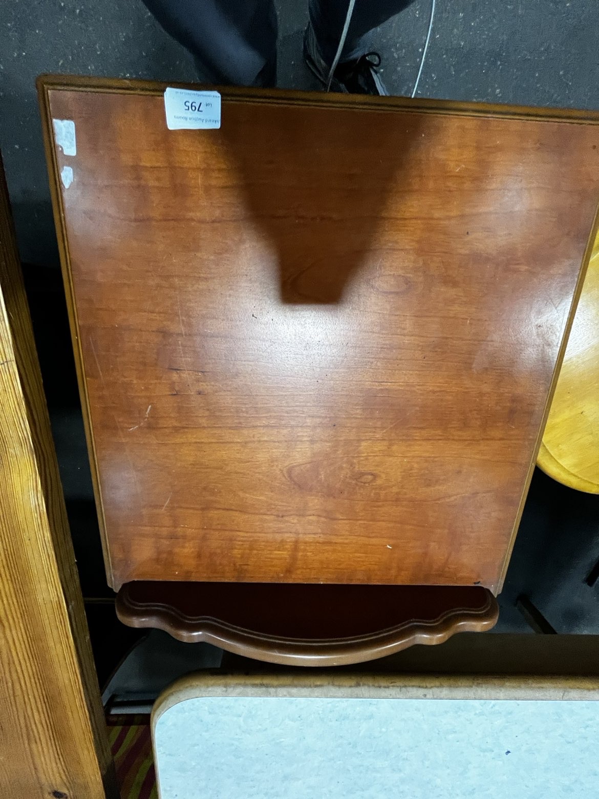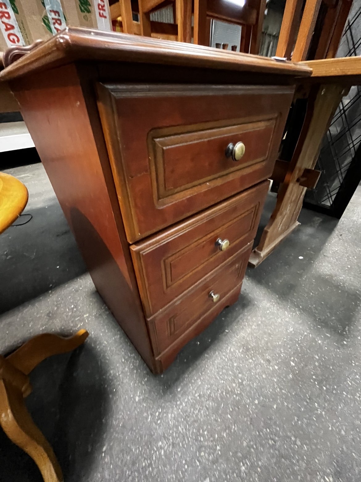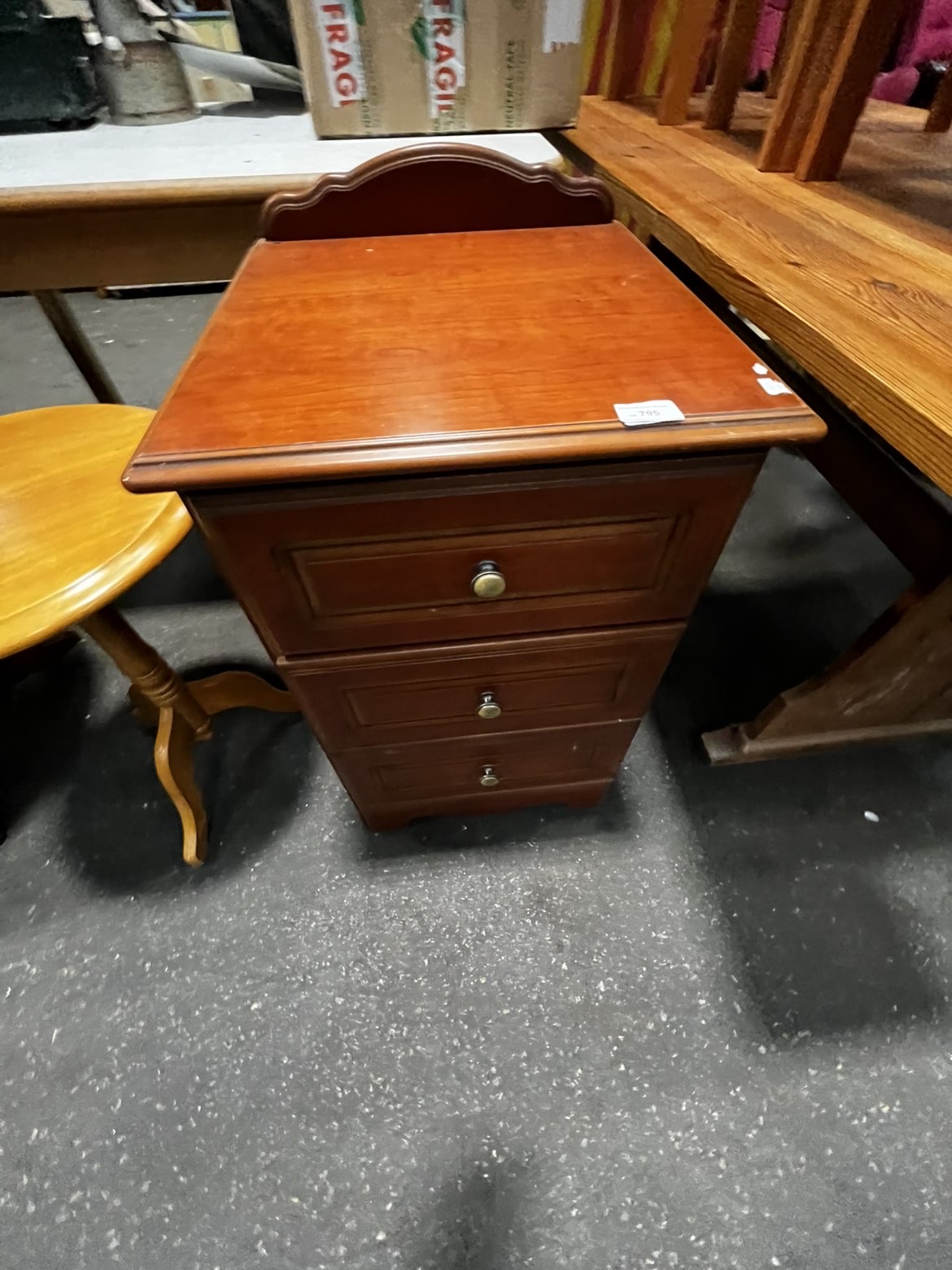 A traditional style bedside chest of drawers featuring a reddish-brown stained finish. The rectangular top is finished with a moulded edge and a decorative shaped gallery backsplash. The carcase contains three drawers, each decorated with a recessed moulded panel and fitted with a single circular brass-toned pull knob. The piece is supported by a solid plinth base with shaped bracket-style feet to the front. The drawer interiors are of modern construction with light-coloured laminate surfaces. An auction lot label from Liskeard Auction Rooms, numbered 795, is adhered to the top surface.