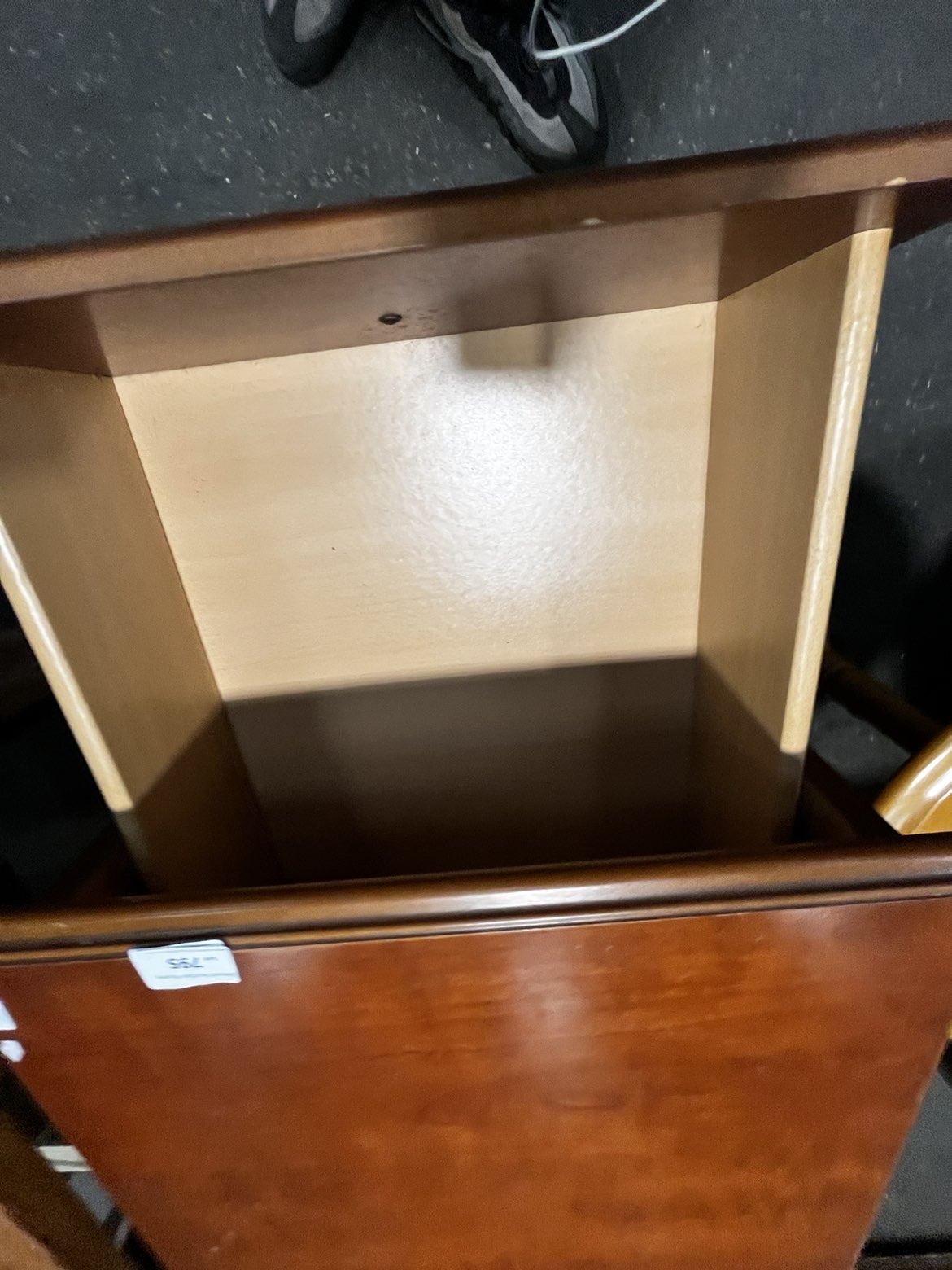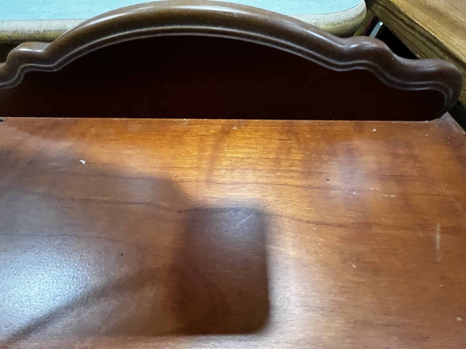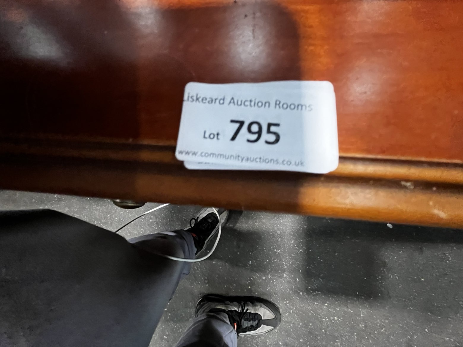 A traditional style bedside chest of drawers featuring a reddish-brown stained finish. The rectangular top is finished with a moulded edge and a decorative shaped gallery backsplash. The carcase contains three drawers, each decorated with a recessed moulded panel and fitted with a single circular brass-toned pull knob. The piece is supported by a solid plinth base with shaped bracket-style feet to the front. The drawer interiors are of modern construction with light-coloured laminate surfaces. An auction lot label from Liskeard Auction Rooms, numbered 795, is adhered to the top surface.