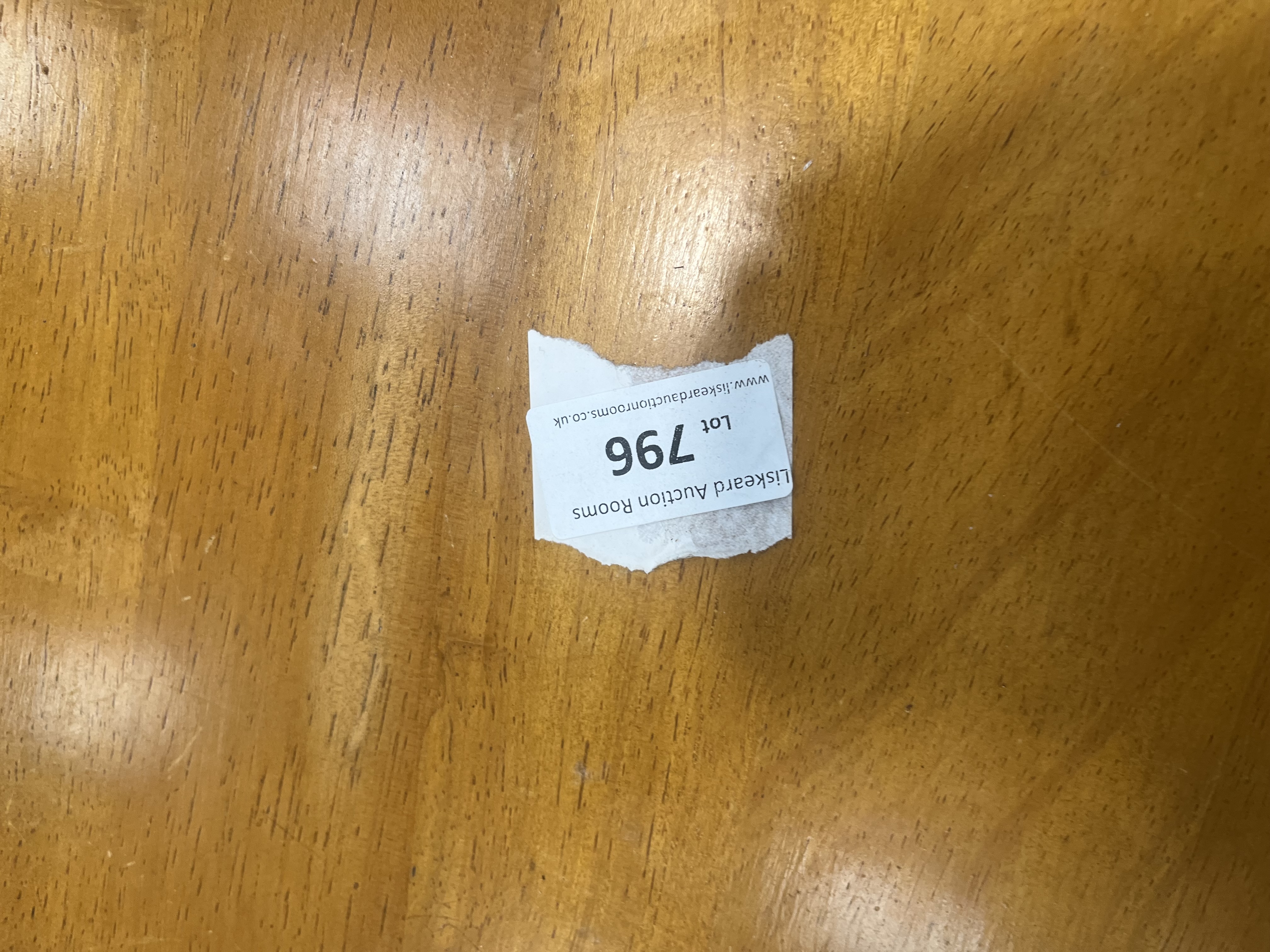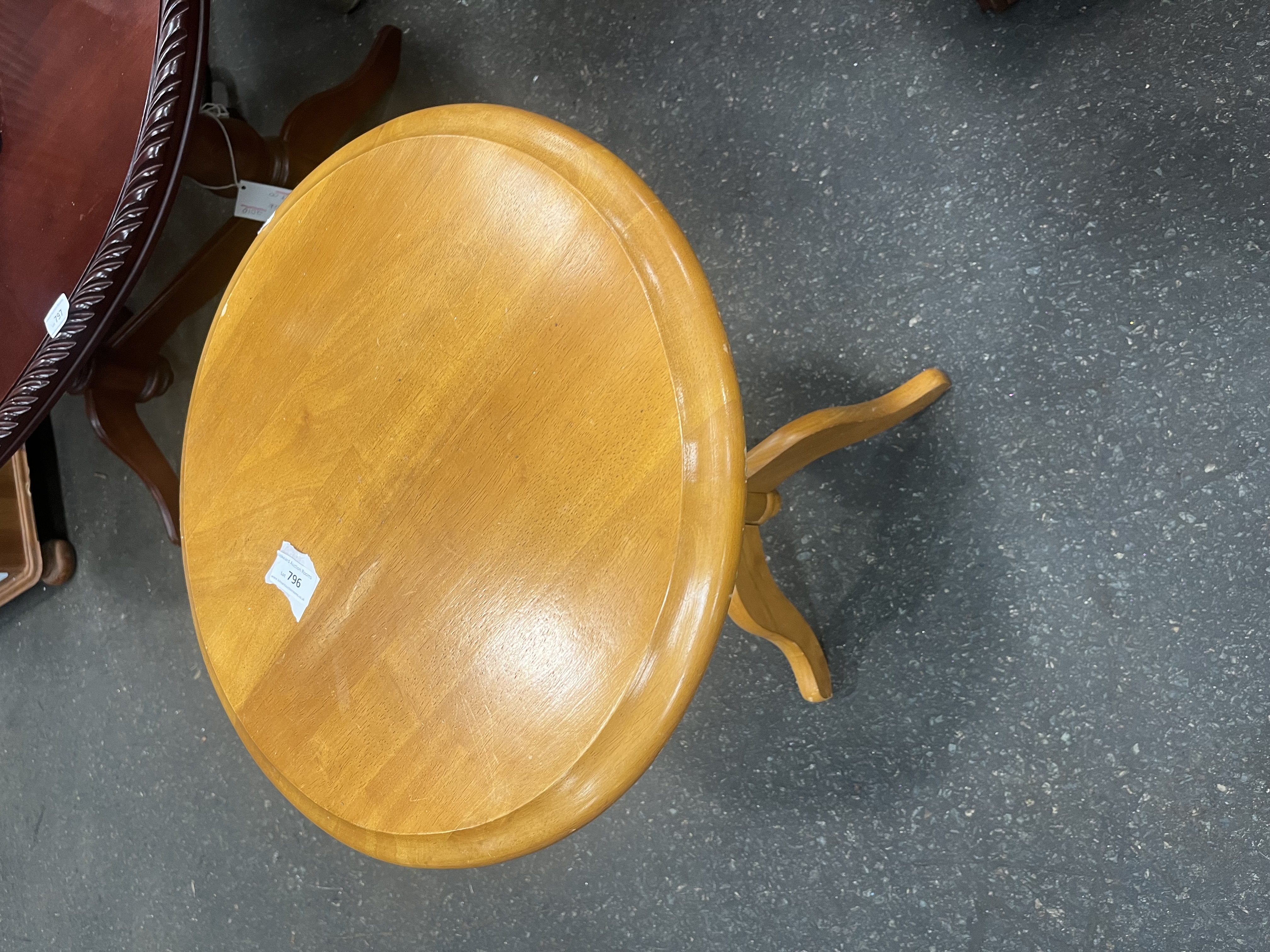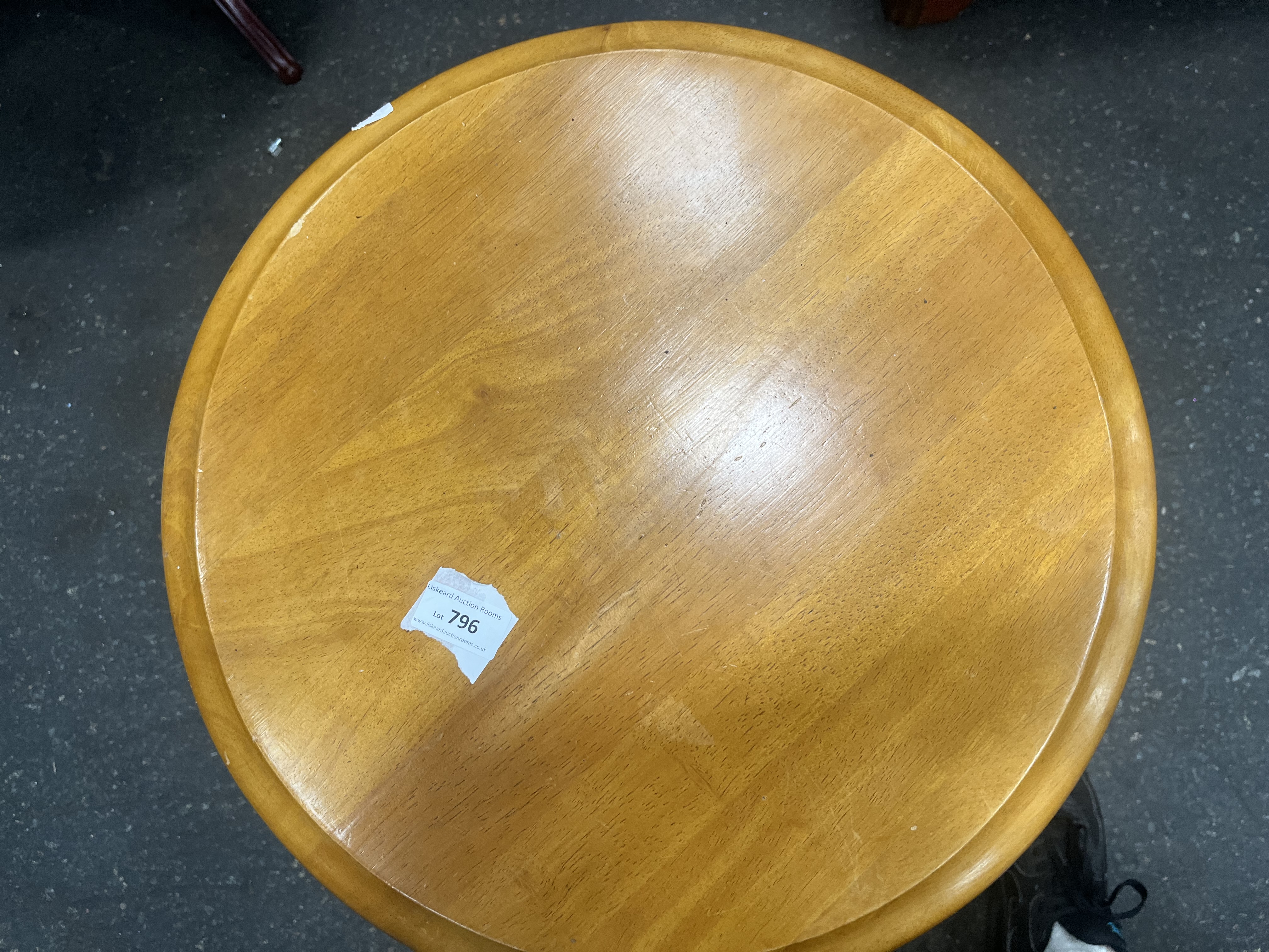 This circular side table is constructed from solid wood with a light-coloured polished finish, designed in a traditional reproduction style similar to pieces by East West Furniture. The table features a round top with a bevelled edge, supported by a central turned pedestal column. The support structure terminates in a tripod base with three out-swept curved legs. A paper auction label from Liskeard Auction Rooms is adhered to the upper surface, identifying the piece as Lot 796. There are no maker’s marks or stamps visible on the item.