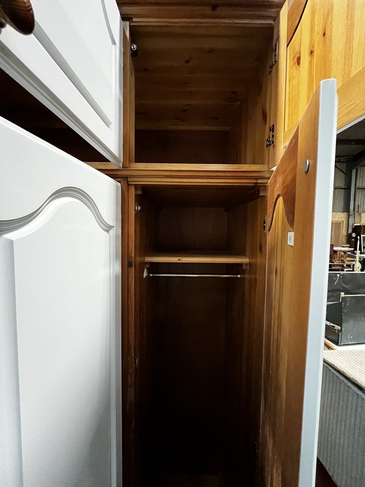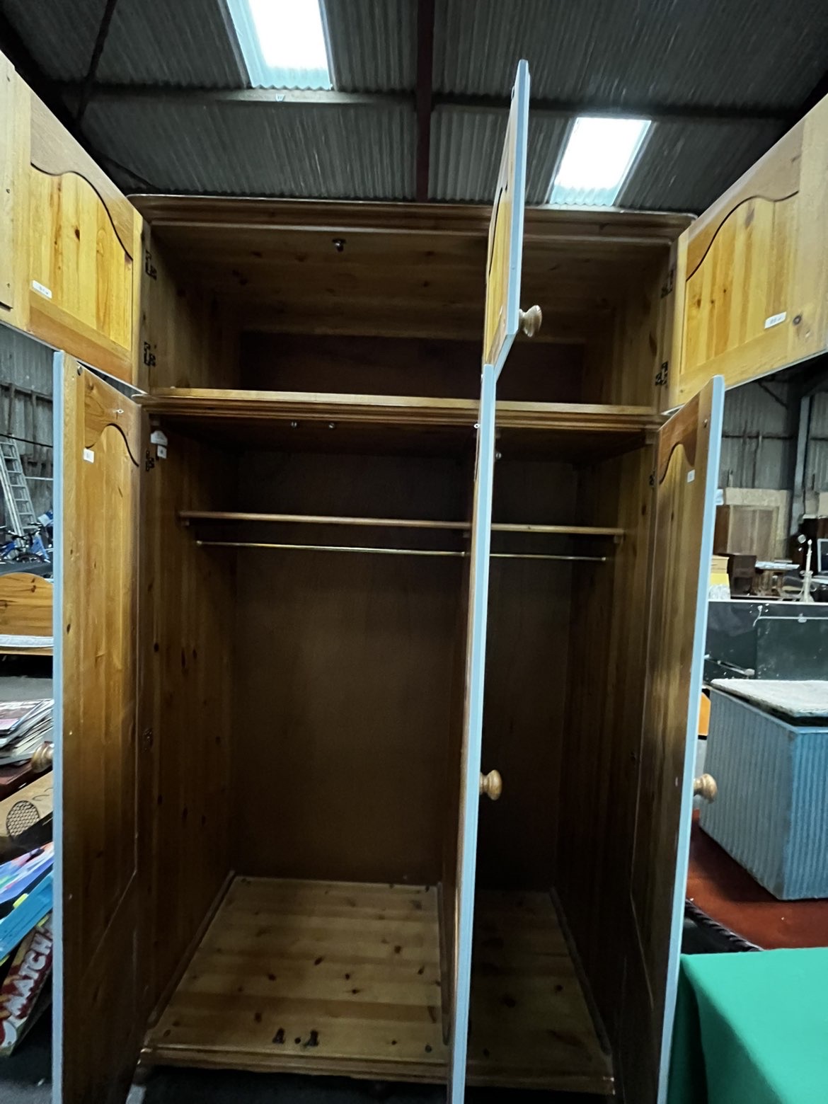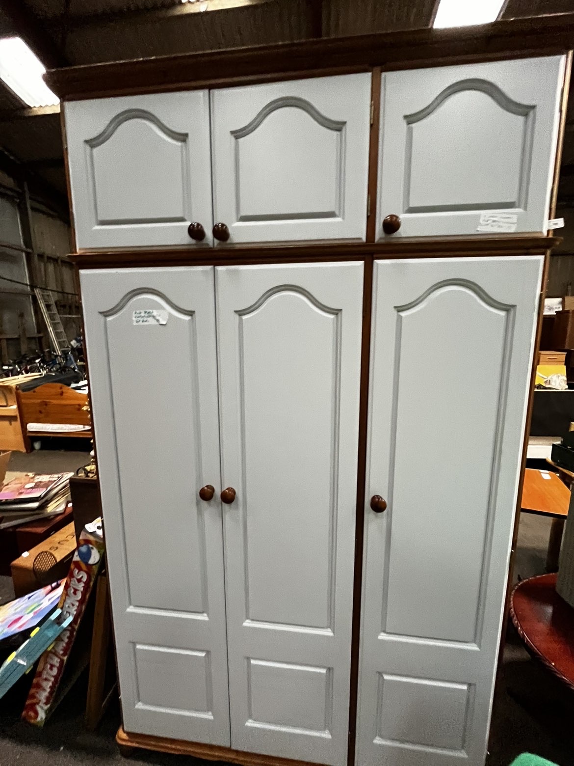 A Ducal pine triple wardrobe of two-piece construction, comprising a main triple-door unit and a matching three-door top box. The exterior features a two-tone finish with pale grey painted doors and frame sections, while the cornice, plinth, and interior retain a natural pine finish. Each door is designed with an arched cathedral panel and fitted with a turned wooden pull knob. The main wardrobe interior is divided into a double-width hanging section and a separate single hanging section, both containing a wooden hanging rail and an upper storage shelf. The top box provides three additional storage compartments. Evidence of a maker’s label is present on the interior of the top box, and the characters A . A are handwritten in black ink on the floor of the main unit. Also included in this lot is a small portable pool table with a blue baize playing surface, black frame, and white nylon net pockets.