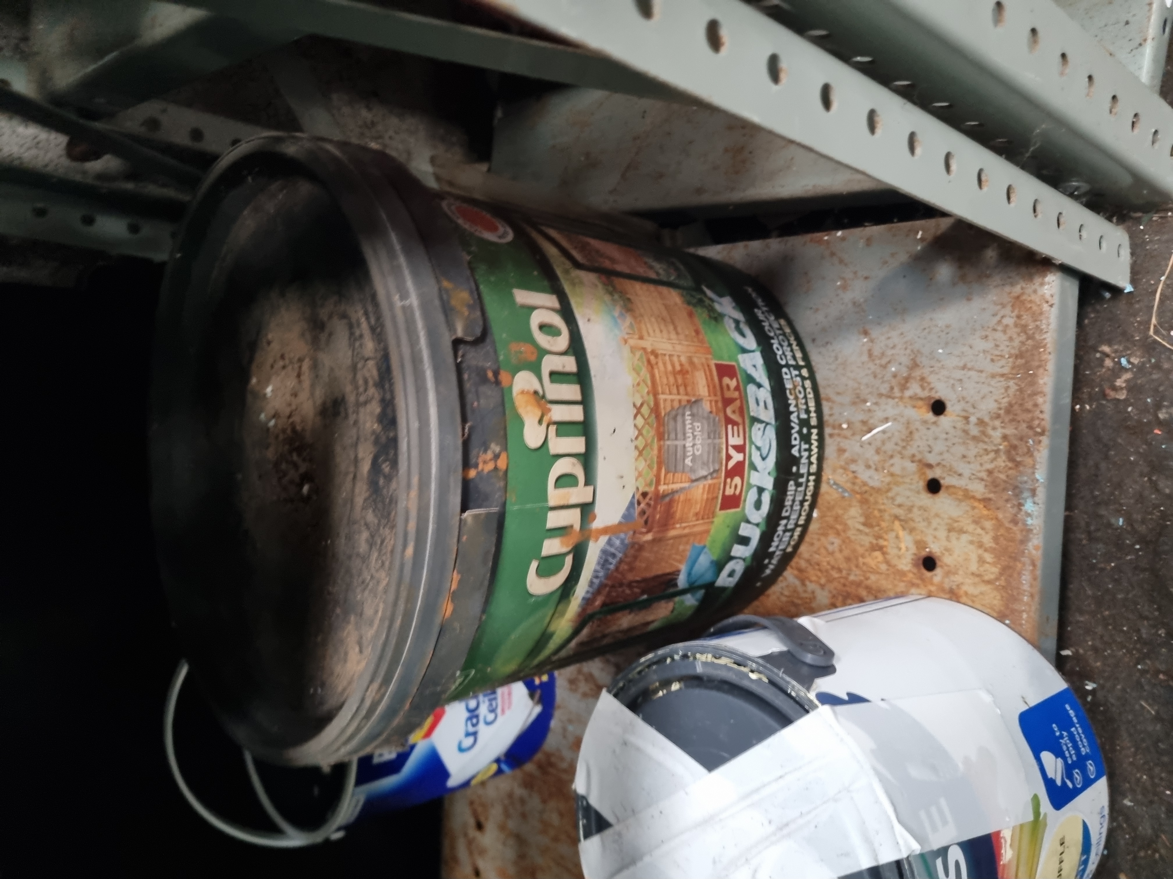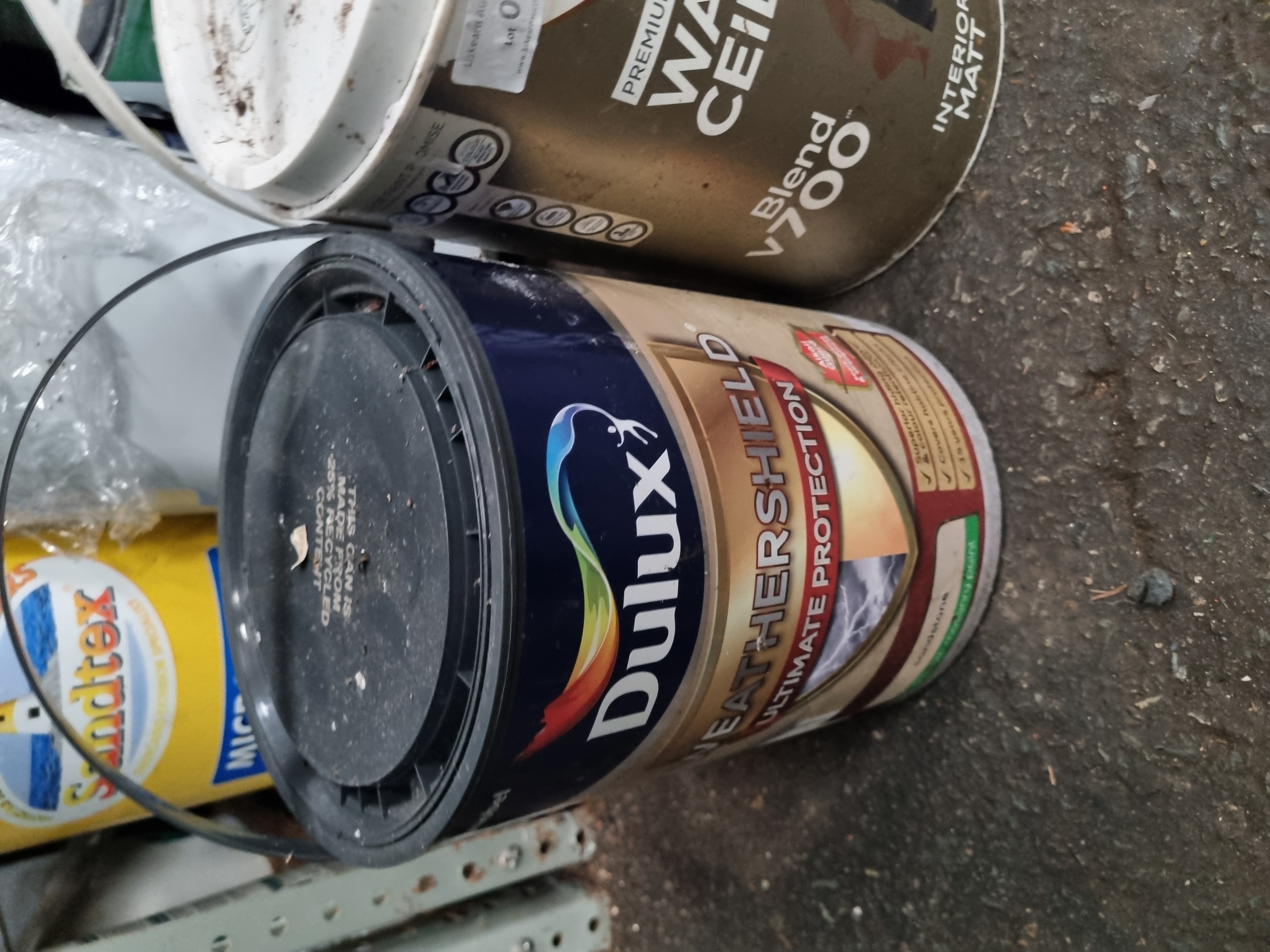 An assortment of interior and exterior paints and surface treatments from various manufacturers. The lot includes Dulux Weathershield Ultimate Protection masonry paint, Valspar Premium Walls and Ceilings Interior Matt paint (Blend V700), Ronseal One Coat Fence Life in Red Cedar, and Cuprinol Ducksback 5-Year protective coating in Autumn Gold. The collection also contains Homebase Matt Walls and Ceilings paint in Lemon Soufflé, Sandtex Microseal Fine Textured Masonry paint, and Polycell Crack-Free Ceilings paint. One unidentified white tin is included, partially wrapped in plastic film. Containers are a mix of metal tins and plastic buckets. Some lids bear handwritten notations or auction lot labels from Liskeard Auction Rooms.