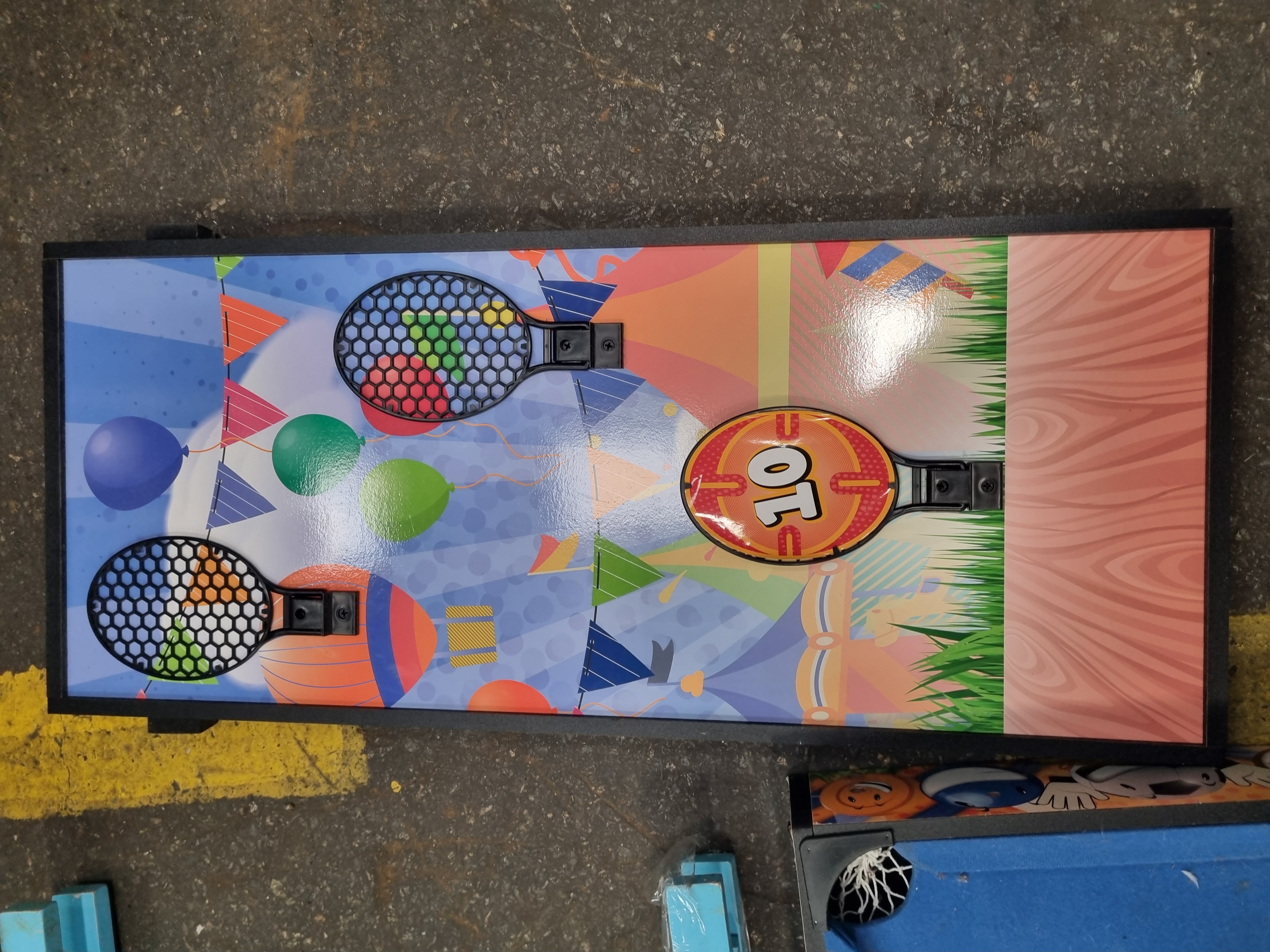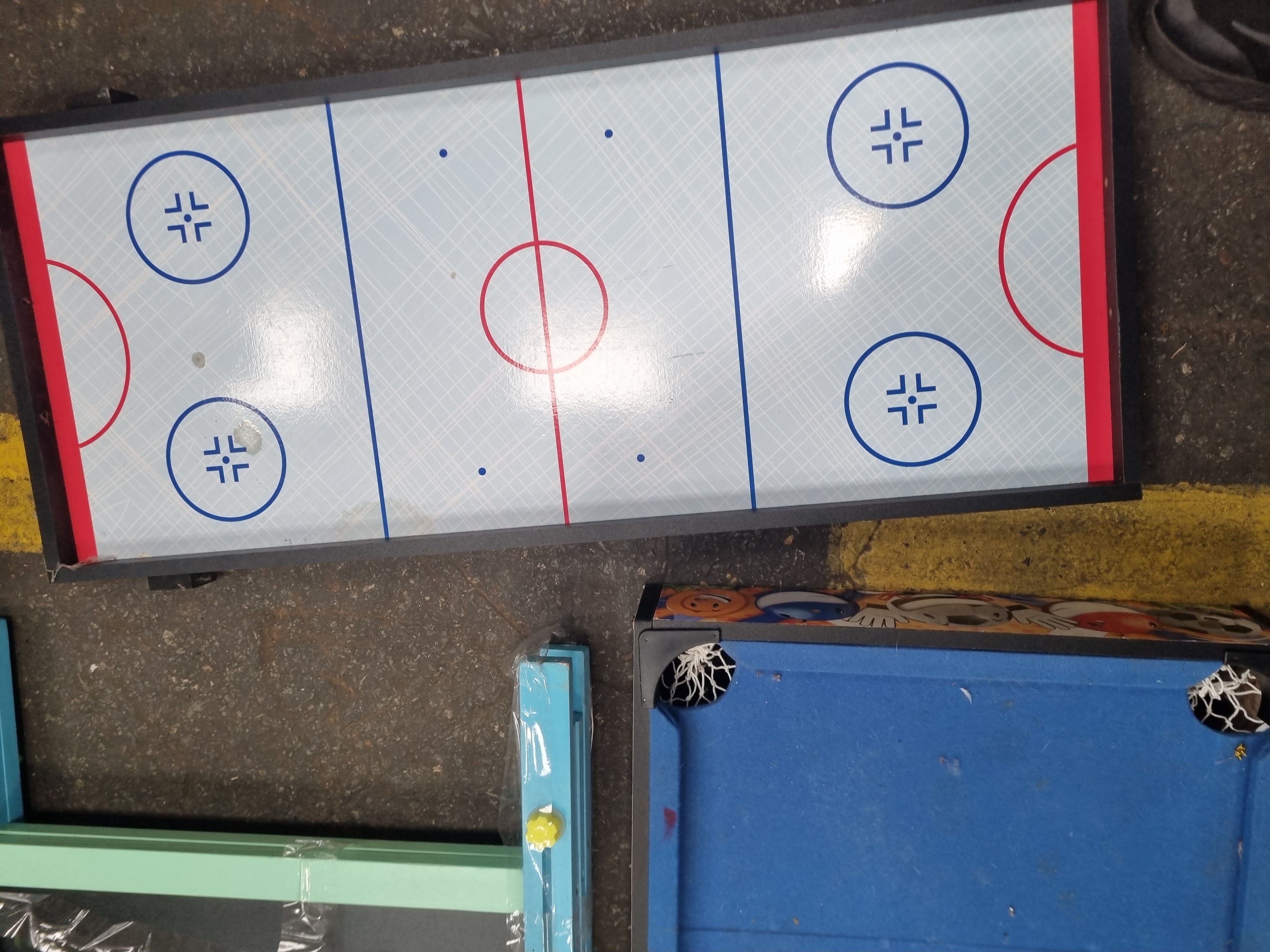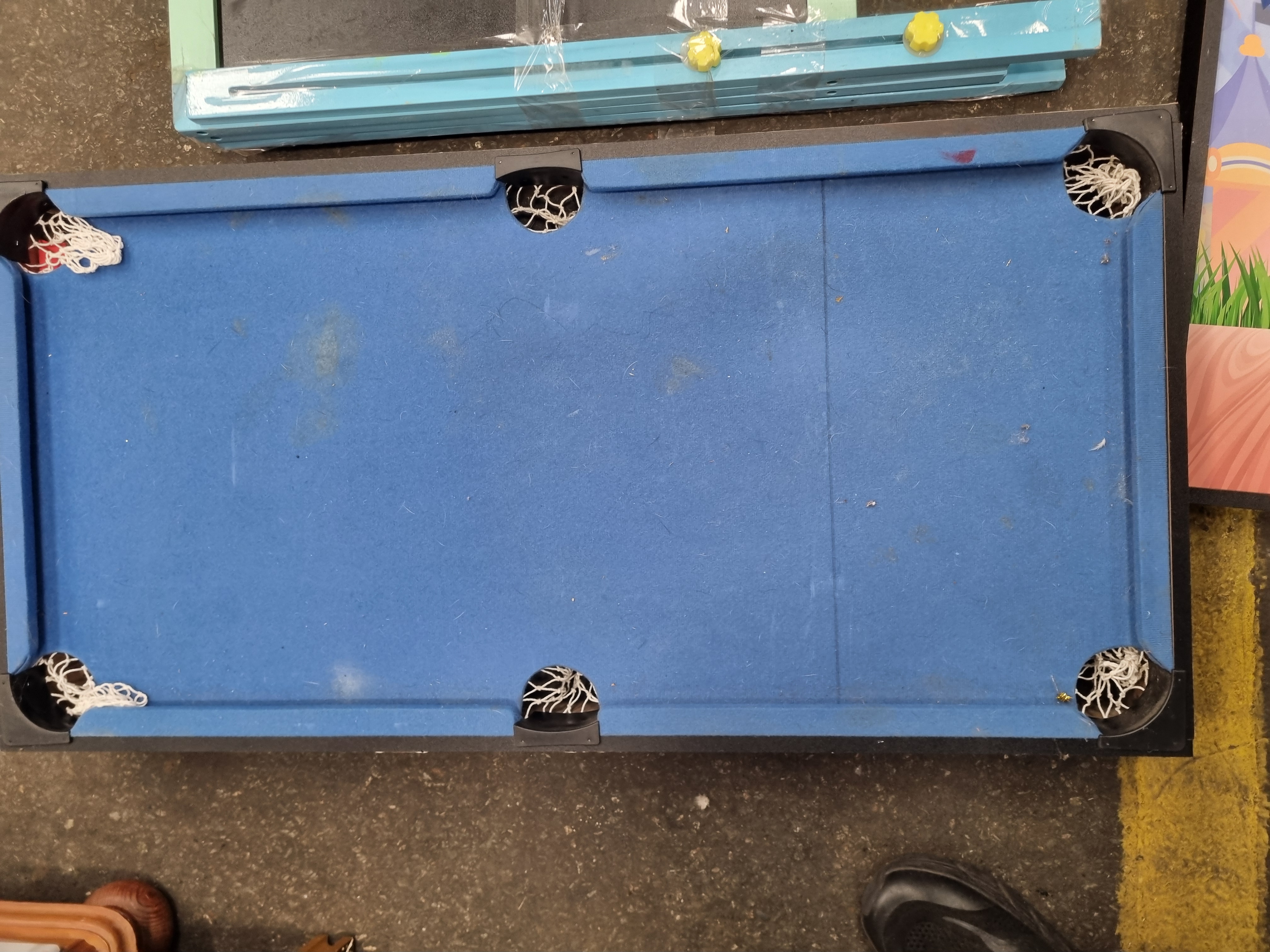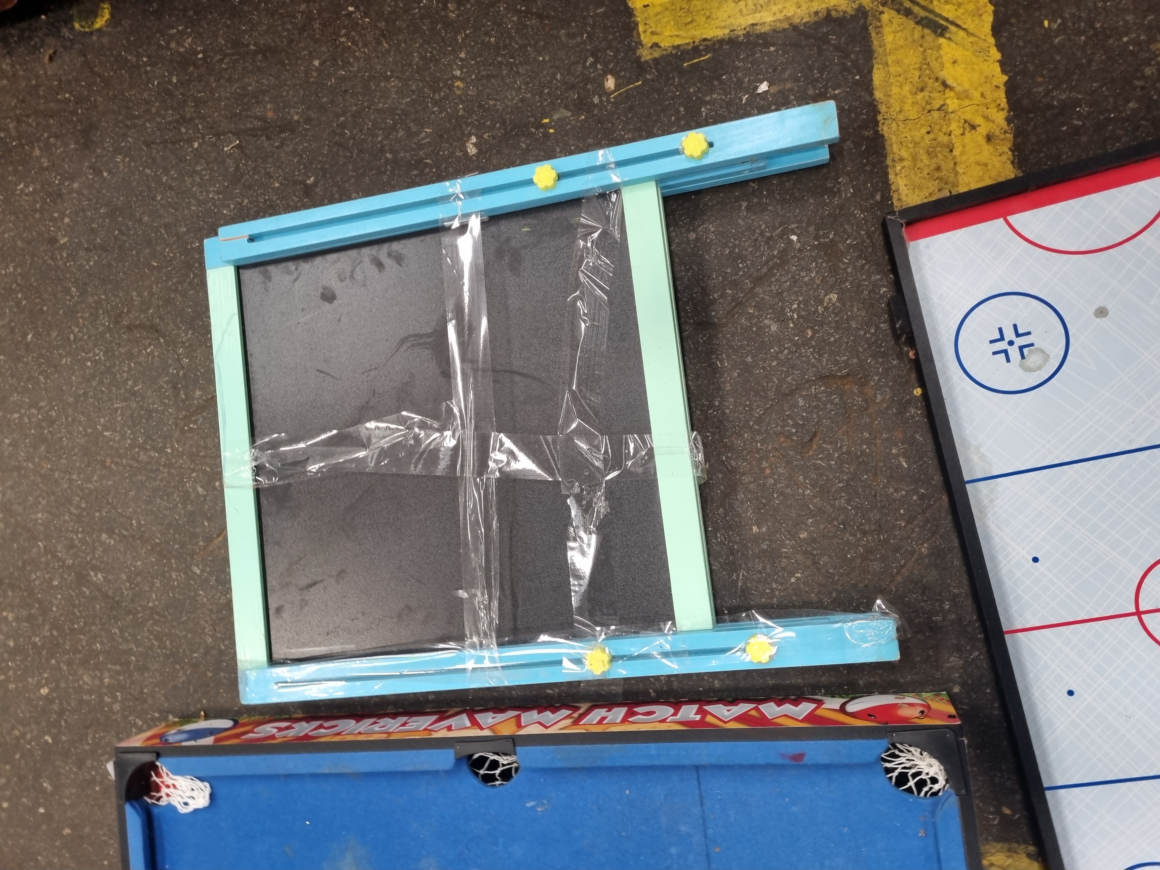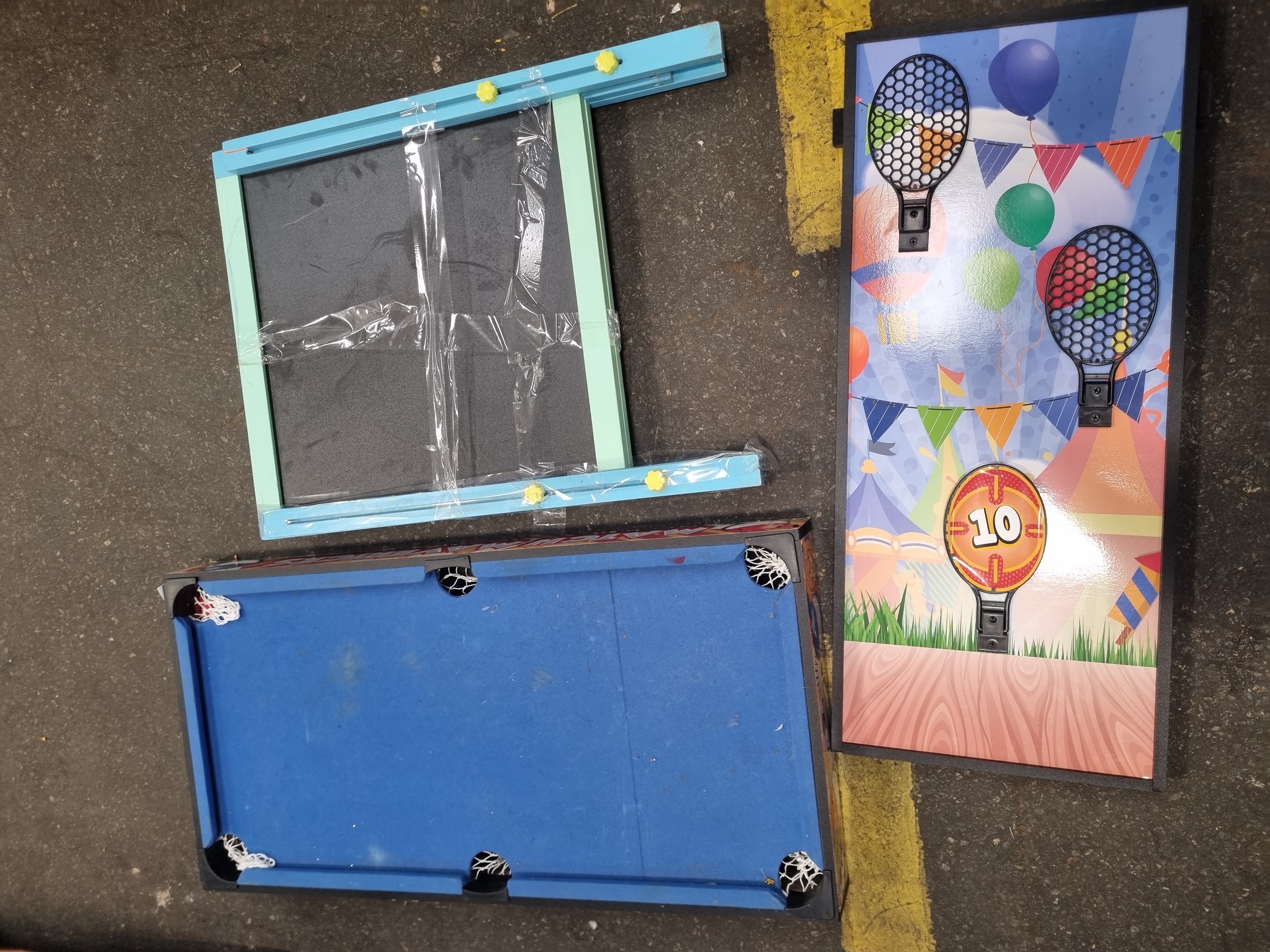 This lot comprises several components from a multi-game tabletop set manufactured under the Match Mavericks brand. The assortment includes a miniature pool table surface finished with blue felt, an air hockey playing surface, a target game board with three net-style catchers, and a double-sided chalkboard or easel frame. The structural frames are constructed from a combination of wood and MDF, with plastic utilised for the pool pockets and target housings. The Match Mavericks brand name is printed on the exterior frame of the pool table component. These items are designed for manual play and do not feature mechanical or electronic parts.