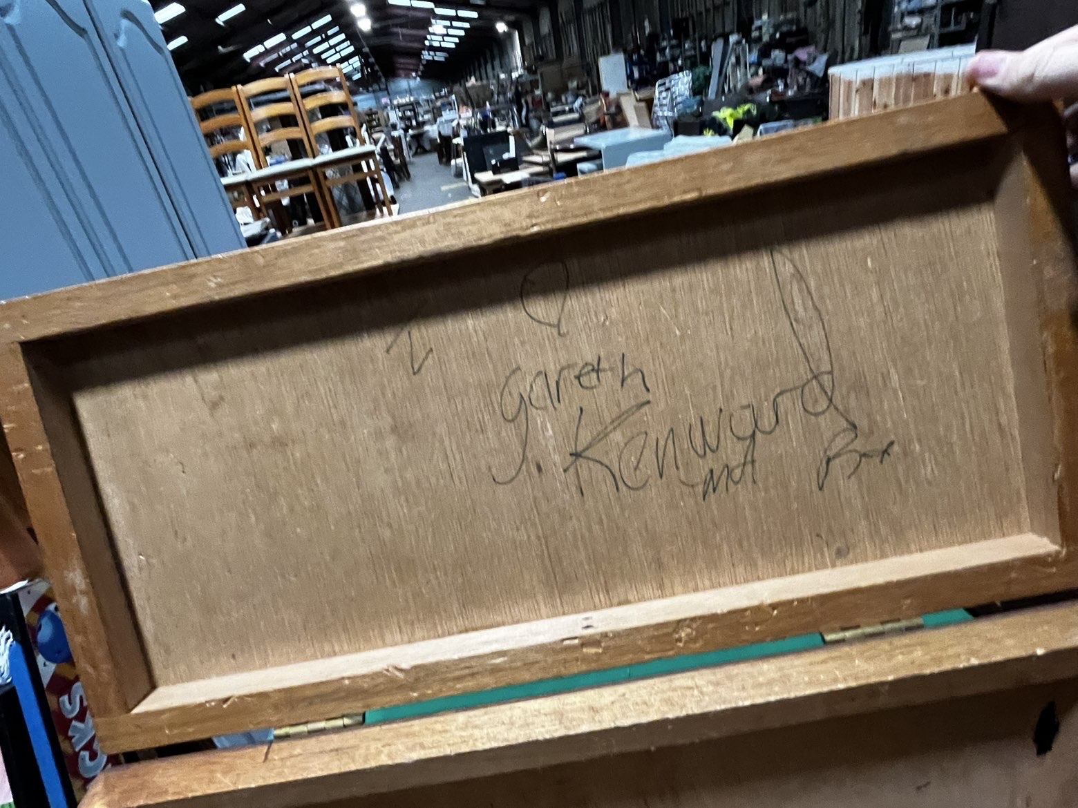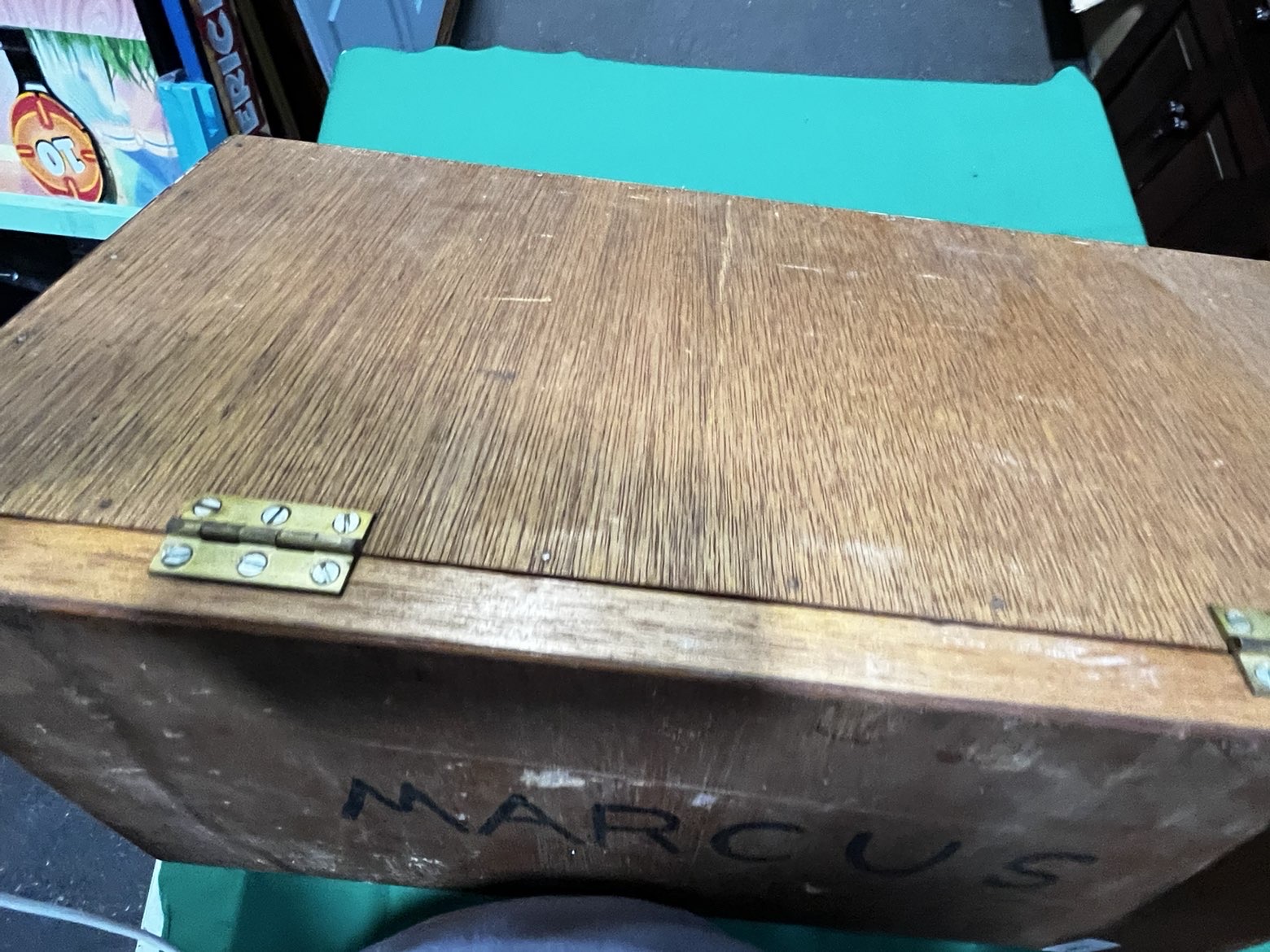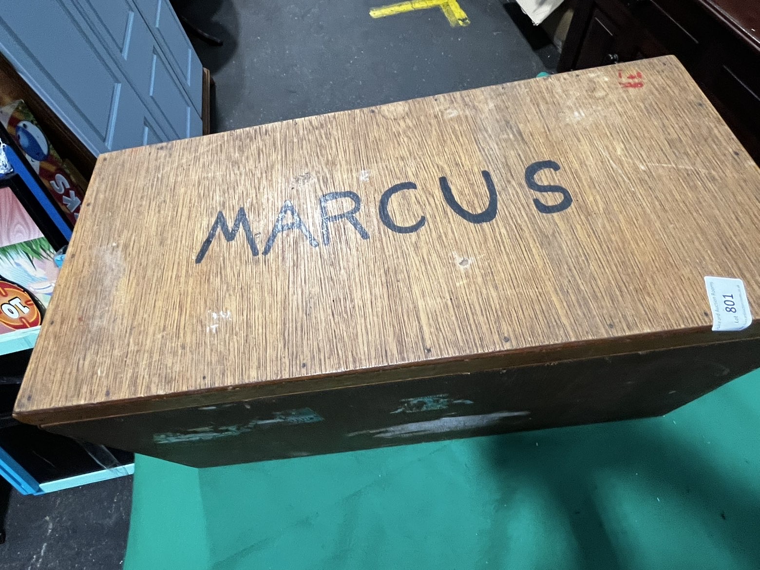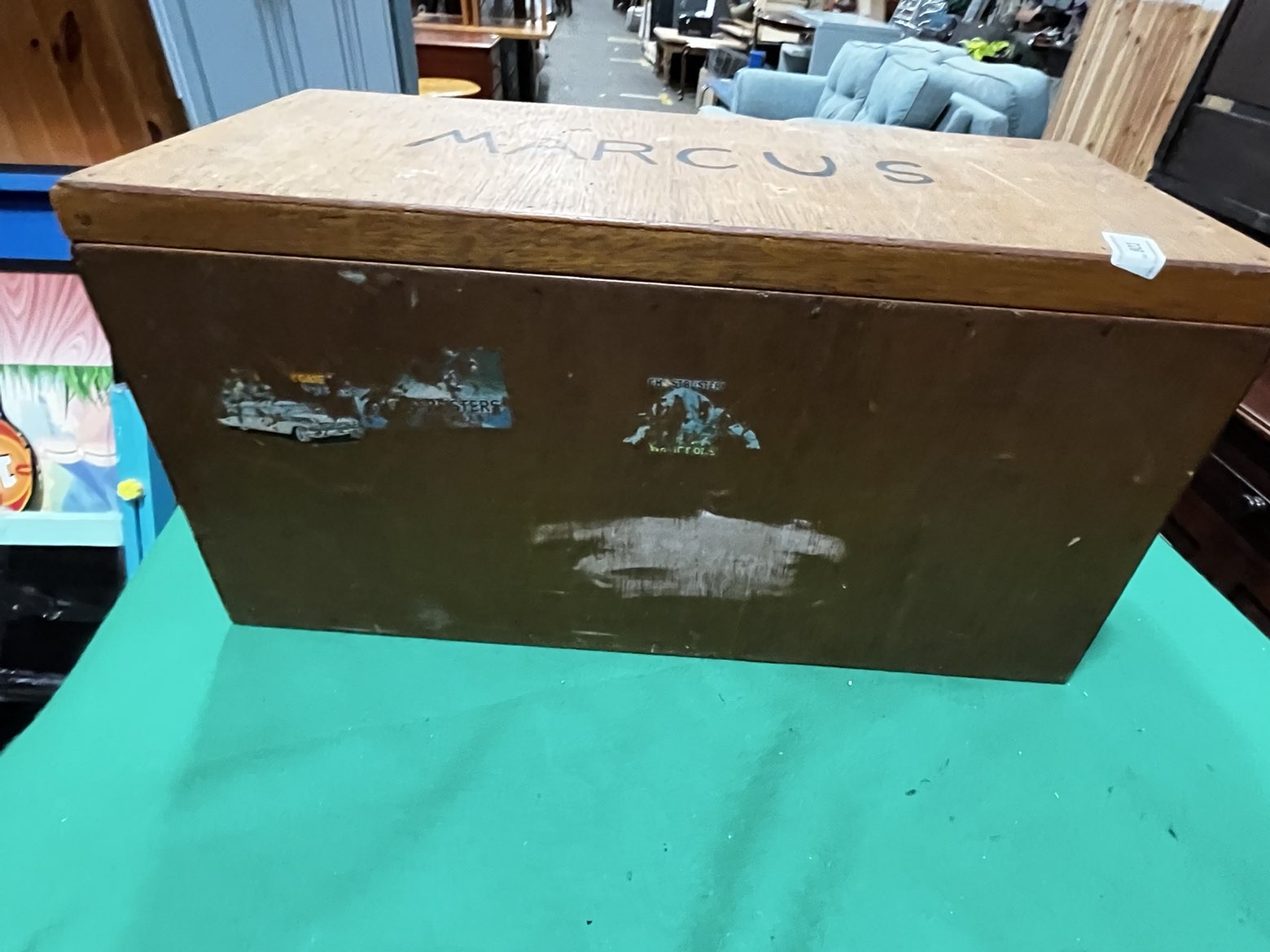 A vernacular wooden storage chest or toy box constructed from plywood panels. The exterior sides are finished with a dark stain, while the top of the lid features a lighter-toned wood veneer with a prominent grain. The lid is attached to the main body by two brass-toned metal butt hinges. The top of the lid features the name MARCUS applied in large black block letters. The underside of the lid bears handwritten inscriptions in black ink including a heart symbol and the names Gareth and J. Kenward. The front panel features several worn and degraded stickers related to the Ghostbusters franchise, including the Ecto-1 vehicle and the classic logo. The chest is of simple box construction with butt joints and lacks handles or a locking mechanism. It currently bears a Liskeard Auction Rooms lot label.