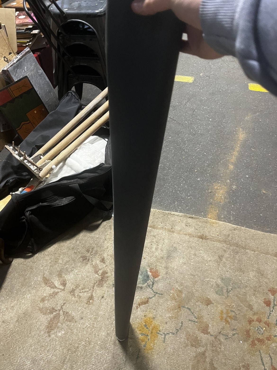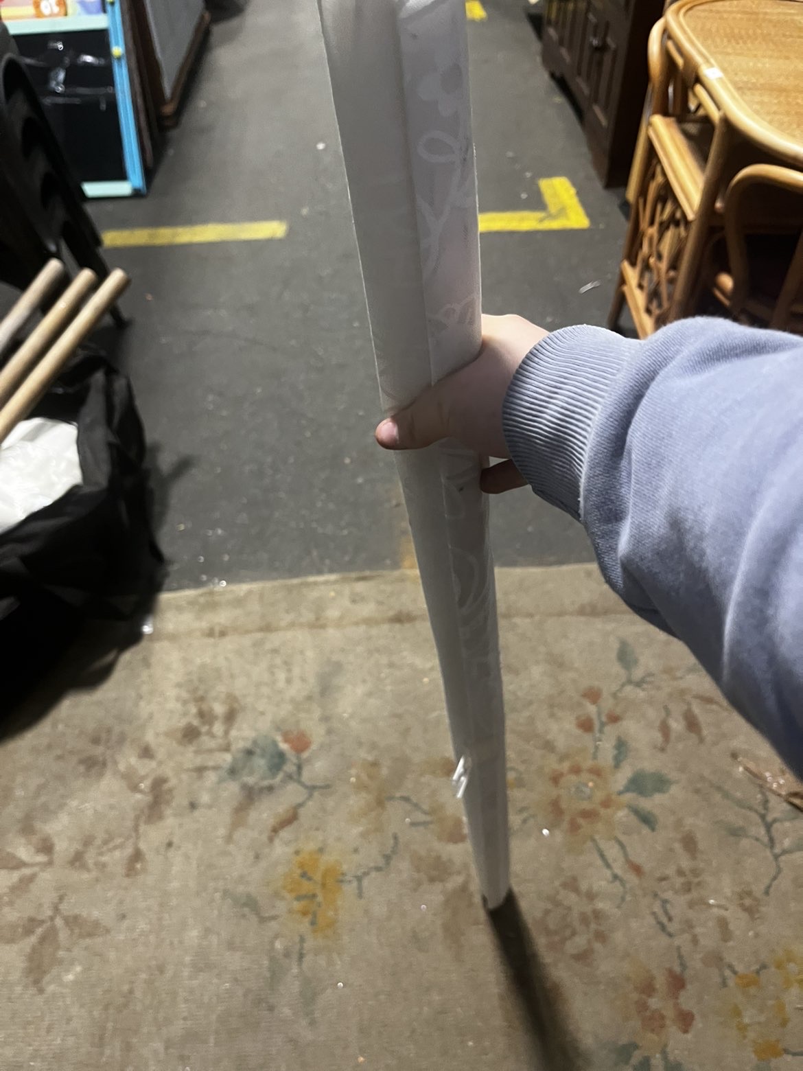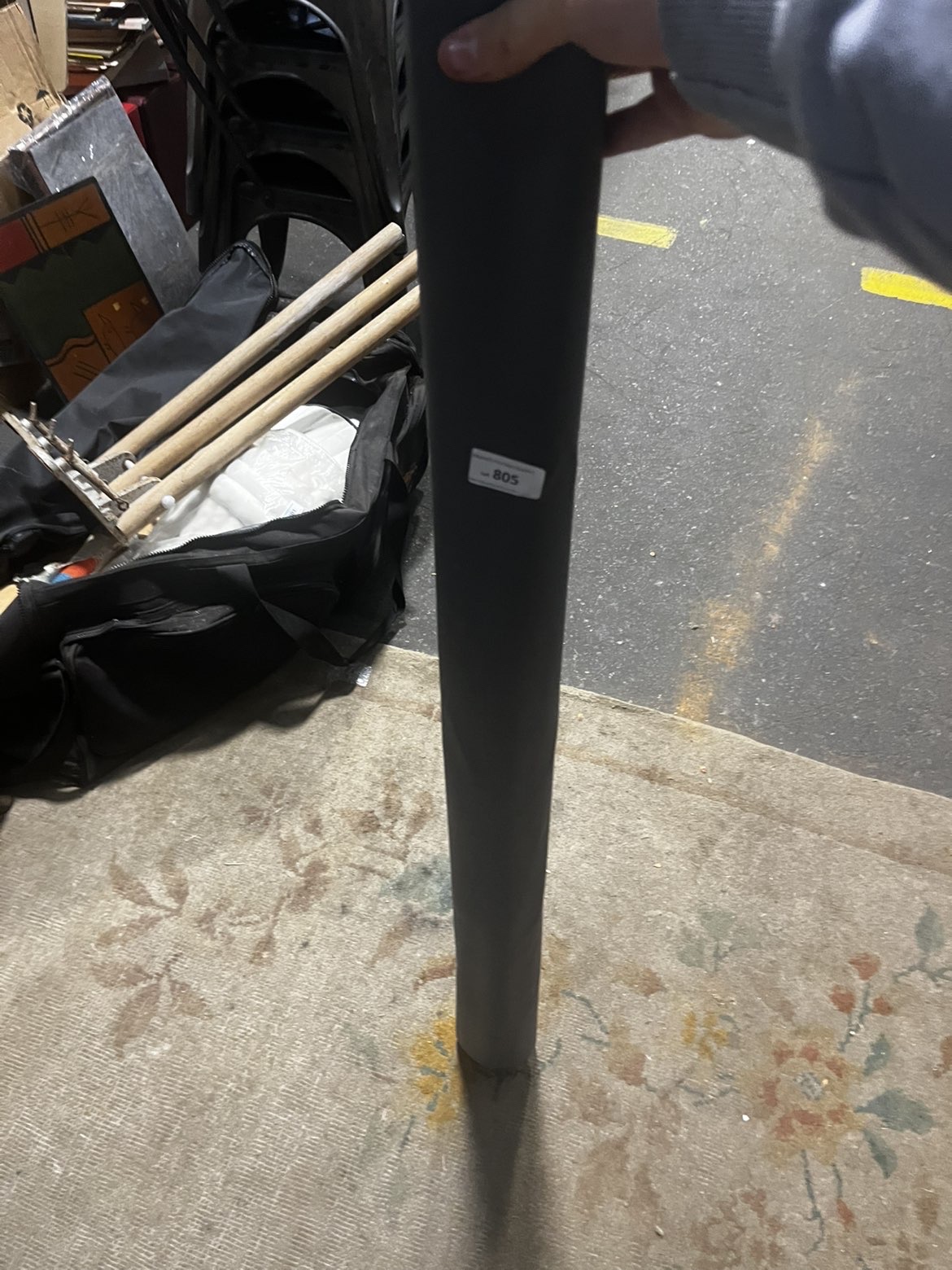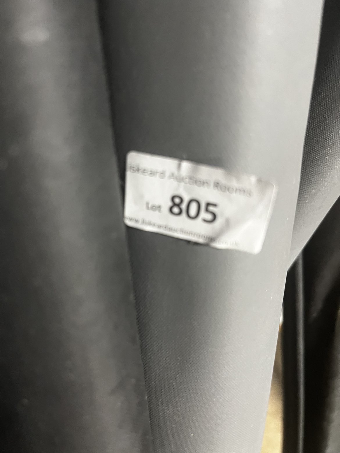 The lot comprises an assortment of rolled window blinds. The collection of blinds includes one white roll with a faint decorative scroll pattern and several black or charcoal grey rolls, appearing to be of a blackout variety. One of the black rolls bears a white adhesive label from Liskeard Auction Rooms, identified as Lot 805.