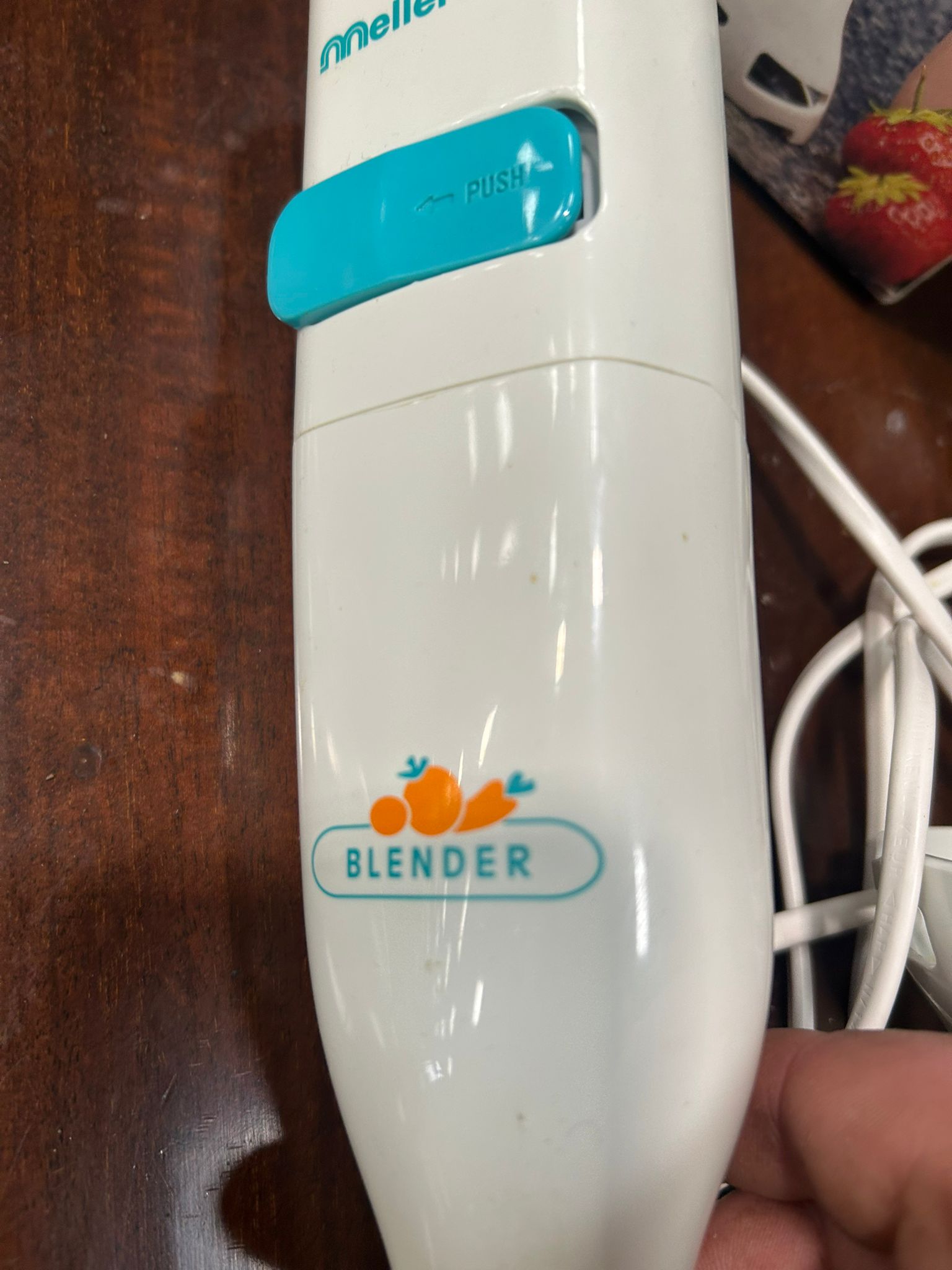 A collection of two vintage electrical kitchen appliances, each provided with its original retail packaging. The first item is a Mellerware immersion hand blender, featuring a white plastic motor unit with a teal push-activation button. The housing bears the manufacturer name and a graphic logo of an orange and carrot above the word blender. It is accompanied by a detachable white plastic blending wand housing a stainless steel blade. The second item is a Moulinex electric carving knife, identified on the packaging as model 246. The device features a cream and dark brown plastic body with an integrated handle and power switch. It is accompanied by a set of interlocking serrated metal blades. Both appliances are equipped with white power cords and standard UK three-pin plugs. The original cardboard boxes display product imagery and branding, with the Moulinex box bearing the French title Couteau Electrique.