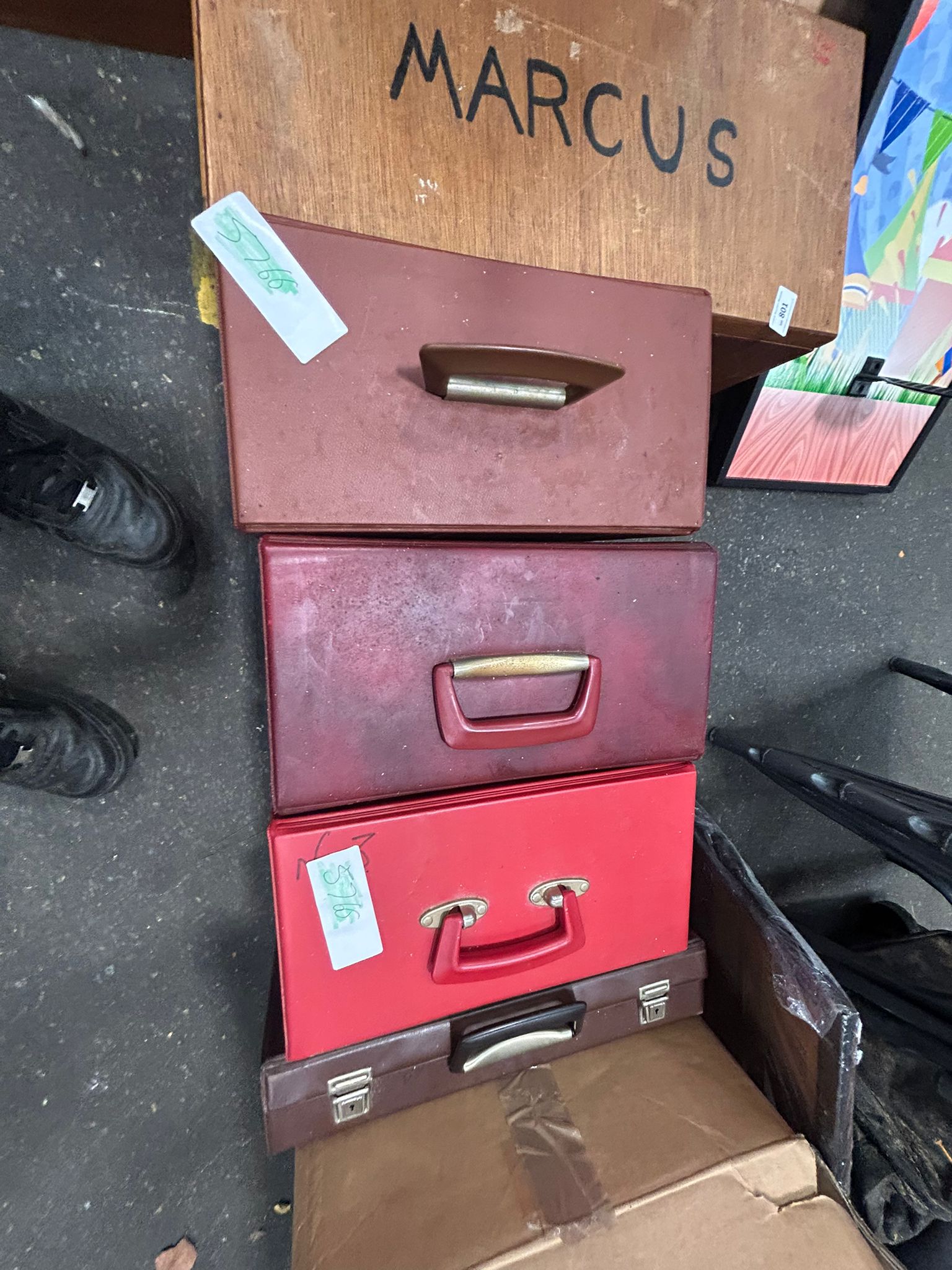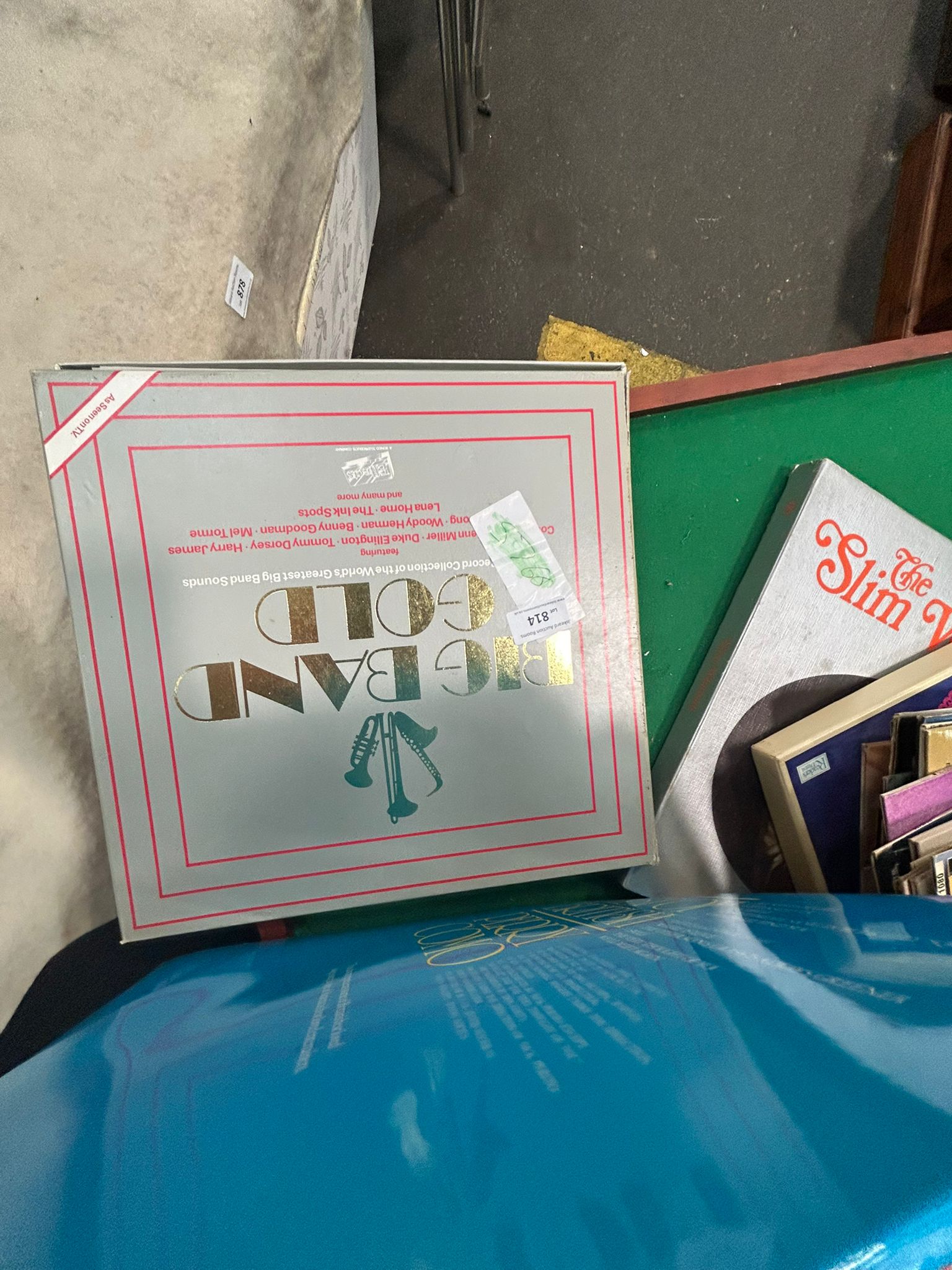 A collection of vinyl long-play (LP) records comprising approximately 60 to 80 albums, primarily focused on mid-20th-century easy listening, vocal pop, big band, and soundtracks. Notable box sets include Big Band Gold featuring artists such as Glenn Miller and Duke Ellington, The Slim Whitman Story, and South Sea Island Greetings. Identified performers include Max Bygraves, Mario Lanza, Perry Como, and Oscar Harris. Soundtracks include the Rodgers and Hammerstein musical Oklahoma!. The records are released on various labels including RCA Camden, Capitol, Philips, and Spectro-Stereo Dimension. Several sleeves feature original UK retail price stickers. The lot is accompanied by four vintage vinyl-wrapped record carrying cases with plastic handles in shades of red, maroon, burgundy, and brown, as well as a wooden crate with the name MARCUS stencilled in black ink.