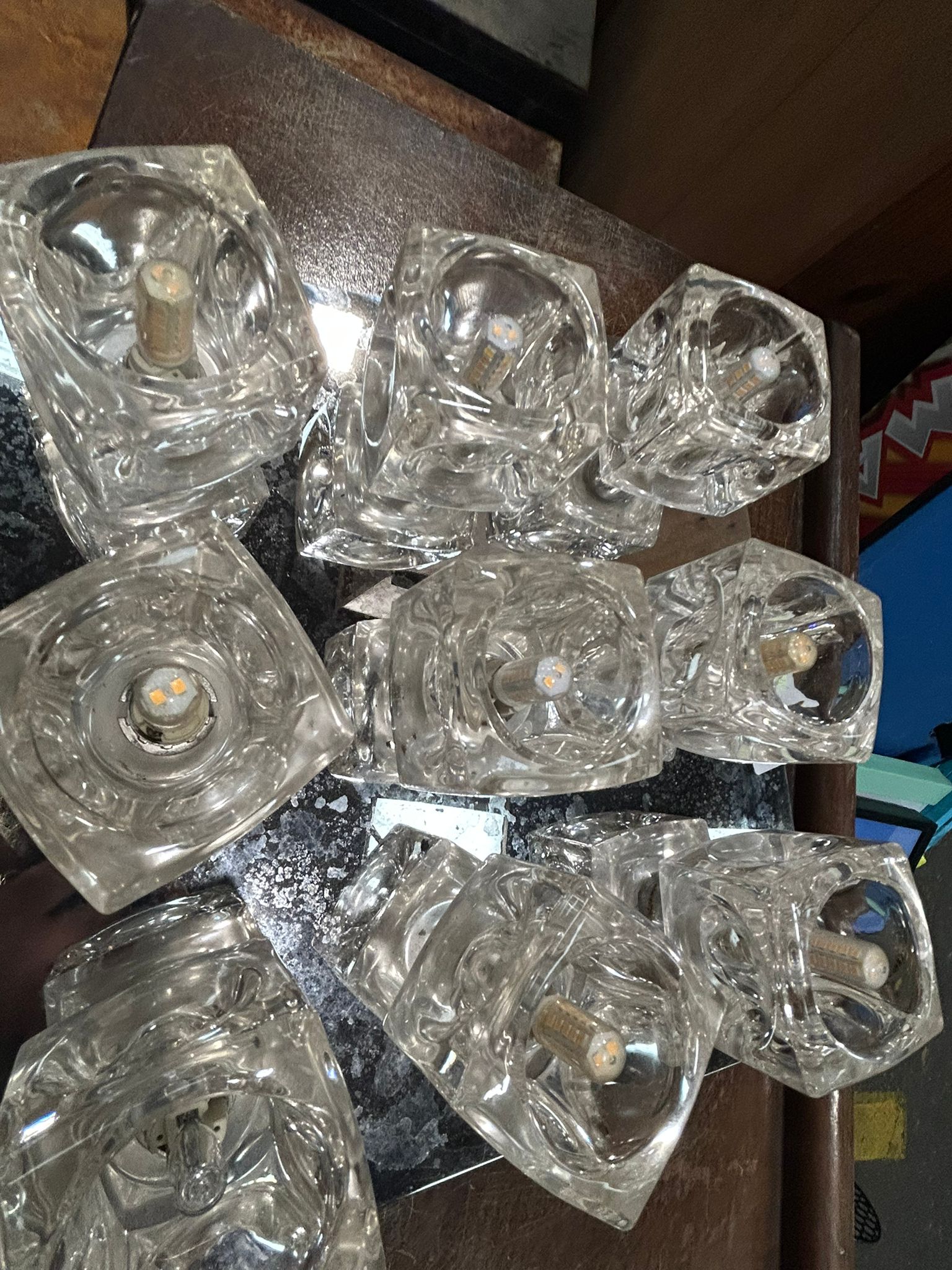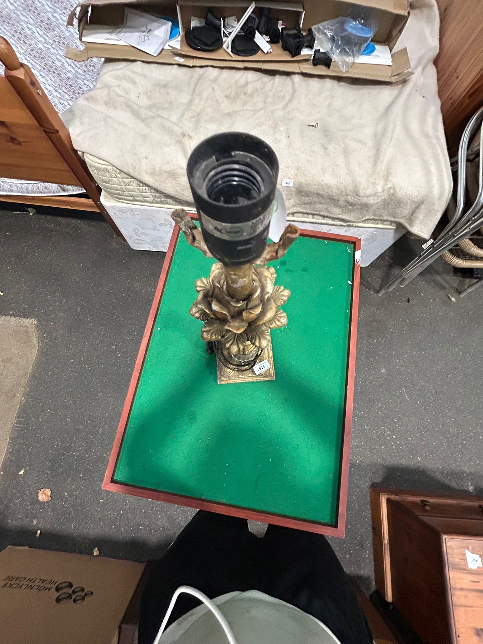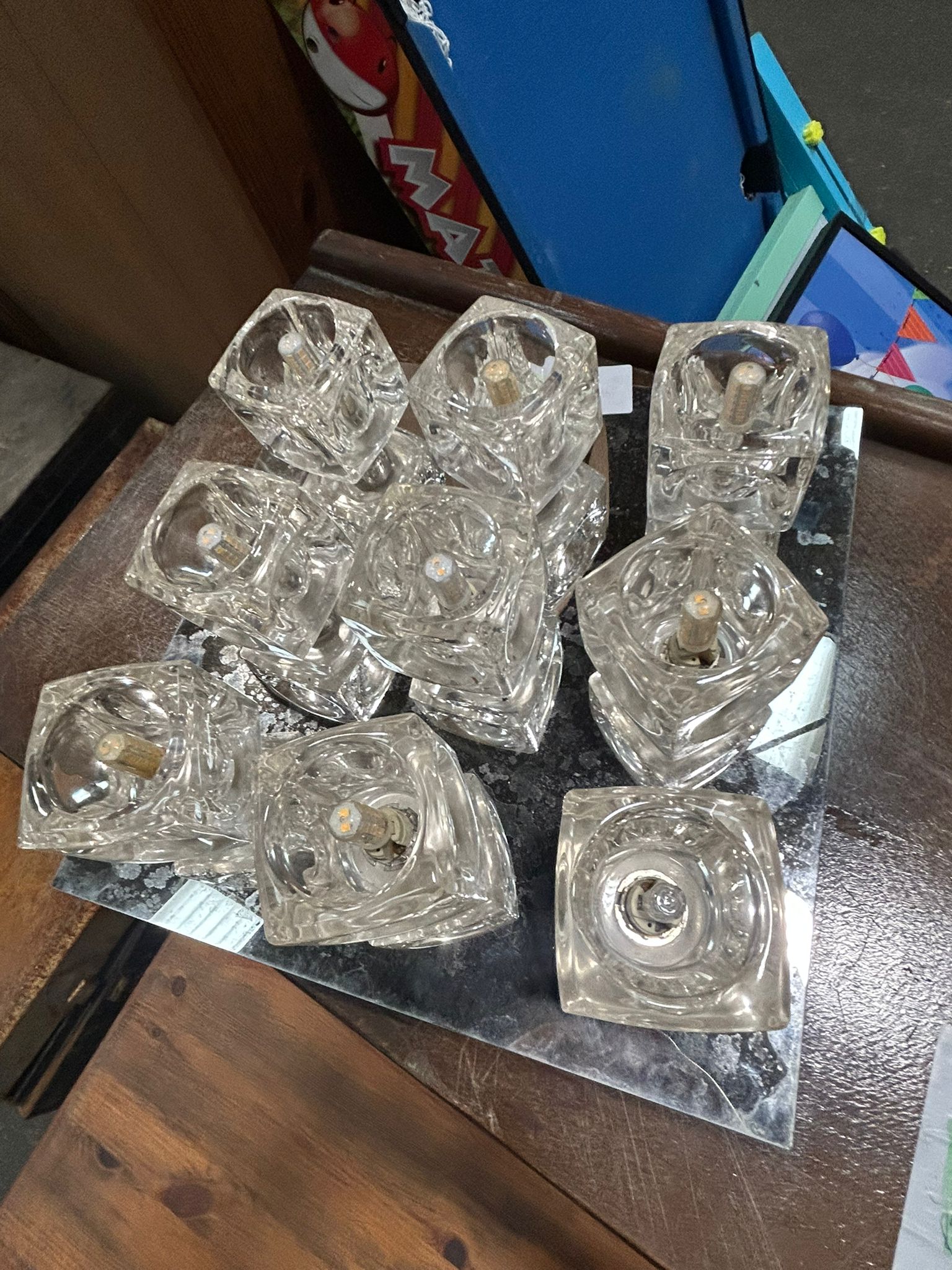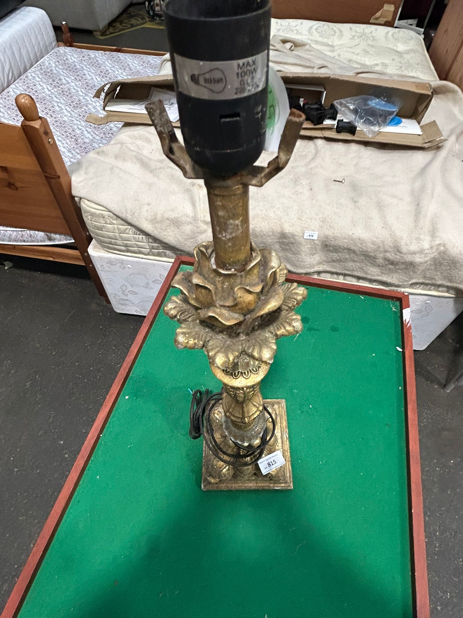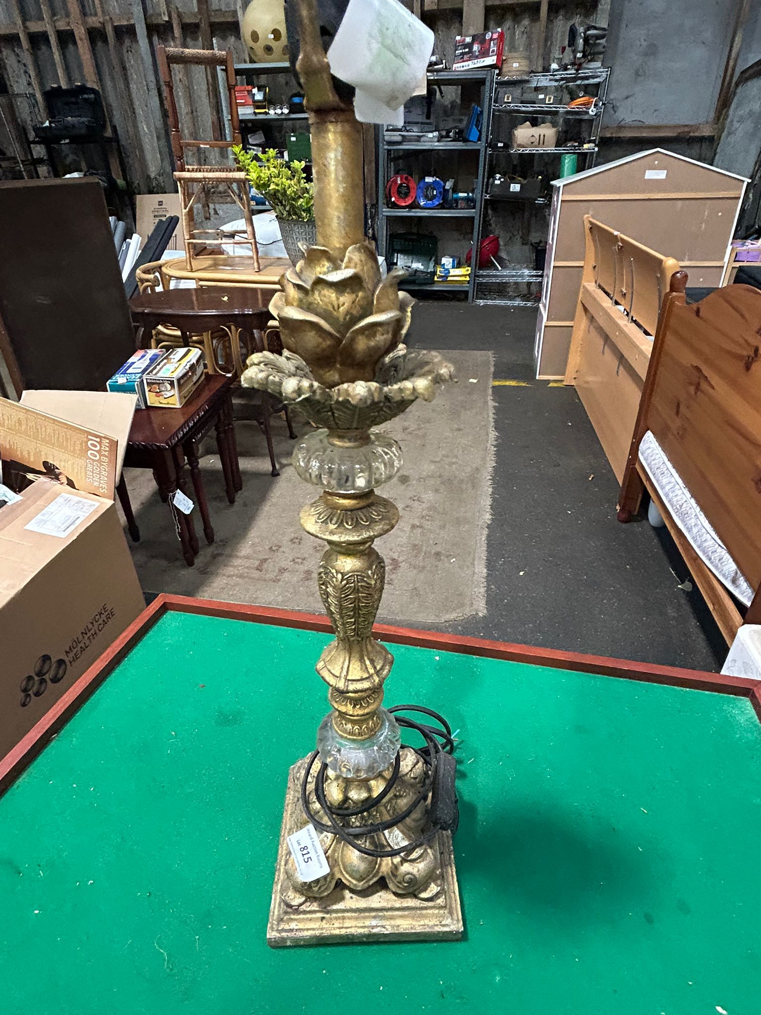This lot consists of two distinct lighting fixtures. The first is a table lamp in the Hollywood Regency style, featuring a gilt-finished body likely constructed from cast resin or plaster. The design includes a tiered square base with acanthus leaf feet, a slender fluted stem, and a central decorative motif of a large, multi-petalled blooming flower. The stem is further embellished with two faceted clear glass knops. It is equipped with a black power cord, a modern UK 3-pin plug, and a B22 bayonet socket. A safety label on the socket indicates a maximum rating of 100W GLS at 220-240V. The second item is a contemporary wall or ceiling light fixture composed of nine textured clear glass cubes arranged in a three-by-three grid. These cubes are mounted to a square mirrored metal backplate. The fixture currently contains several LED bulbs.