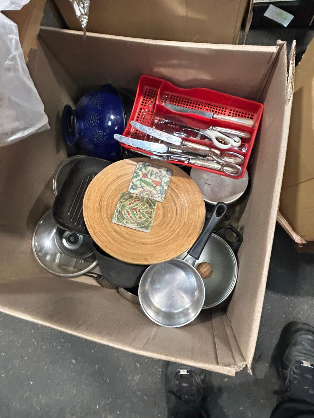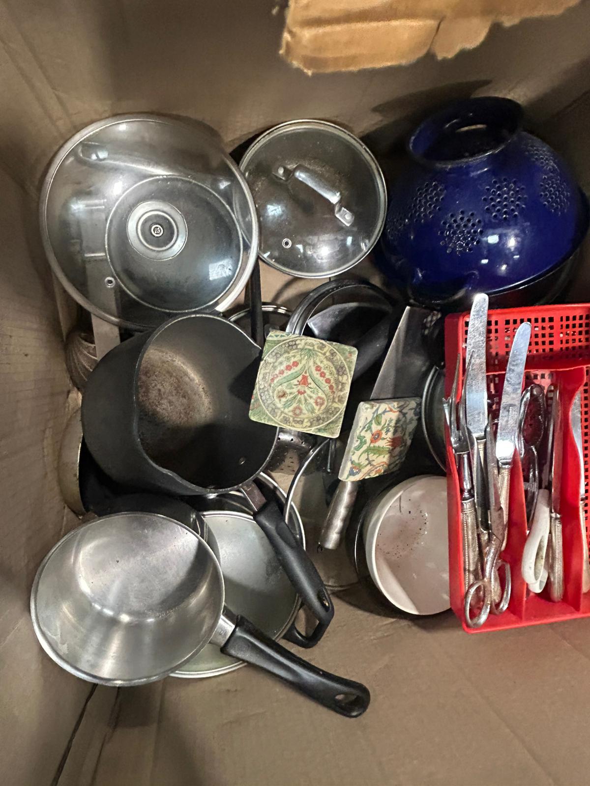 A varied collection of items contained within two cardboard boxes. The first box primarily contains children’s literature and toys, featuring a large mesh bag of multi-coloured plastic play balls and a boxed set of 200 LED warm white string lights. Notable book titles include Postman Bear by Julia Donaldson and Axel Scheffler, various softcover Horrid Henry titles by Francesca Simon, and books from the Oxford Reading Tree Read at Home series, alongside activity and colouring books such as Silly Stickers Puppies and Jungle Colouring. The second box contains an assortment of kitchenware and tableware. This includes several stainless steel and non-stick saucepans with composite handles and matching glass lids, a blue-painted metal colander, and a turned wood serving tray. Tableware comprises white ceramic plates with floral transfer designs, milk-glass style bowls, a blue glazed ceramic mug, and ceramic coasters with Iznik-style floral patterns. A red plastic cutlery tray holds various stainless steel knives, including examples with worked handles, and kitchen scissors.