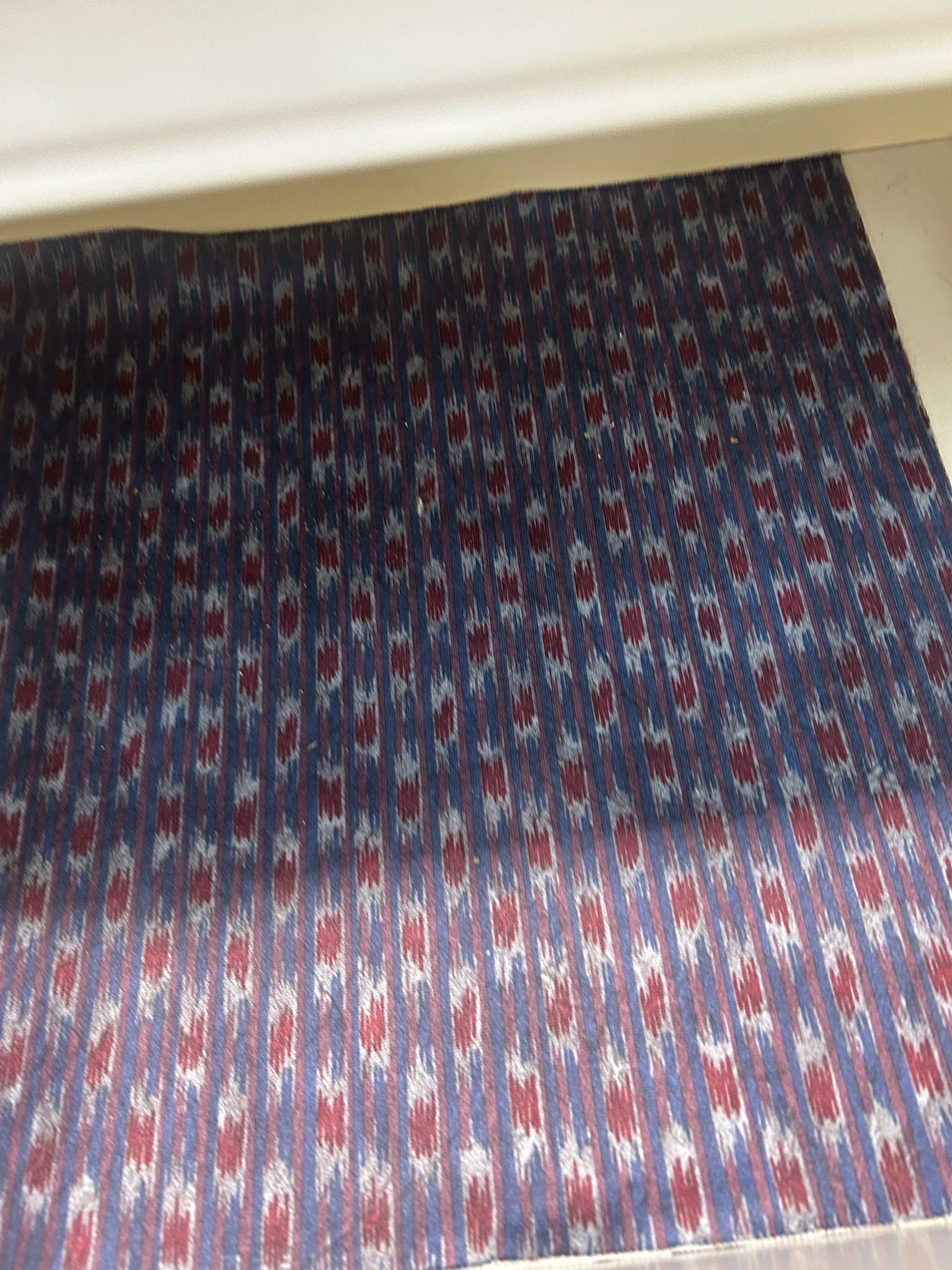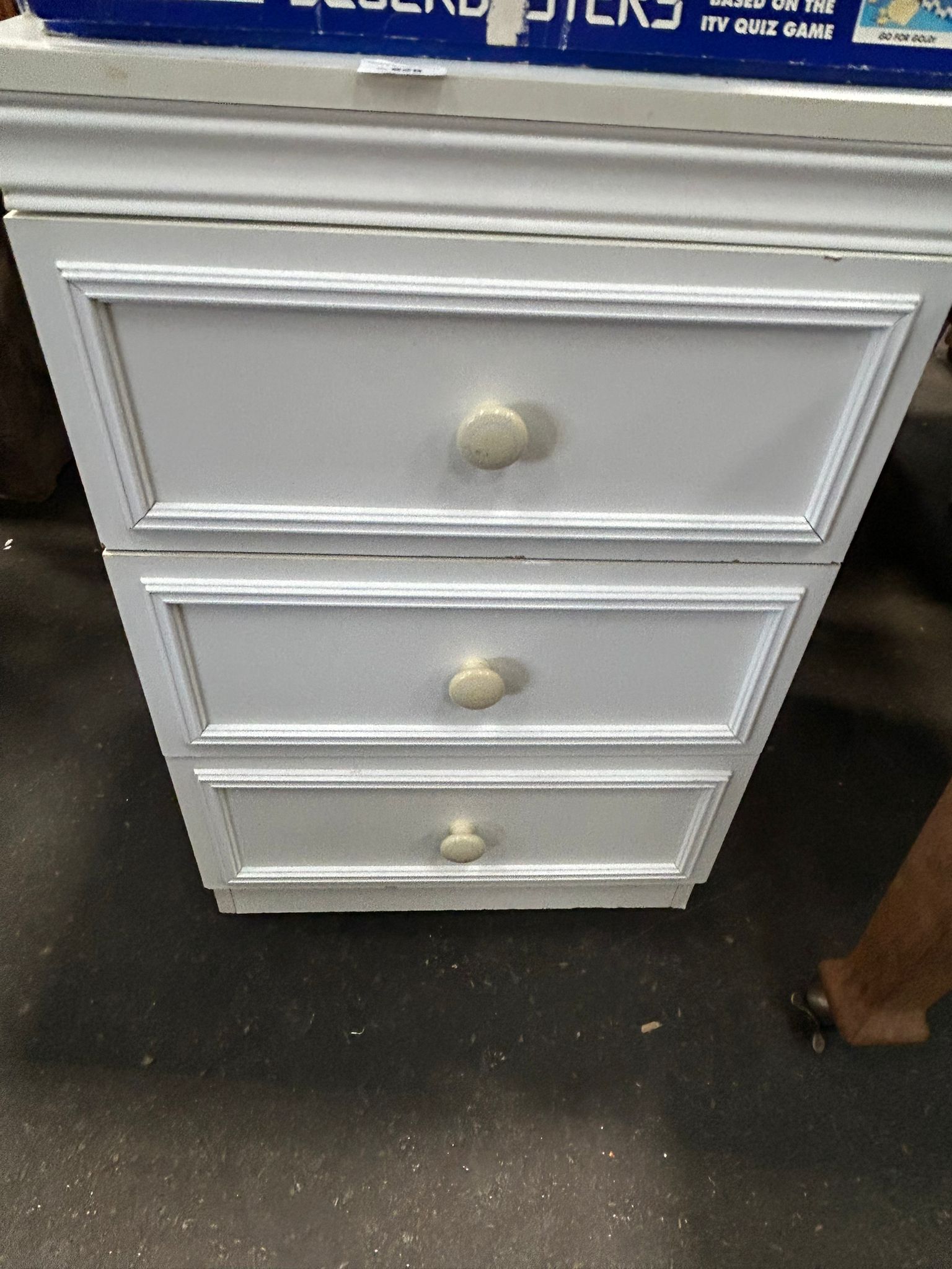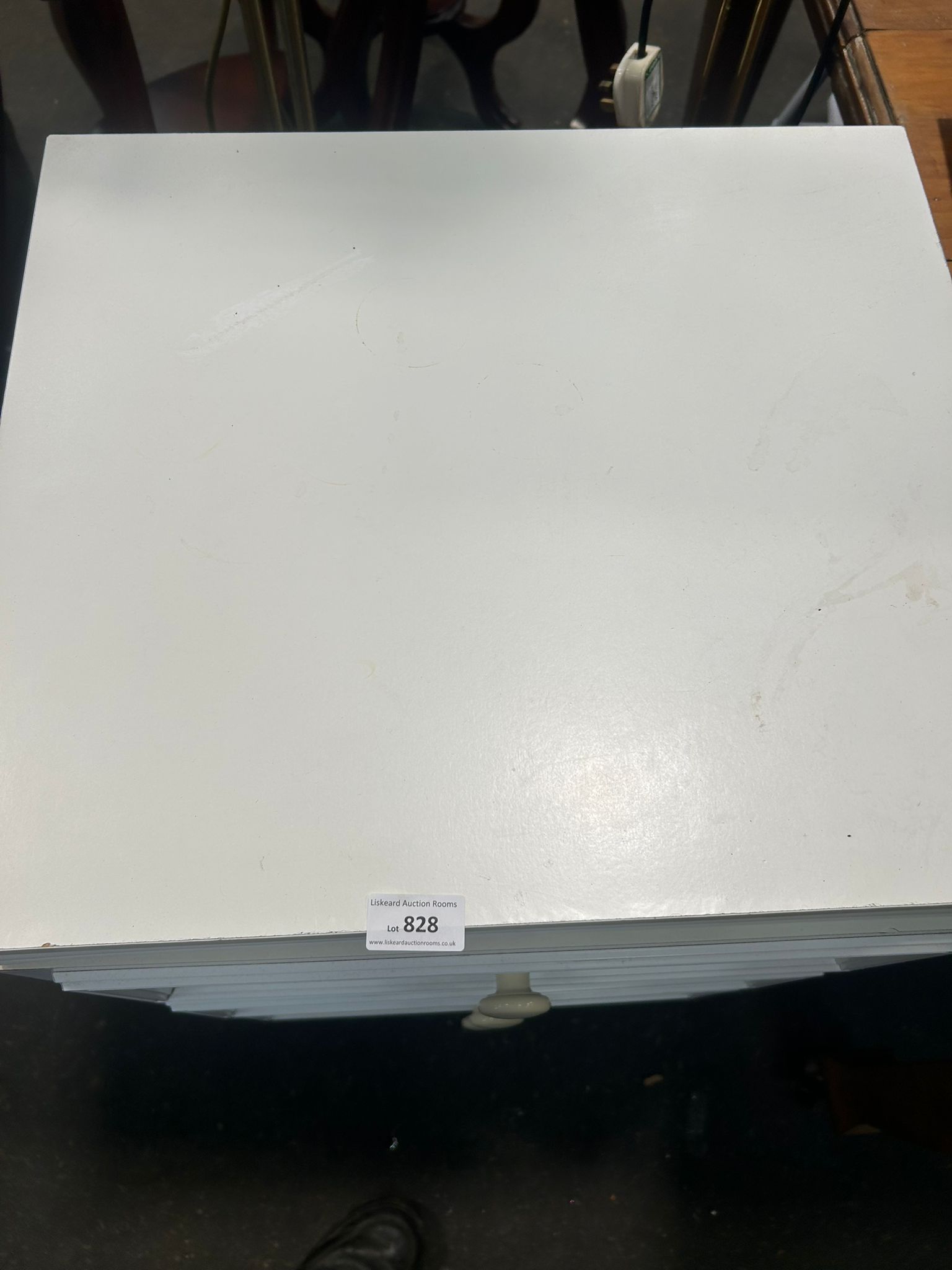 A late 20th-century bedside chest of drawers of mass-produced construction. The carcass and drawer fronts are made from white-painted composite wood, likely MDF or chipboard, with a thin hardboard back panel. The chest features three drawers, each with a decorative recessed-panel front and a central, matching round wooden knob pull painted in a cream finish. The drawer boxes are assembled with stapled or glued joints, and at least one drawer is fitted with a blue, red, and grey patterned ikat-style liner. An auction lot label for Liskeard Auction Rooms reading Lot 828 is attached to the top surface. There is a further small, illegible white sticker on the front top edge. No manufacturer marks are visible.