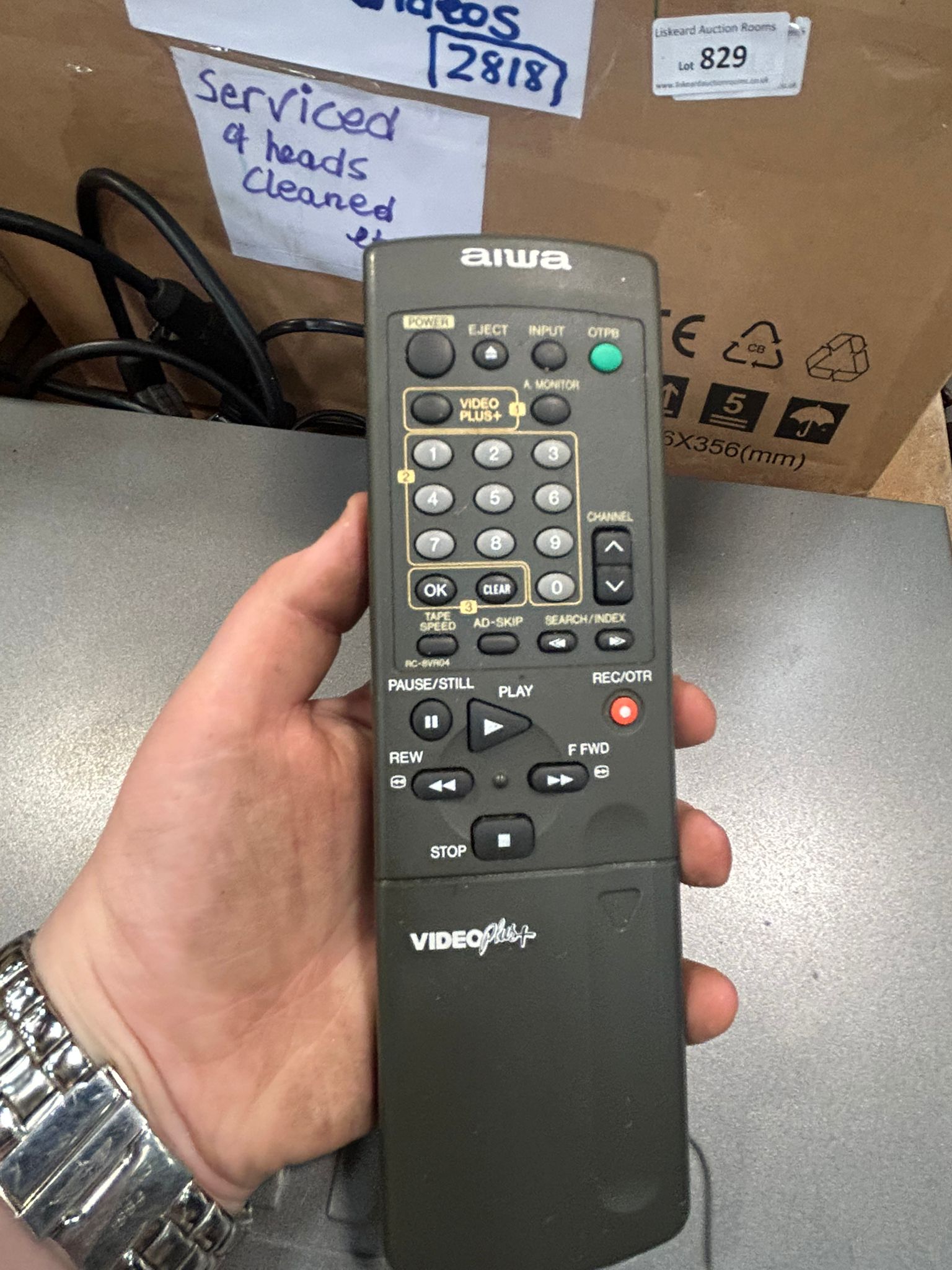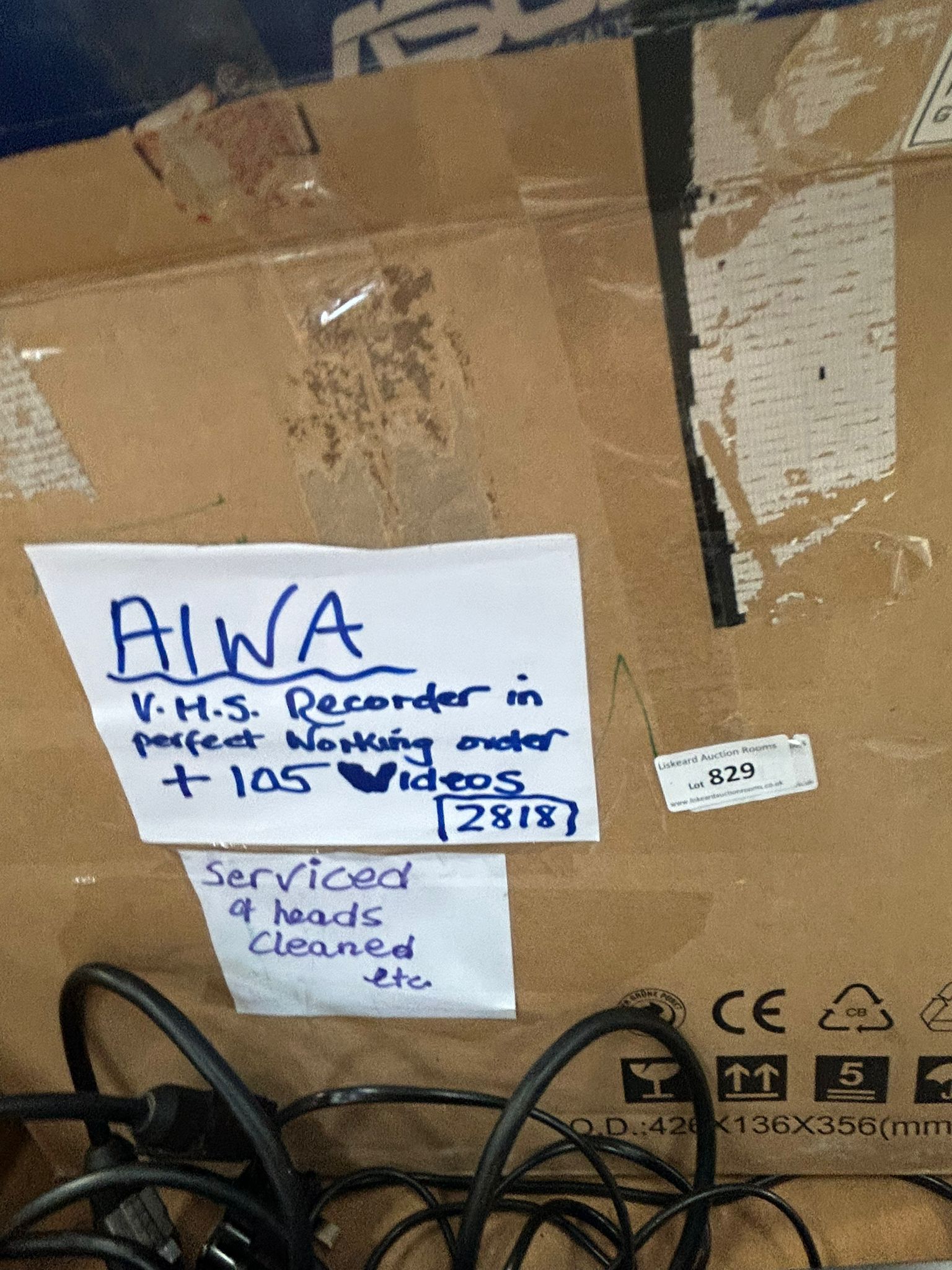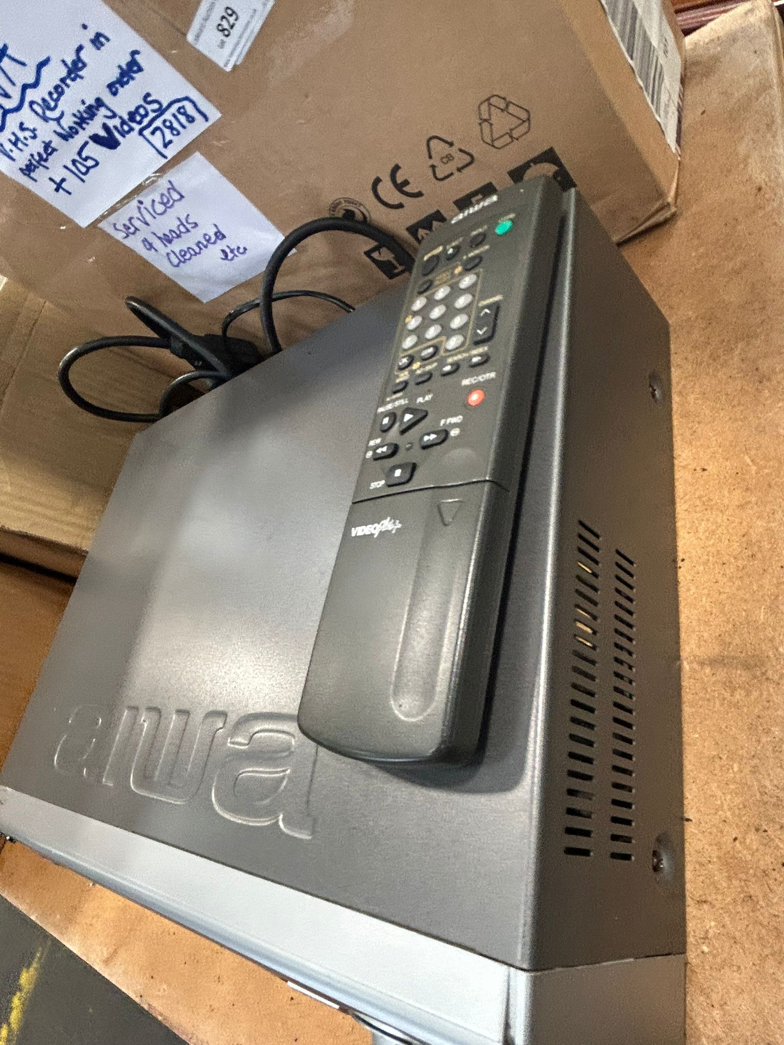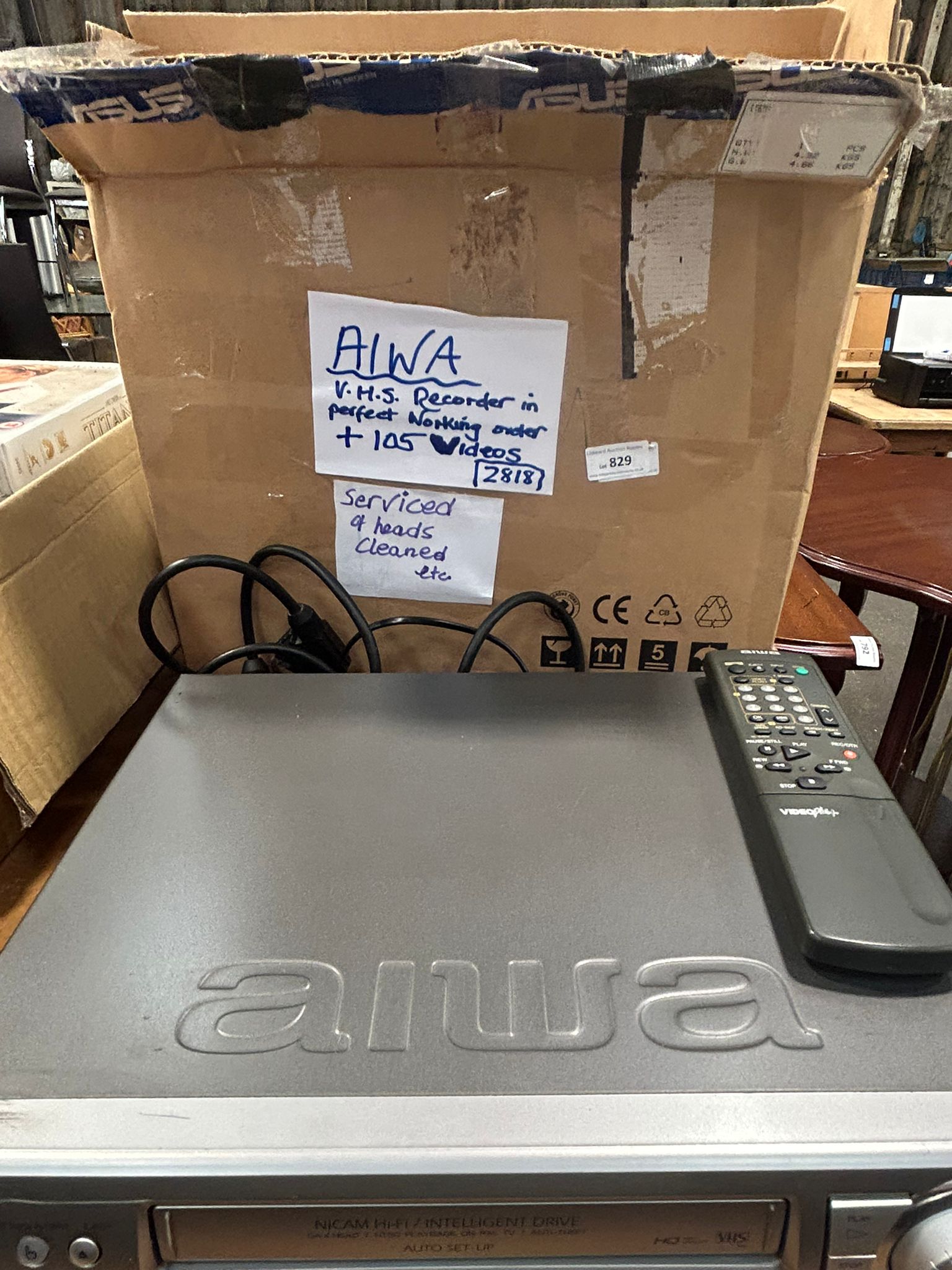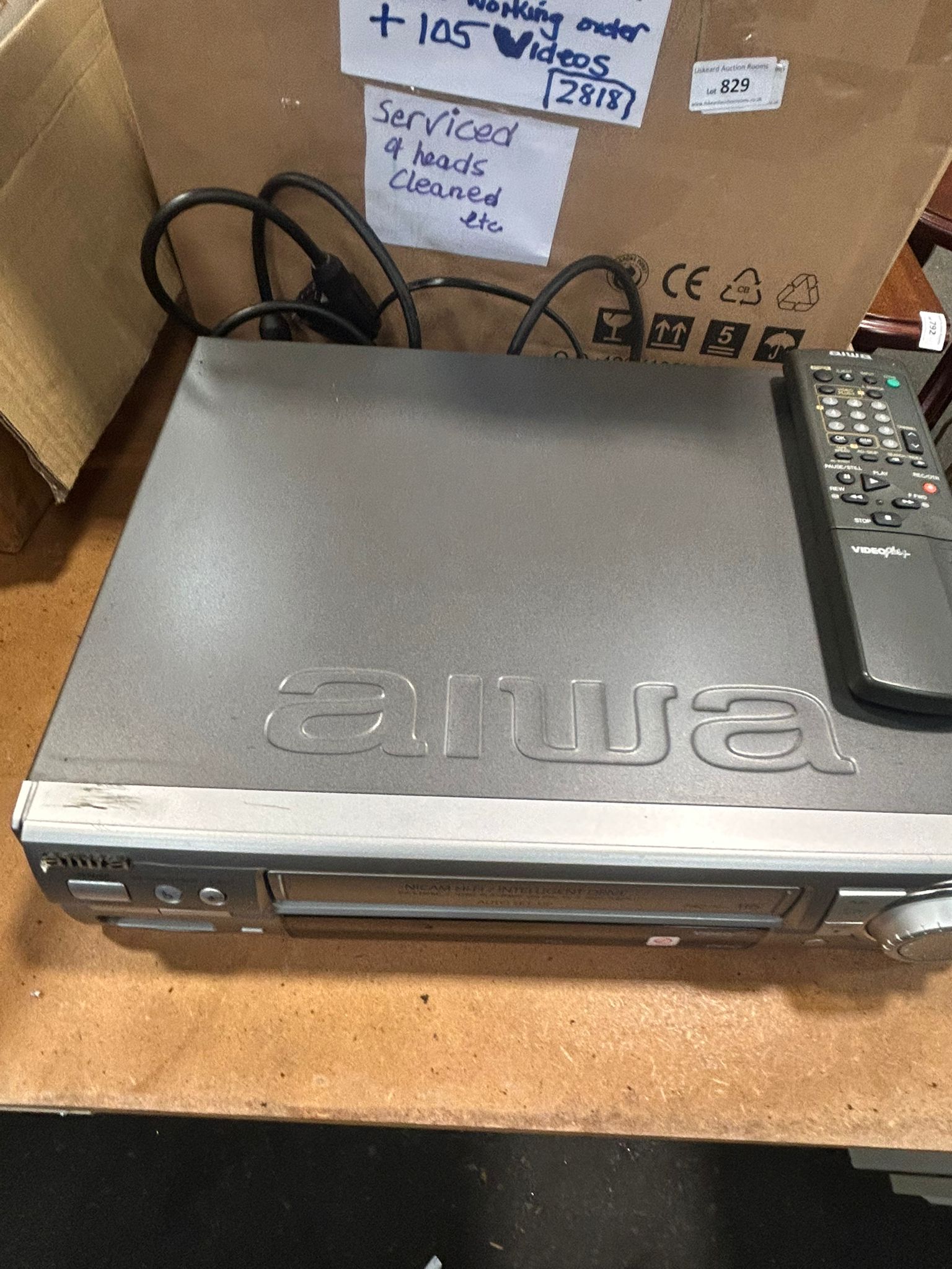 Lot 829: Aiwa Nicam Hi-Fi VHS Video Cassette Recorder with a large box of Videos and Accessories