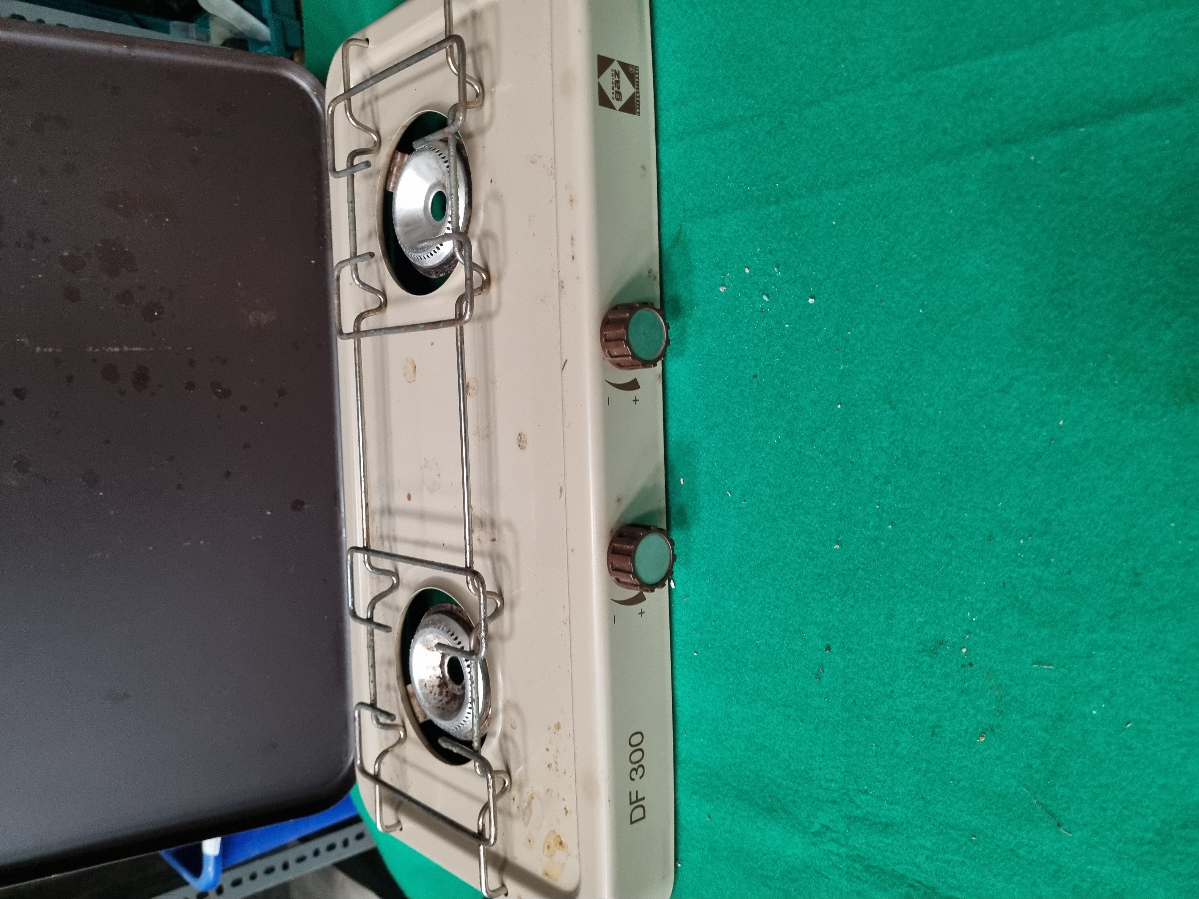 A collection of camping equipment featuring a Campingaz International DF 300 portable gas stove. The stove is constructed with a cream-enamelled rectangular body and a detachable dark brown metal lid. It is equipped with two burners set beneath wire grates and operated by two brown plastic control dials on the front panel. The lot also includes a gas lantern with a frosted glass globe housed within a metal frame, accompanied by its original illustrated cardboard box. Completing the collection is a green plastic fuel canister fitted with a black flexible pouring spout.