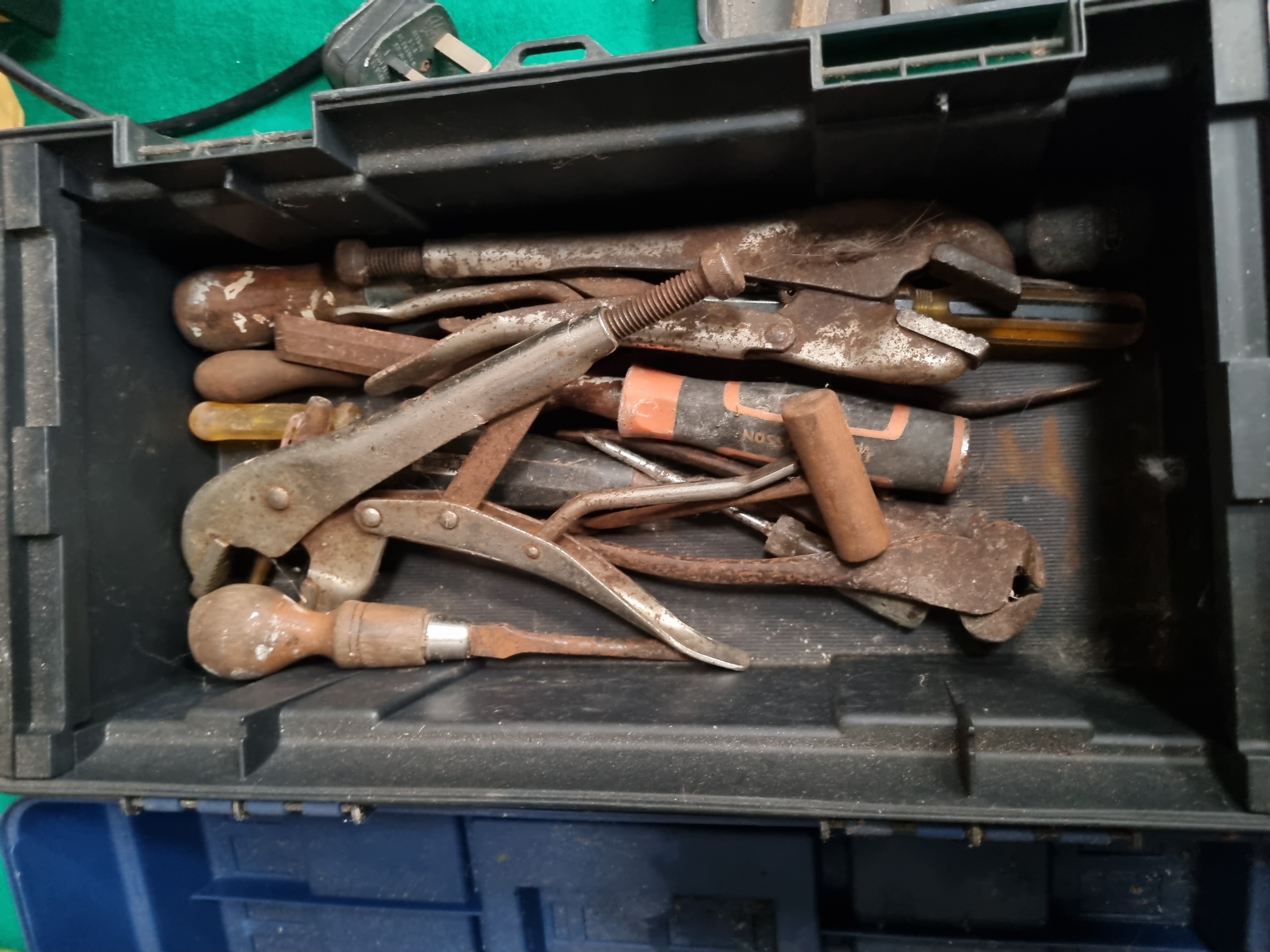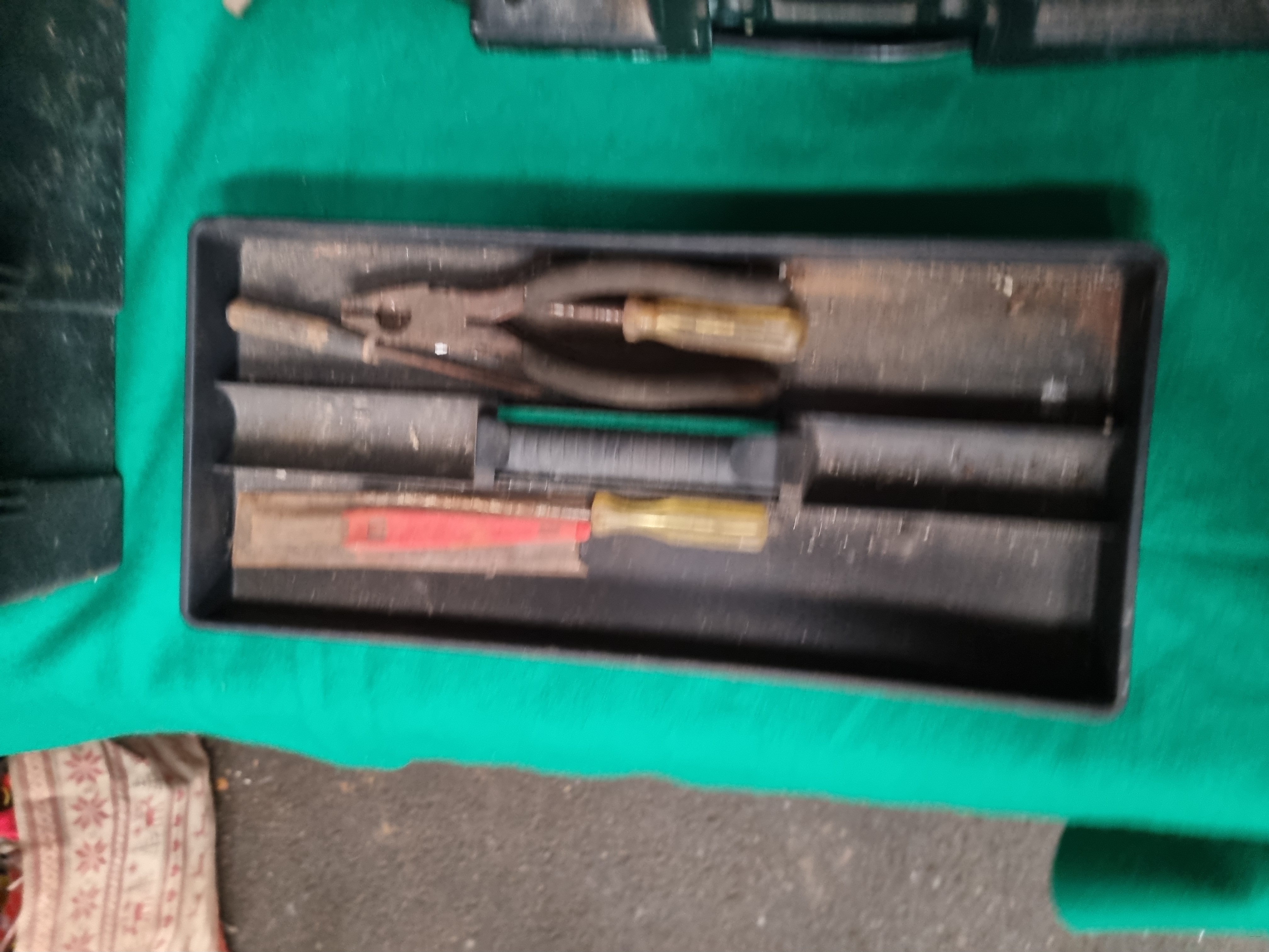 This lot features a Performance Power Tools slide compound mitre saw, model CLM210LSMS, accompanied by an assortment of hand tools. The saw is powered by a 1200W motor with a rated speed of 4200min-1 and is fitted with a 210mm circular blade. The unit incorporates a ball race sliding system, a cast metal base with adjustable mitre and bevel scales, and a plastic motor housing bearing the P SAW PRO label. It is fitted with a standard UK 3-pin plug. The collection includes a black plastic portable toolbox with an internal lift-out tray containing several hand tools. These include two pairs of locking pliers, a pair of pincers, combination pliers, and a selection of screwdrivers with both wooden and plastic handles. A small hand saw and a metal file are also included in the group.