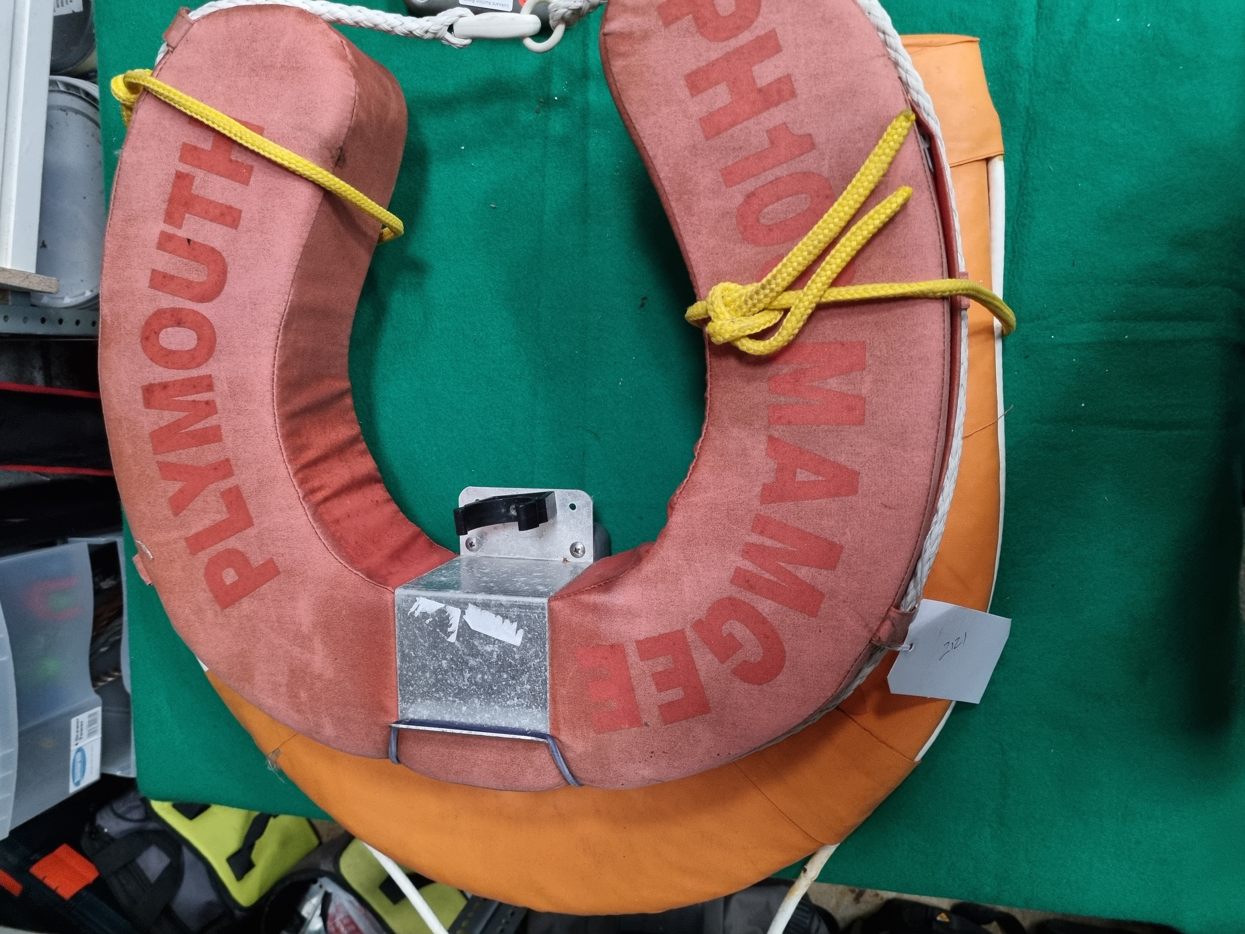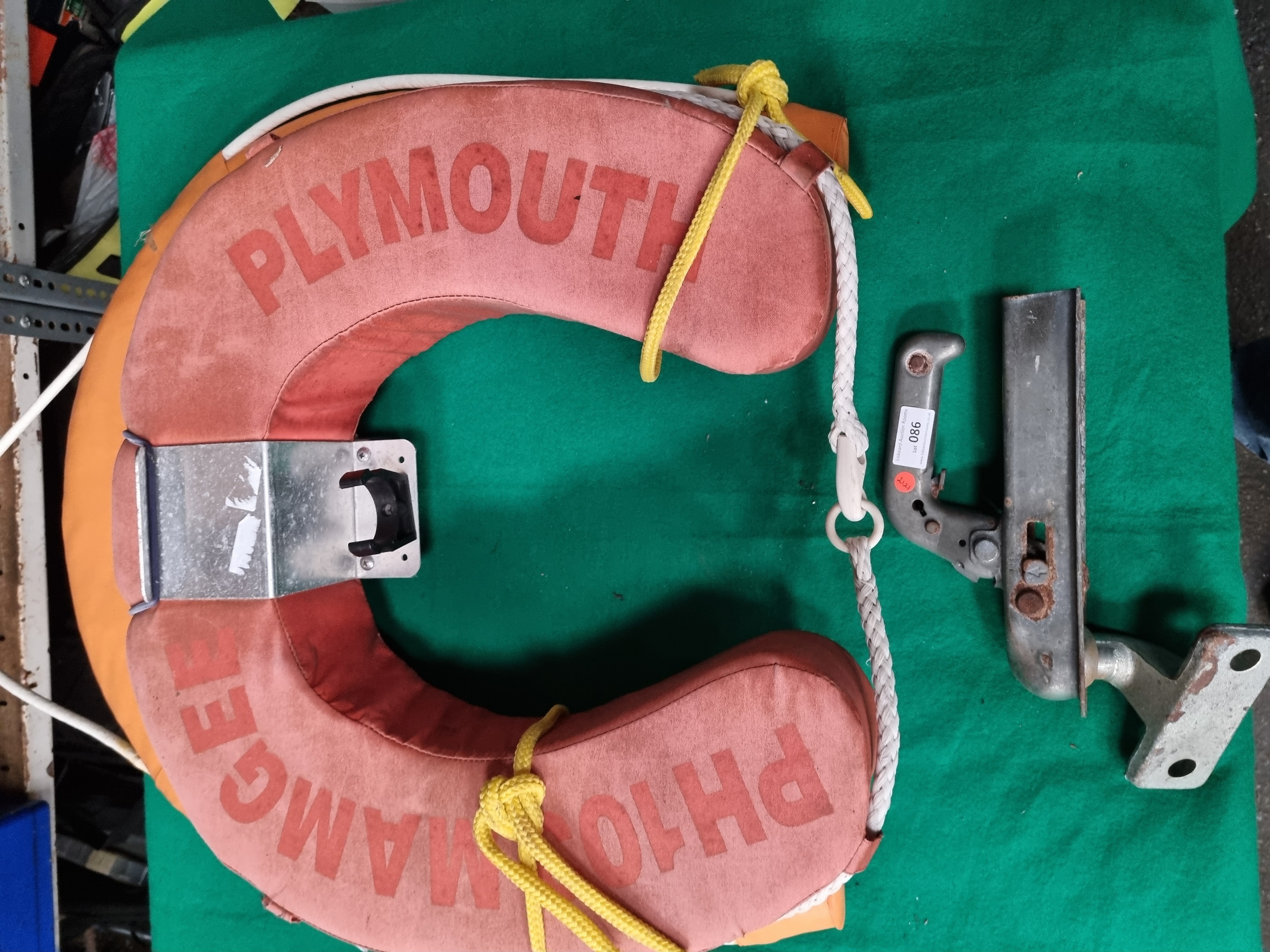 A lot of three items consisting of two vintage marine lifebelts and an automotive trailer hitch. The first item is a horseshoe-style foam lifebelt featuring a faded orange fabric cover. It bears the printed inscriptions PLYMOUTH and PH10 MANGER, corresponding to a Plymouth port registration for a fishing vessel. This item is equipped with a galvanised metal mounting bracket and a combination of yellow and white ropes. The second item is a circular lifebuoy with a bright orange vinyl casing and a white braided perimeter rope. The third item is a heavy-duty metal trailer hitch coupling head designed for universal trailer mounting. It features a manual locking handle mechanism and a mounting plate with two pre-drilled holes for attachment.
