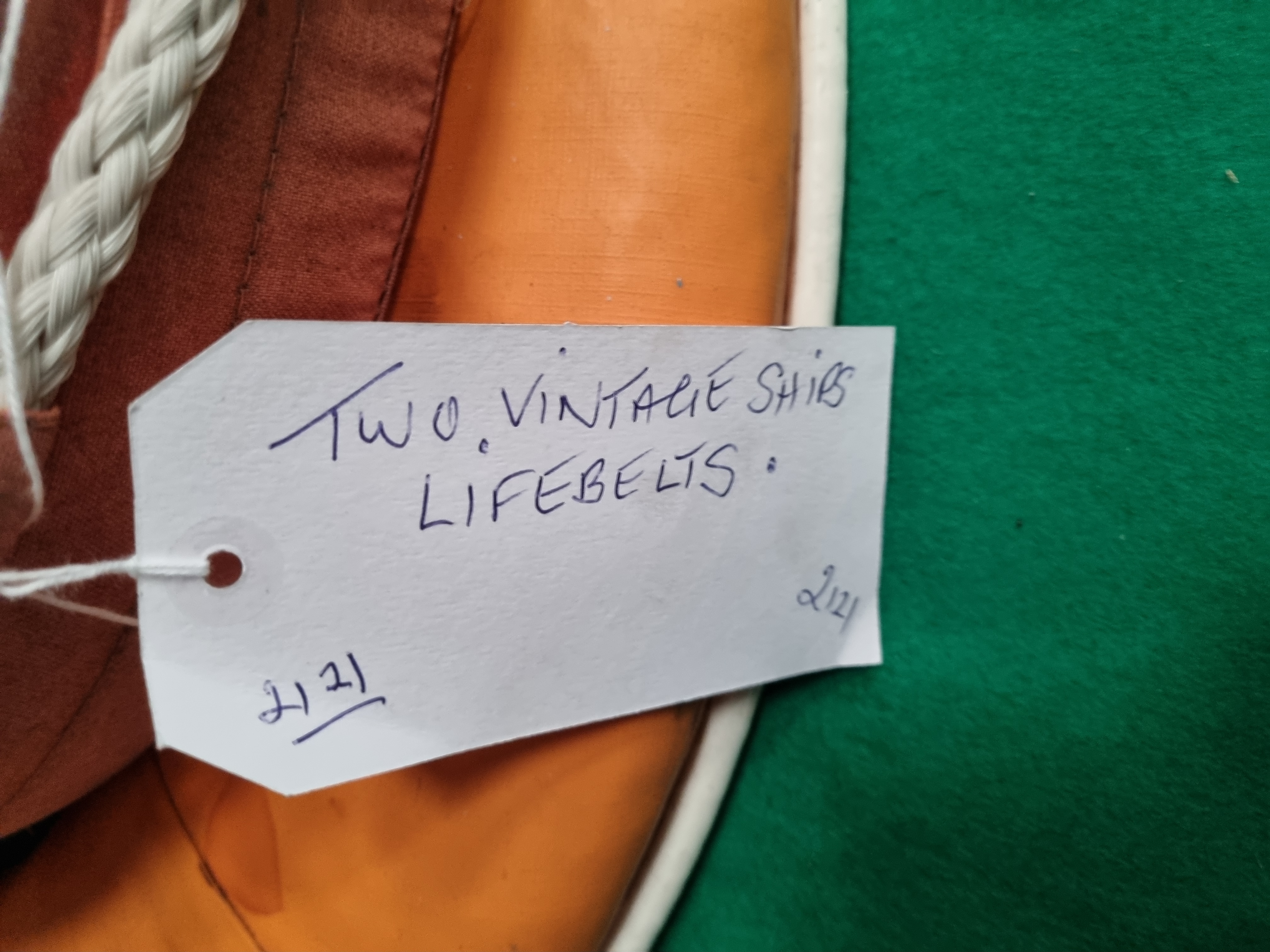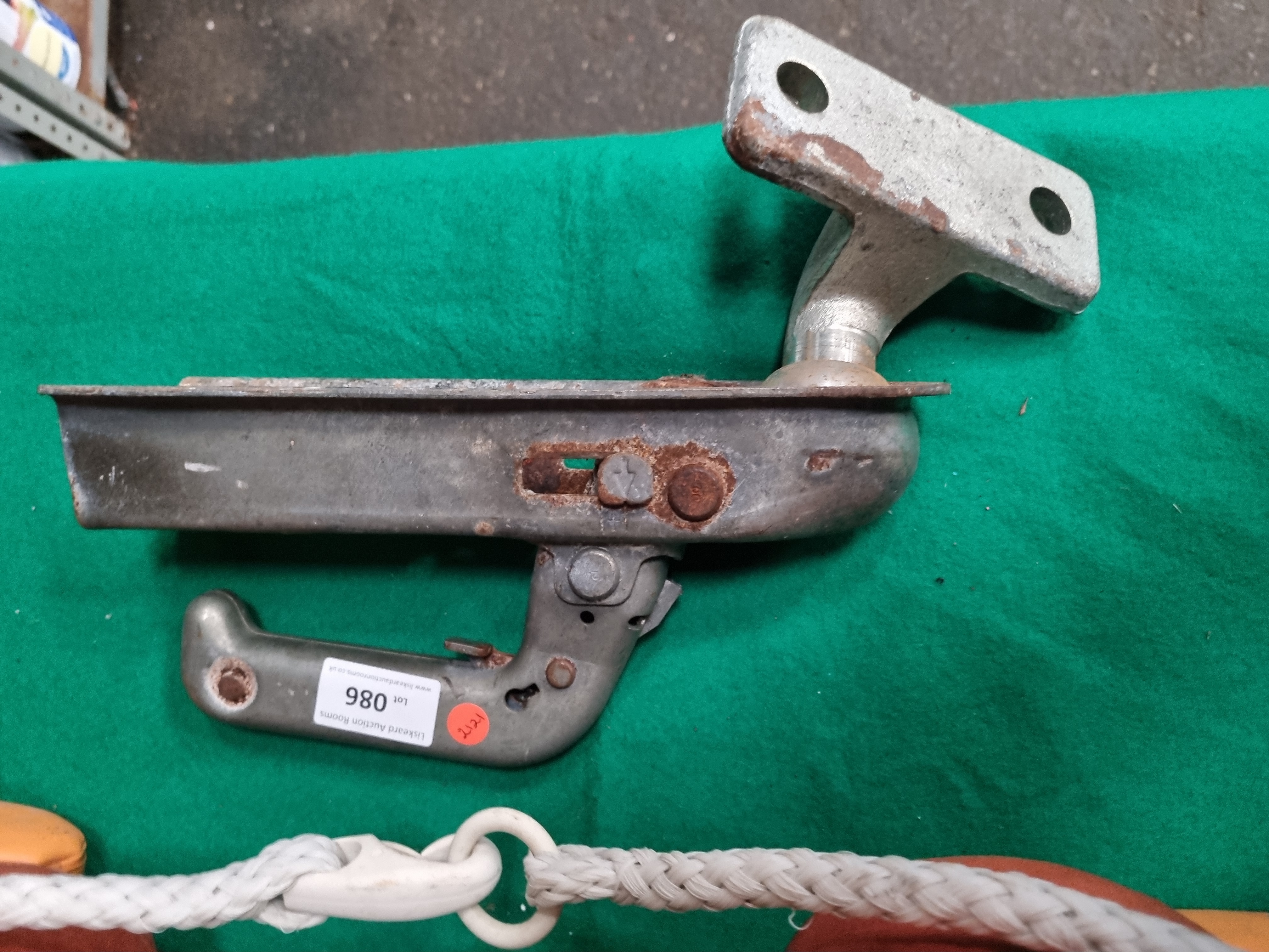 Lot 86: Three items comprising two vintage marine lifebelts and a metal trailer hitch coupling