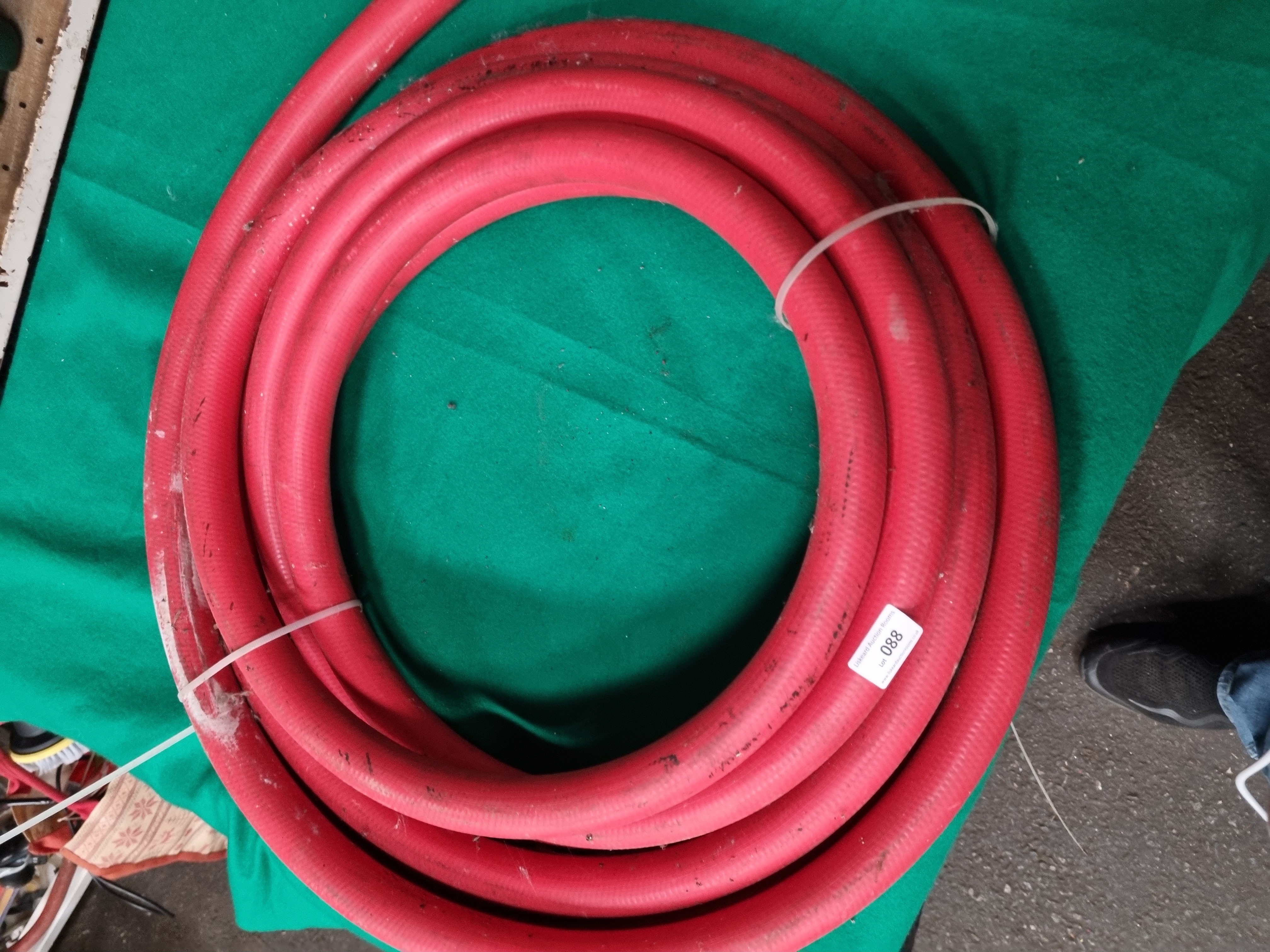 This lot consists of two industrial supply items. The first is a coil of red heavy-duty reinforced rubber hose, approximately 25mm to 30mm in outer diameter. The hose features a multi-layered construction with internal reinforcement, typical of industrial air or water hoses. It is currently secured with white plastic cable ties and bears a lot label for Liskeard Auction Rooms (Lot 088). The second item is a substantial coil of fine-gauge galvanised steel wire, suitable for fencing, binding, or agricultural applications. No manufacturer markings, model numbers, or specific length ratings are visible on either item.
