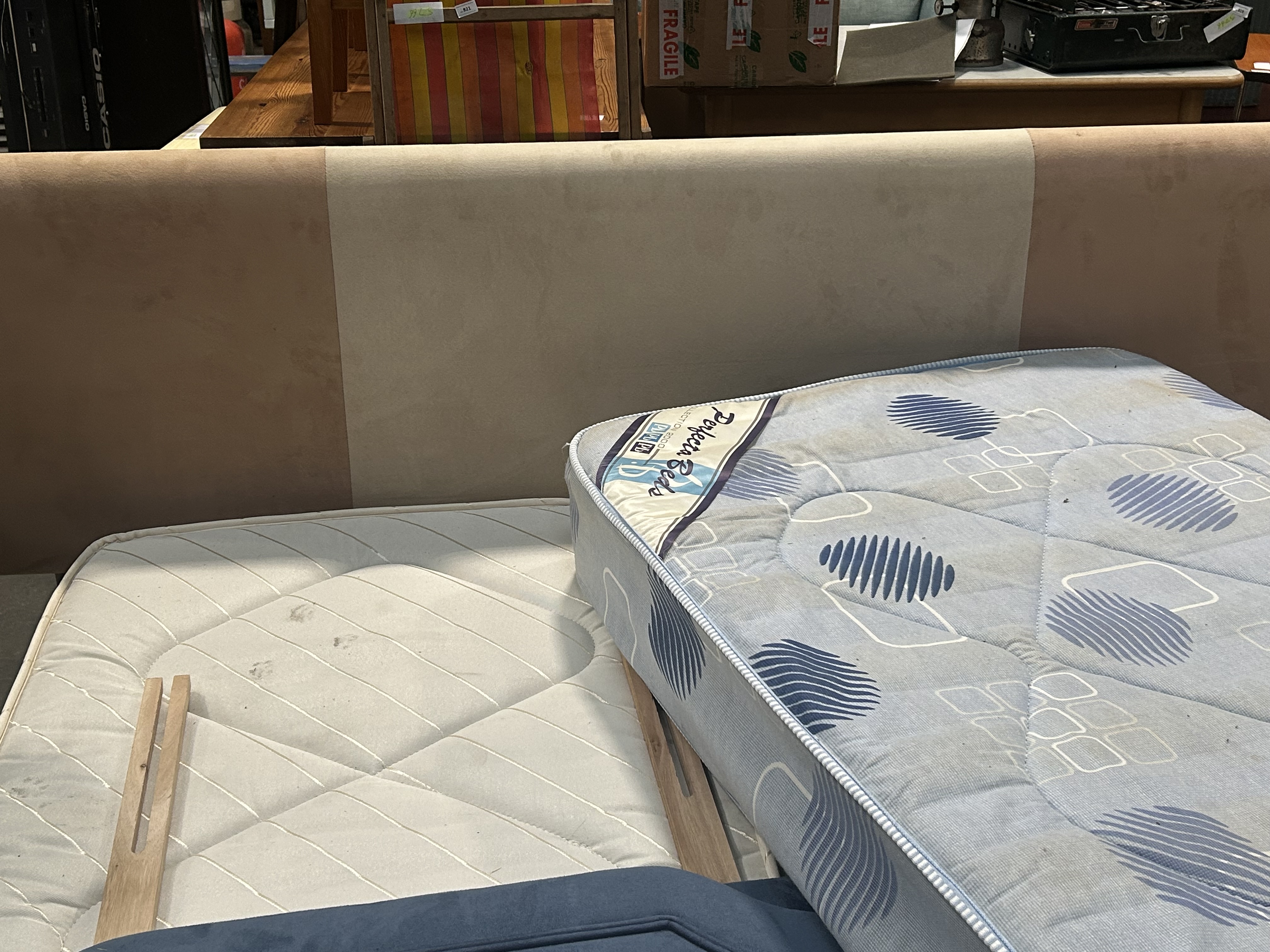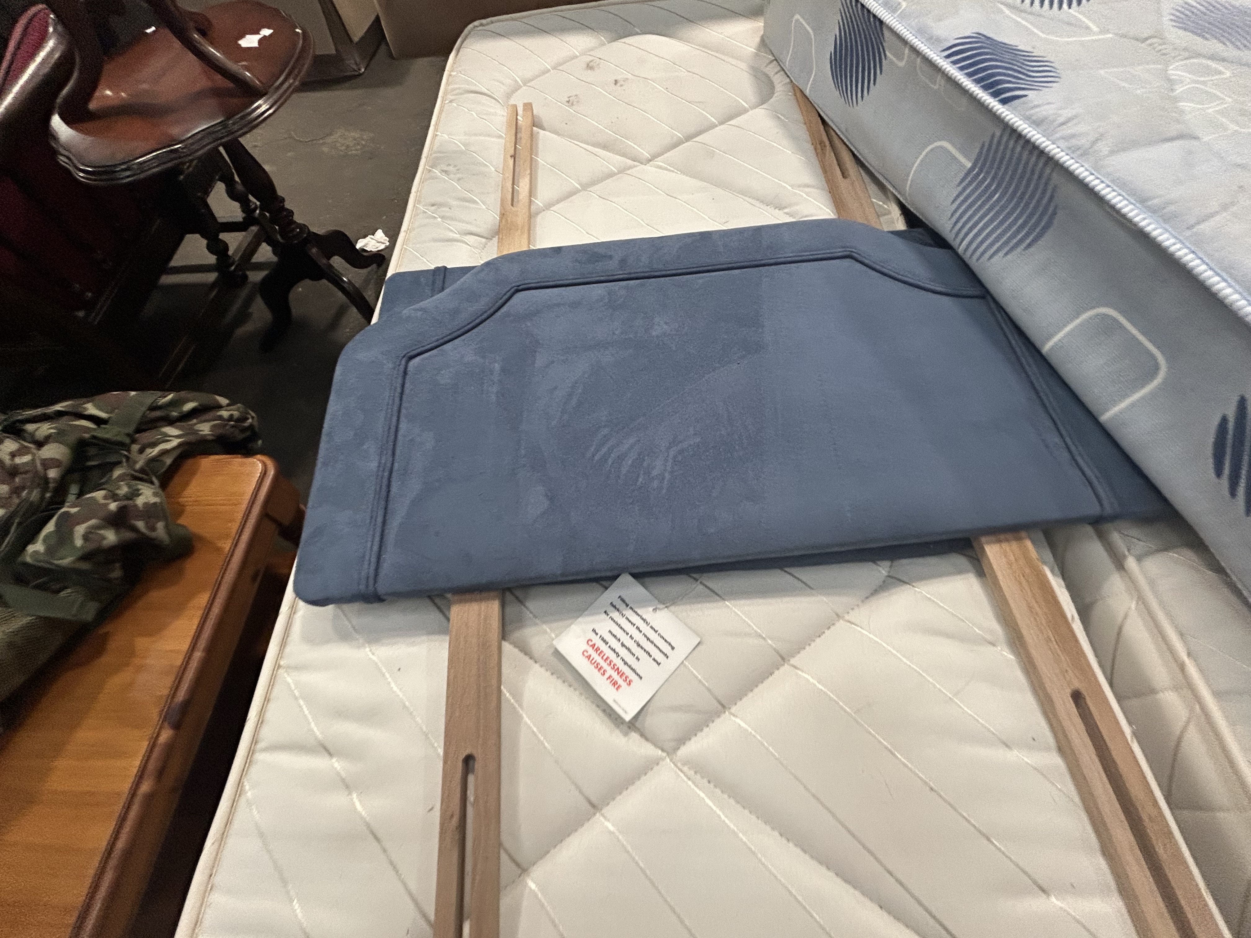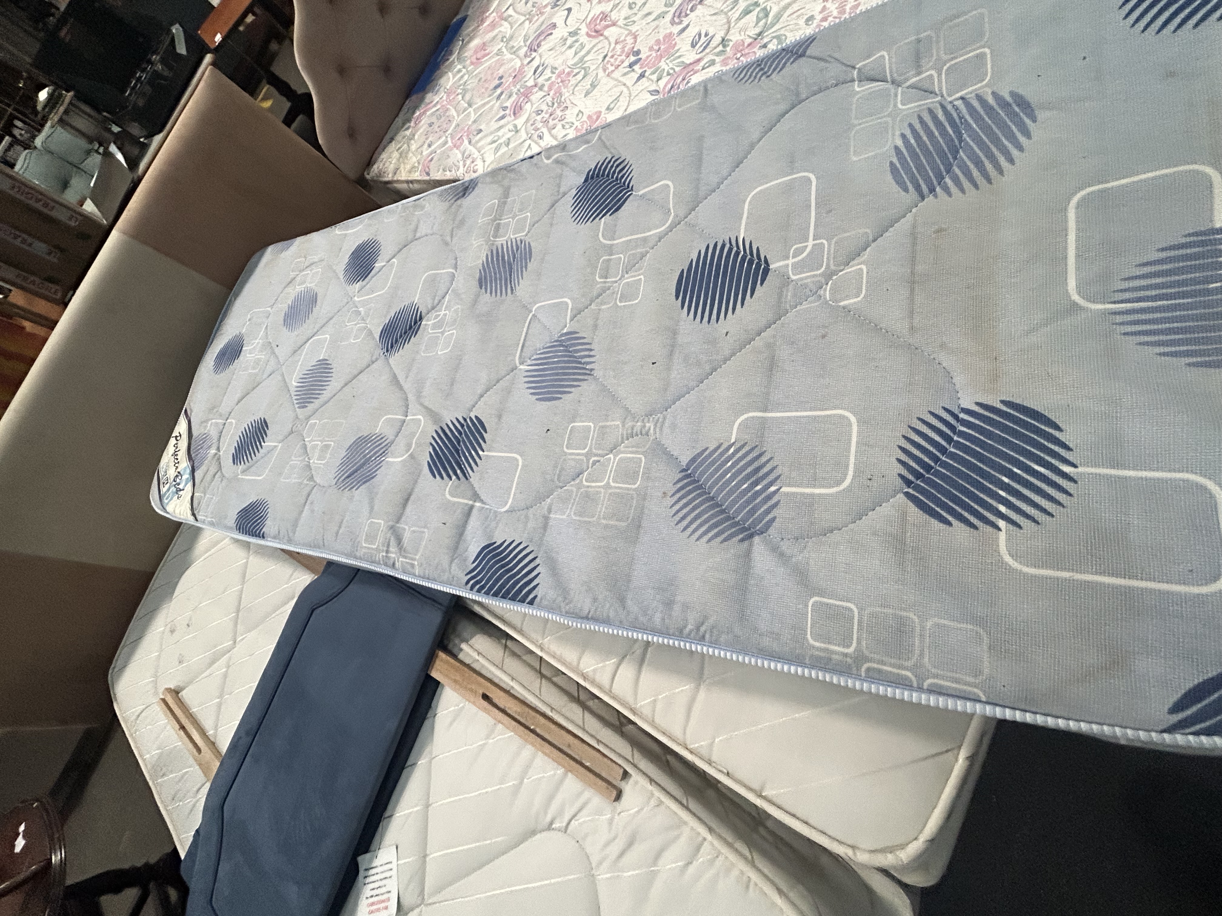 This lot comprises a selection of contemporary bedroom furniture components, featuring two single mattresses and two upholstered headboards. One single mattress is produced by Perfecta Beds as part of the Collection 2000 range, finished with blue and white patterned ticking featuring geometric and circular motifs. The second single mattress is designed with white quilted ticking and diagonal stitched lines, bearing a blue safety tag marked RESISTANT 2008 in accordance with British fire safety standard BS 7177. The assortment includes a single-sized upholstered headboard in a blue suede-effect fabric, featuring a shaped top edge, decorative stitched border, and two wooden struts for attachment to a bed base. Also included is a large contemporary upholstered headboard featuring a three-panel design in contrasting neutral beige and tan tones.