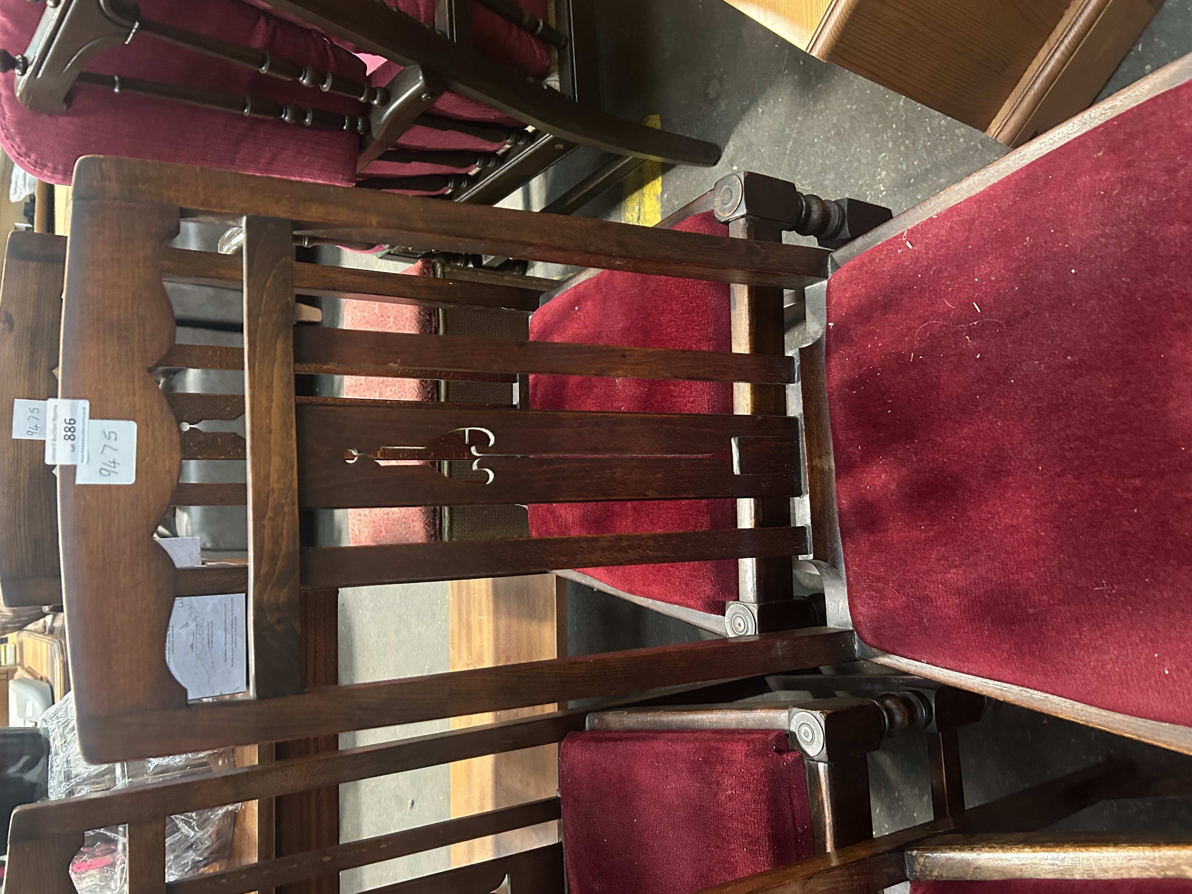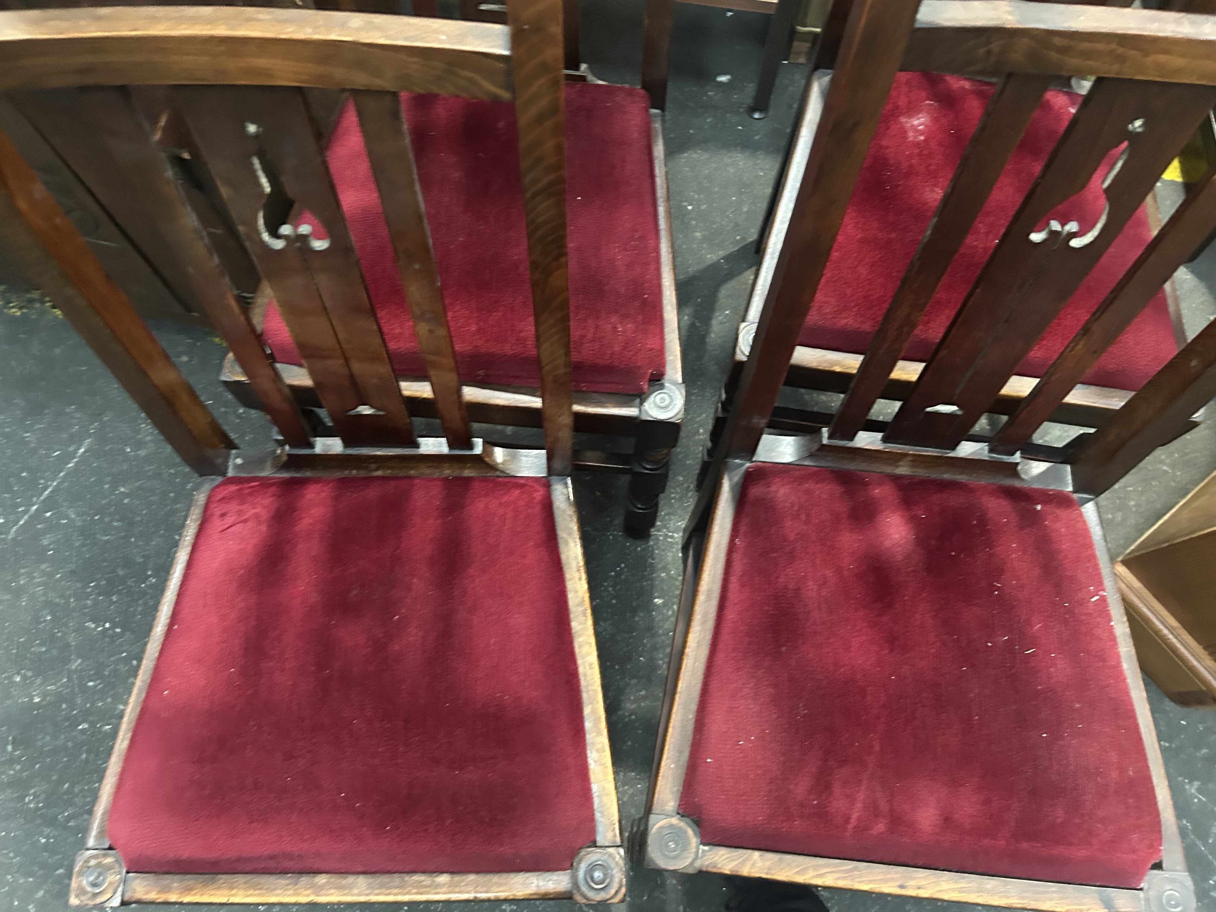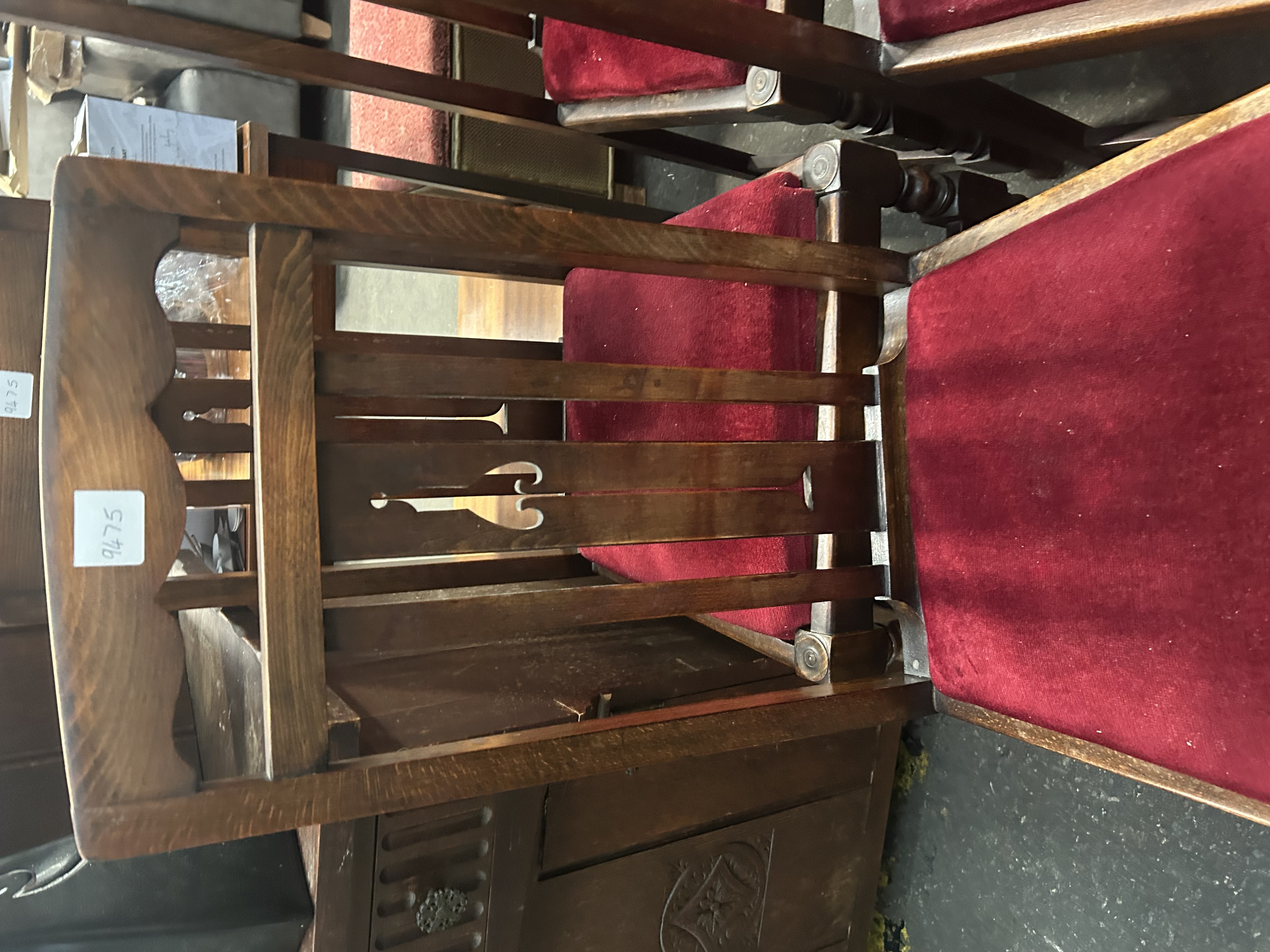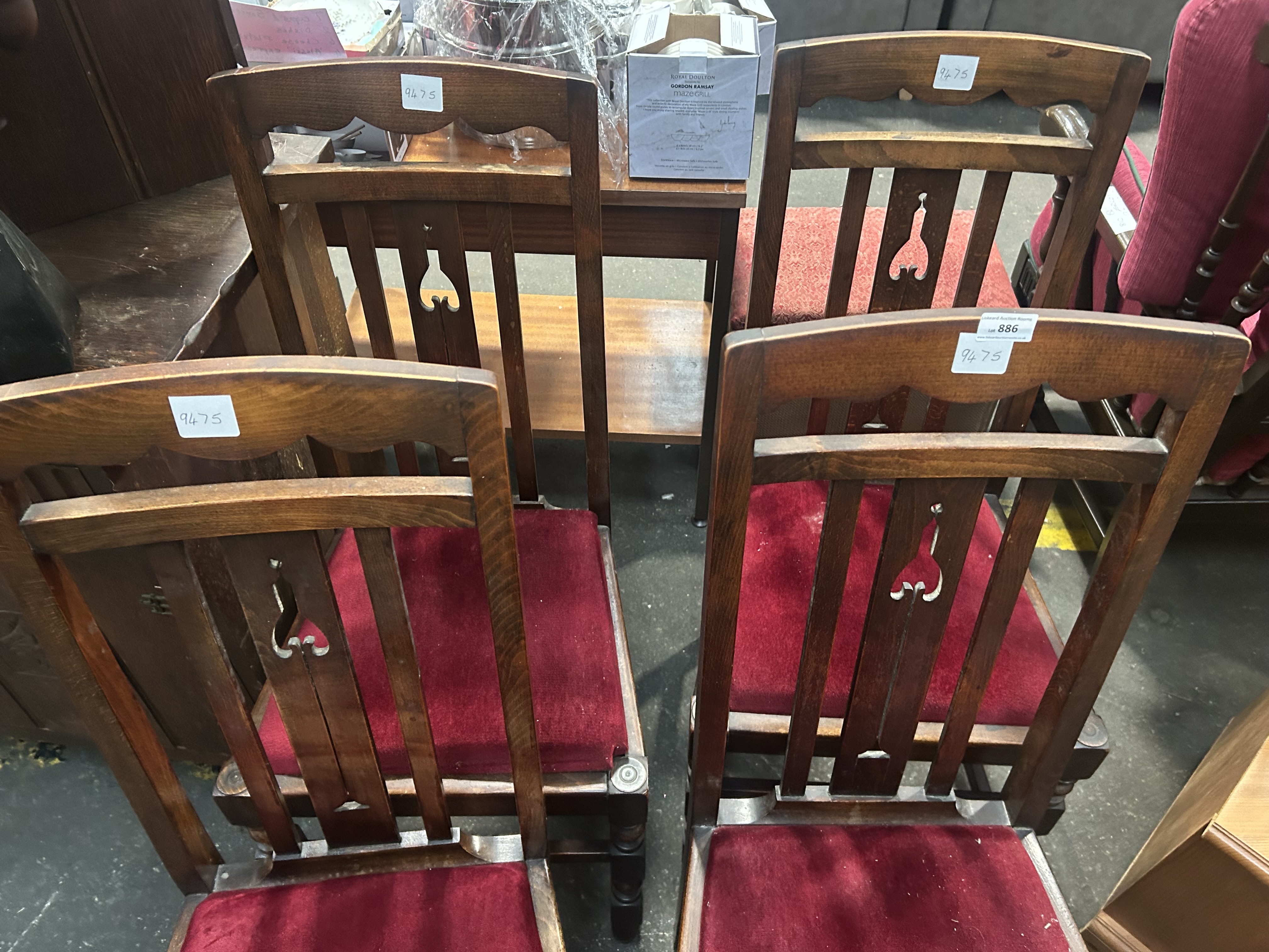 A set of four oak dining side chairs designed in the early 20th-century Arts and Crafts style. Each chair features a high back with a scalloped top rail and three vertical splats, the central splat containing a pierced decorative cutout in a stylized heart motif. The construction includes turned front legs with block joints and square-section rear legs, joined by an H-stretcher. The front corners of the seat frames are detailed with circular wooden bosses. The seats are padded and upholstered in a burgundy velvet fabric. Adhesive auction labels are present on the top rails, including one for Liskeard Auction Rooms Lot 886 and handwritten labels marked 9475.
