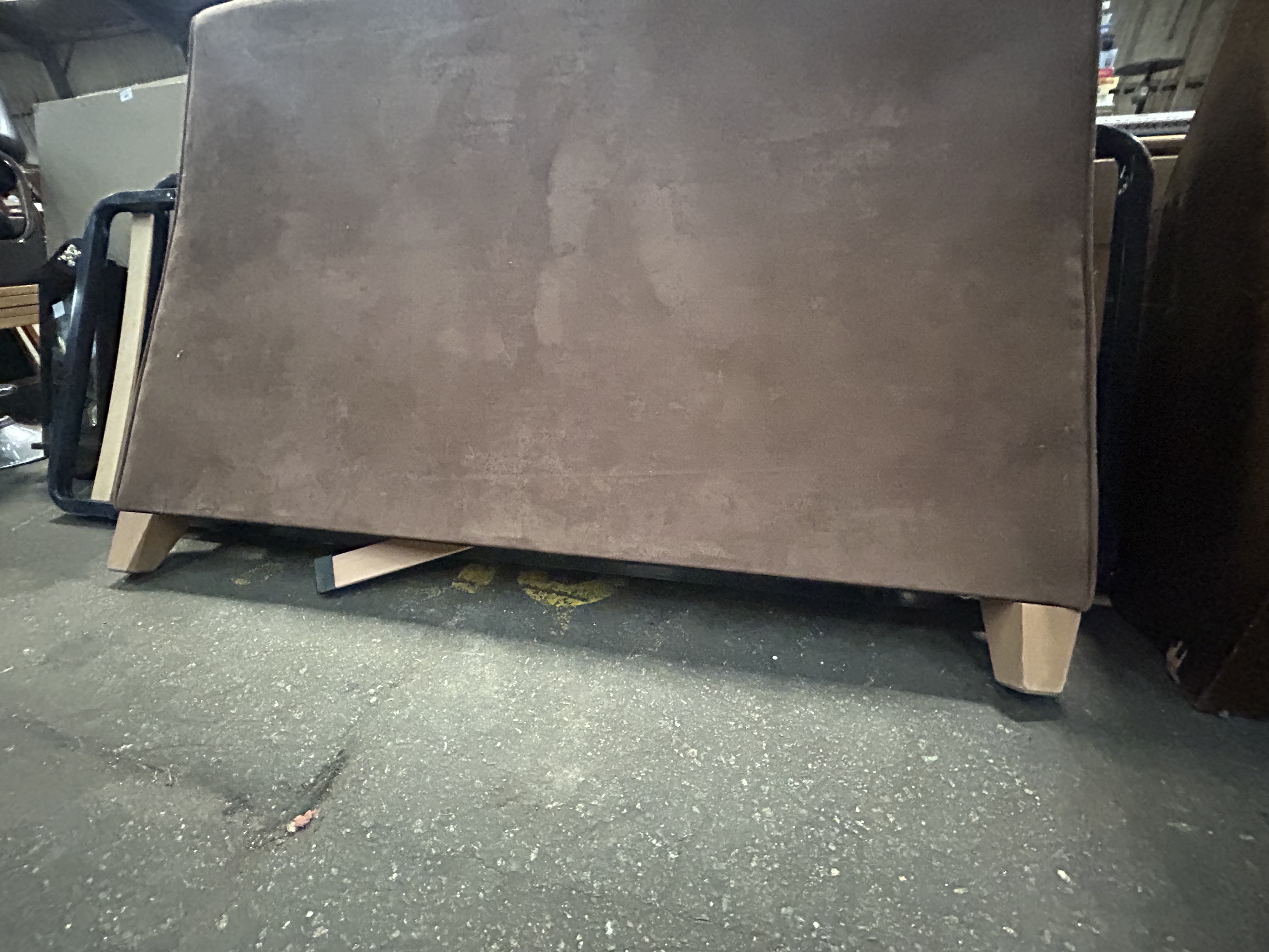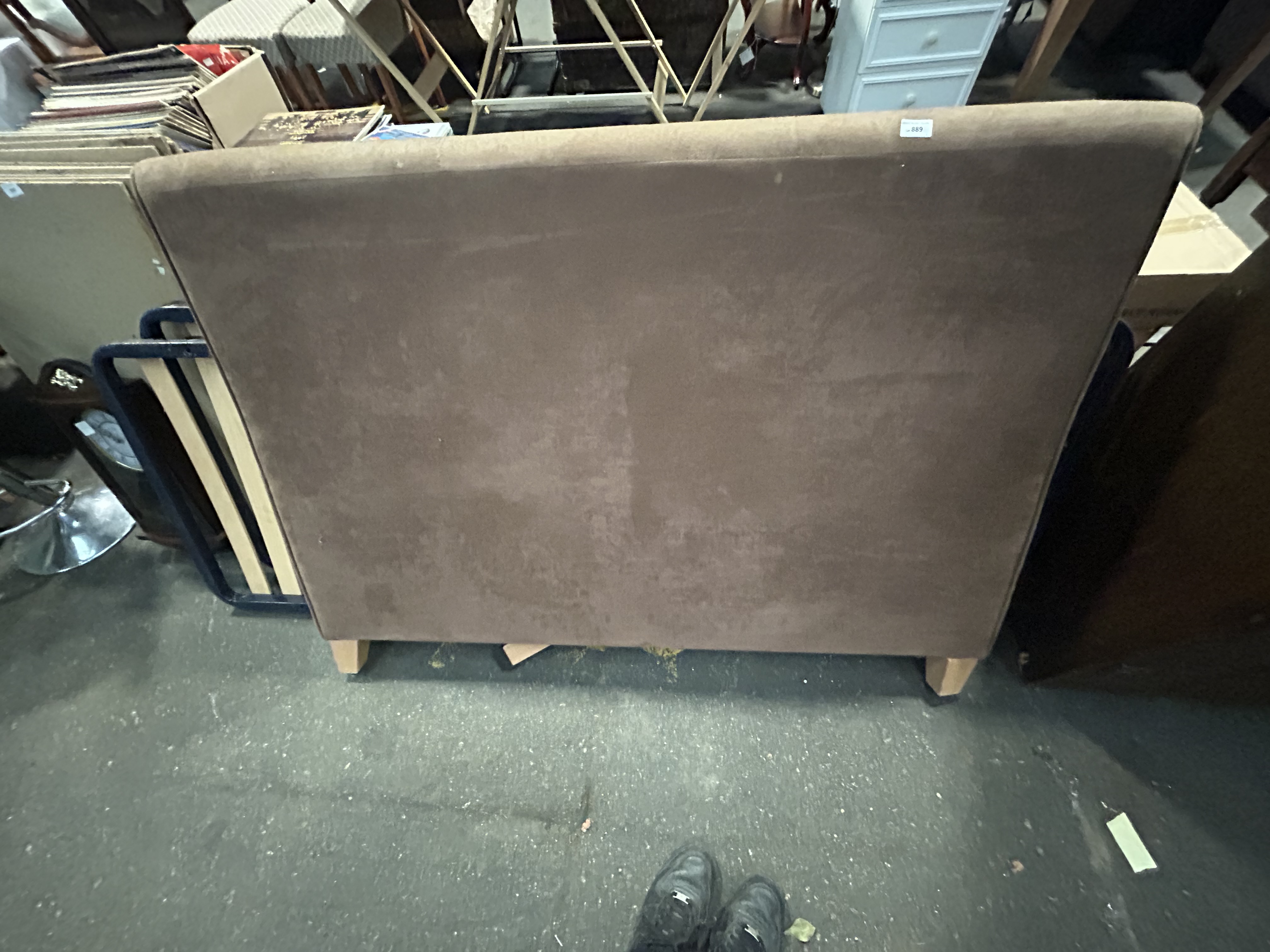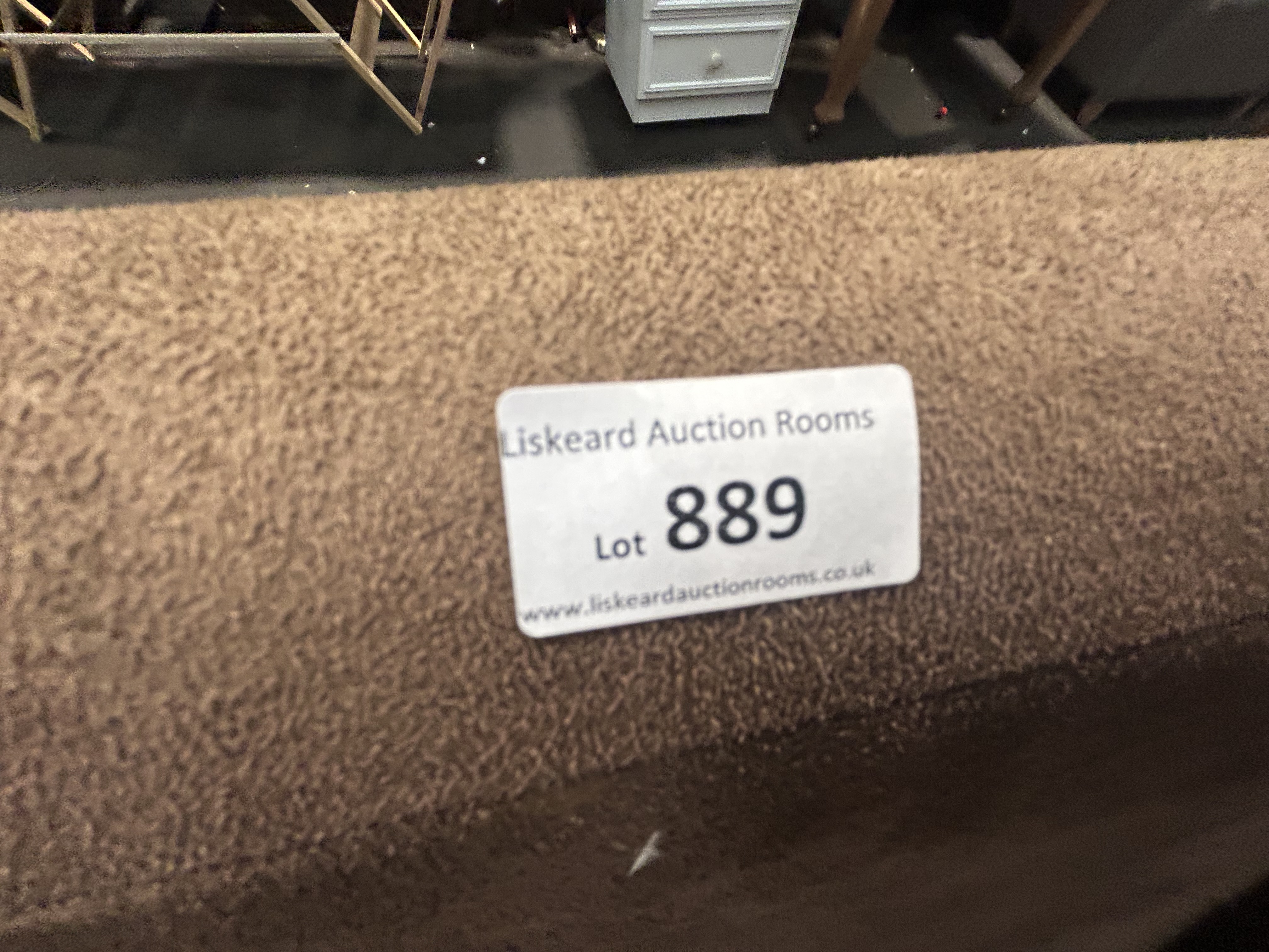 A contemporary upholstered headboard and a separate metal slatted bed frame. The headboard is rectangular and upholstered in a brown suede-effect microfibre fabric, supported by two square-tapered feet in a light-coloured wood finish. The bed frame is constructed from dark blue tubular metal with a central support rail and features arched wooden slats secured within black plastic end caps. This lot carries an auction tag from Liskeard Auction Rooms for lot number 889.