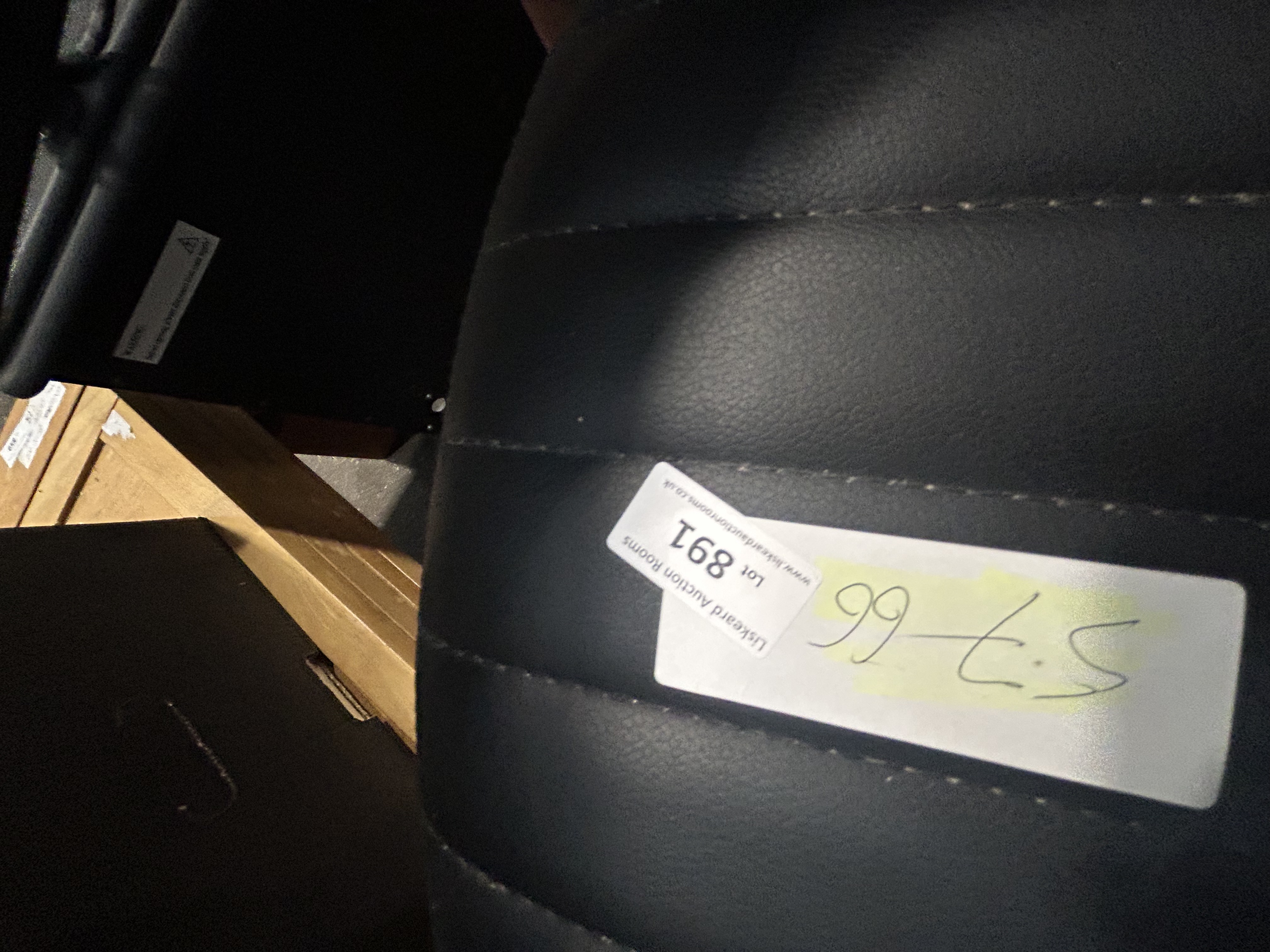 A contemporary pedestal bar stool upholstered in black vinyl. The design features a curved backrest with integrated armrests and a square seat, both finished with horizontal stitched ribbing. It is supported by a chrome-plated tubular metal pedestal base featuring a swivel mechanism, a semi-circular footrest, and a wide circular foot. The seat bears a label for Liskeard Auction Rooms, Lot 891.