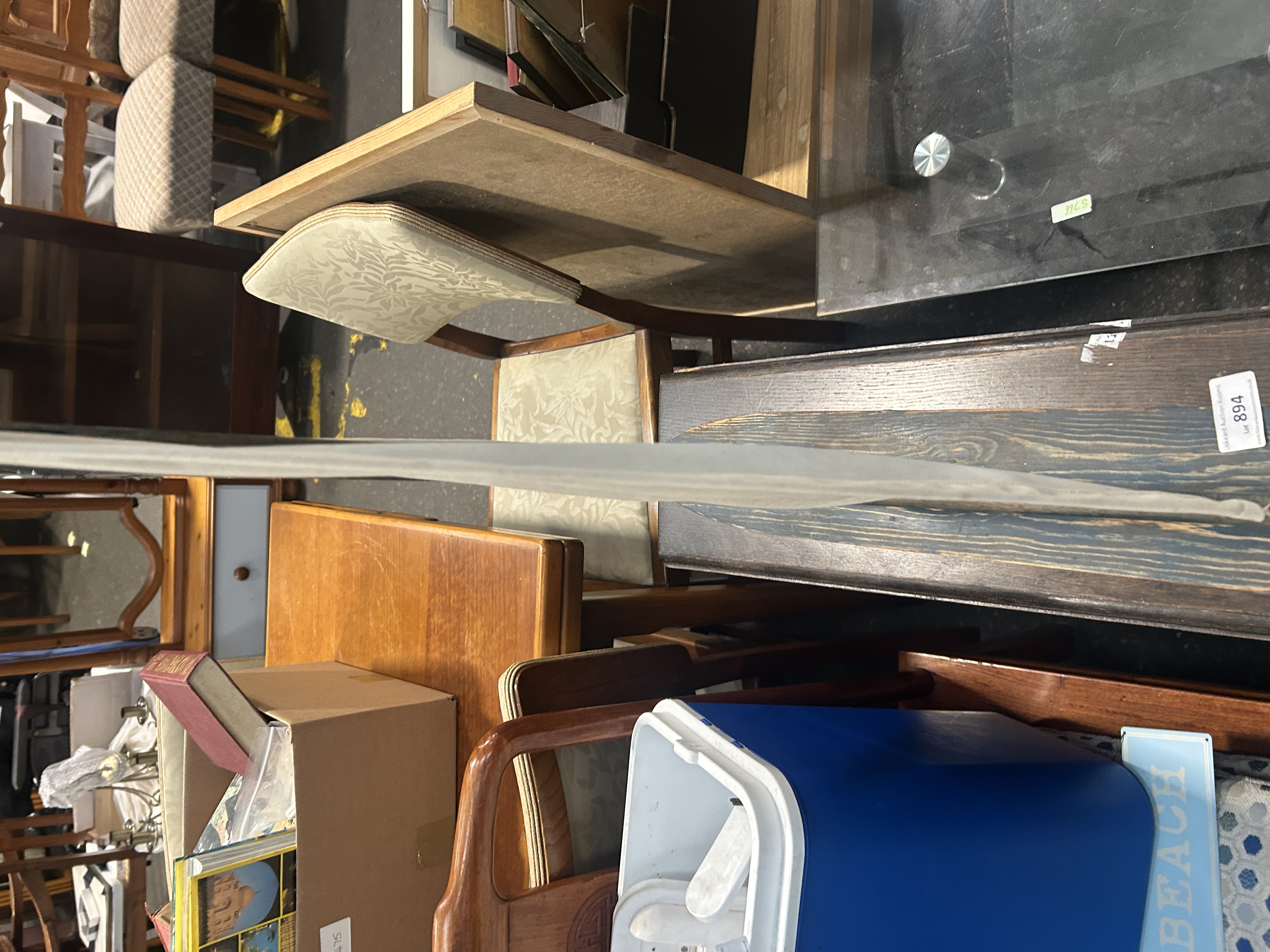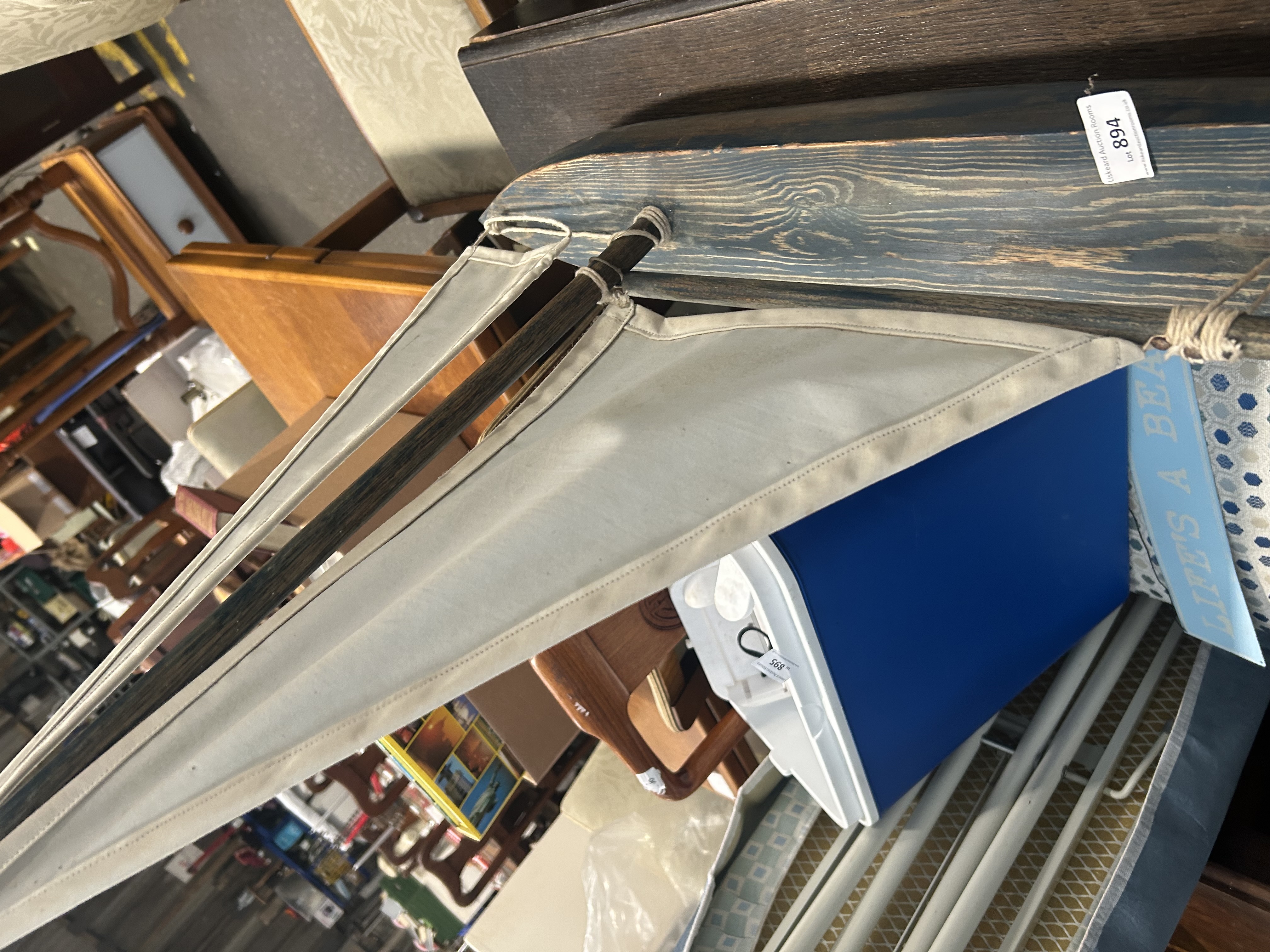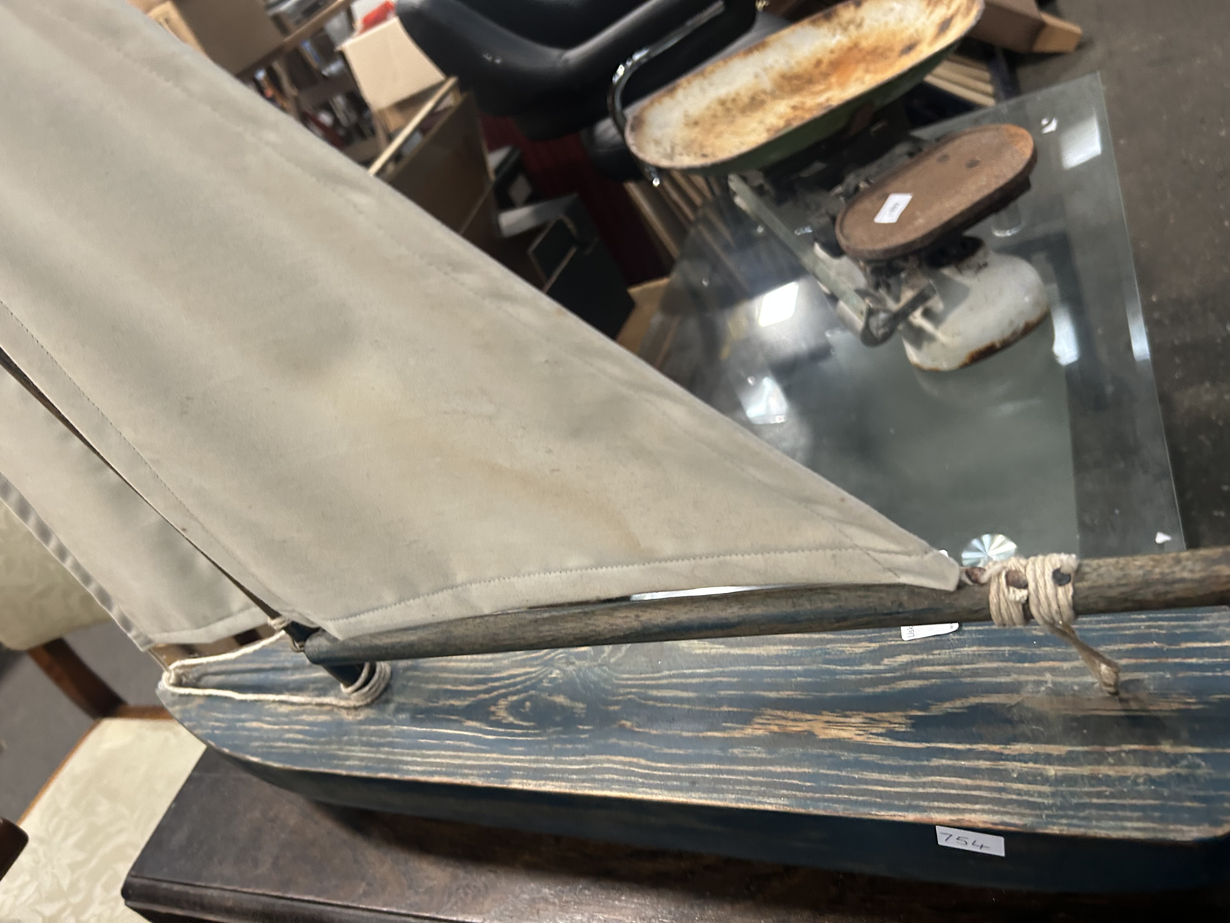 This lot comprises a variety of household furniture and decorative items. Included is a large, hand-crafted decorative model sailboat featuring a wooden hull with a prominent grain and a distressed dark blue-green paint finish. It is rigged with a single wooden mast and boom, white cordage, and off-white fabric sails. The furniture selection includes a modern farmhouse-style dining table in a light-toned wood, a glass coffee table with a clear top and cylindrical chrome-finished metal legs, and a mid-century modern style table in a medium-toned hardwood. Also included is a set of dining chairs with light-coloured, patterned fabric upholstery. Further items in the group consist of a blue and white cooler and a set of vintage mechanical scales. The sailboat hull bears a printed label from Liskeard Auction Rooms for Lot 894 and a smaller white sticker marked 754.