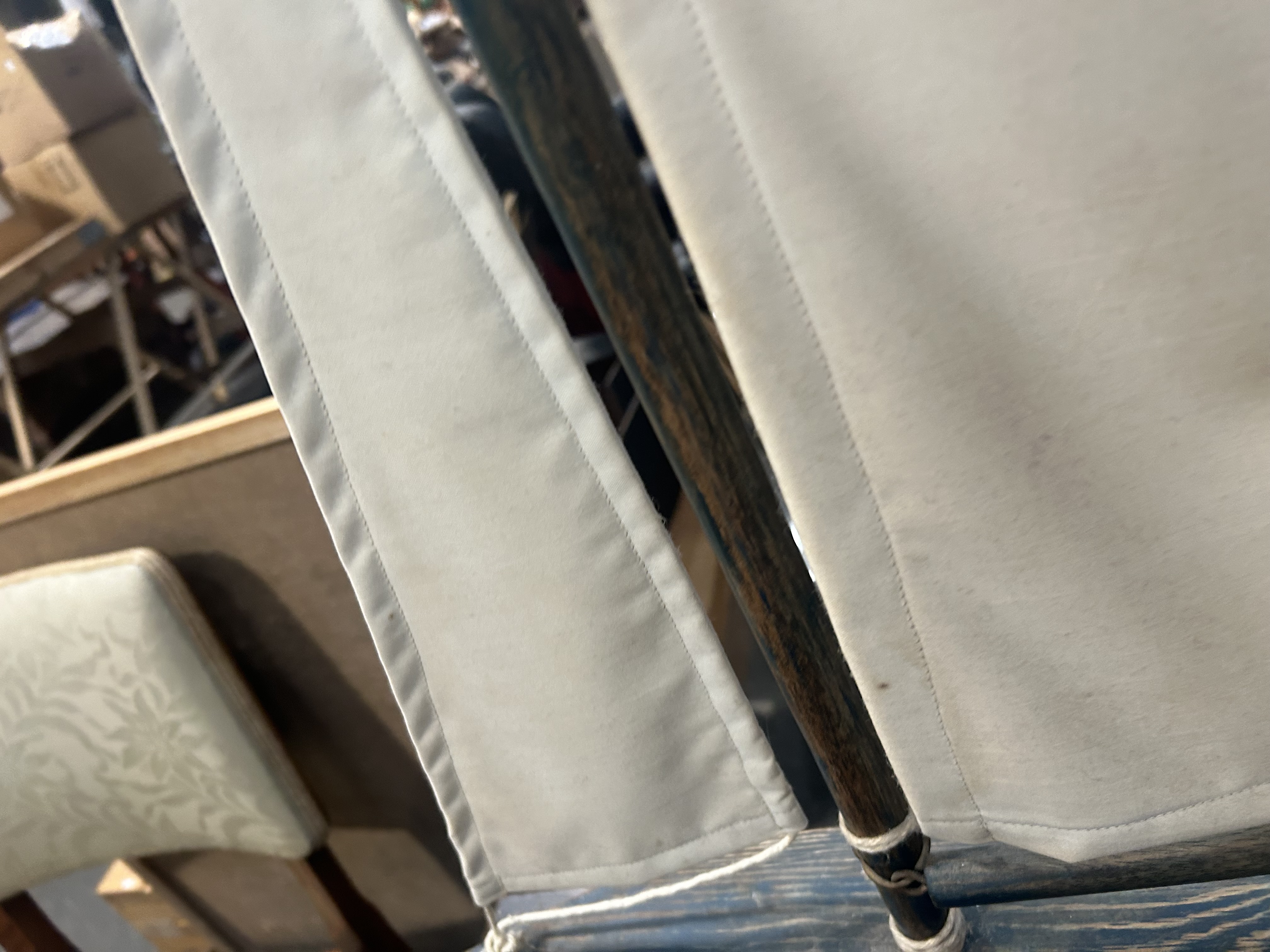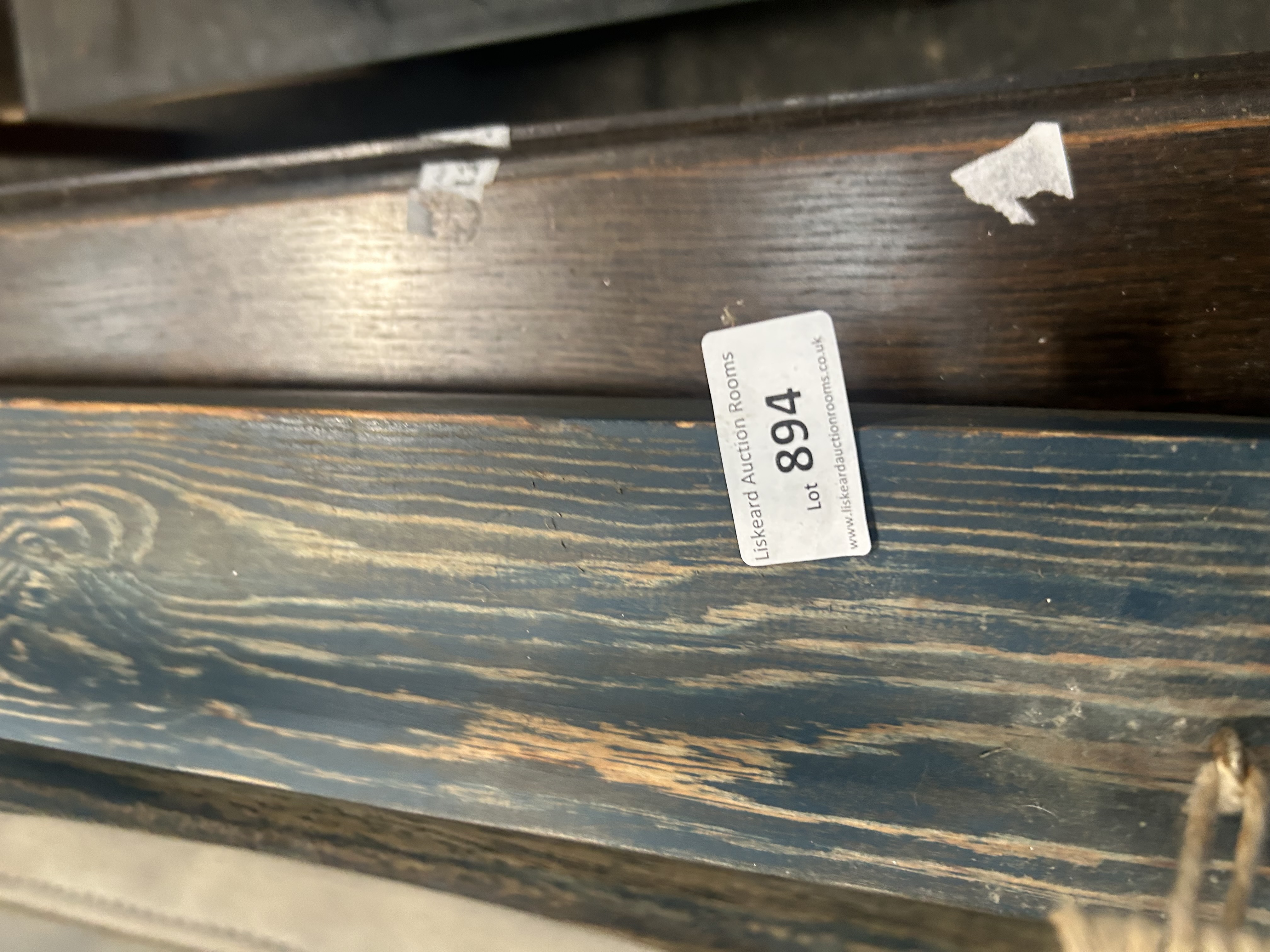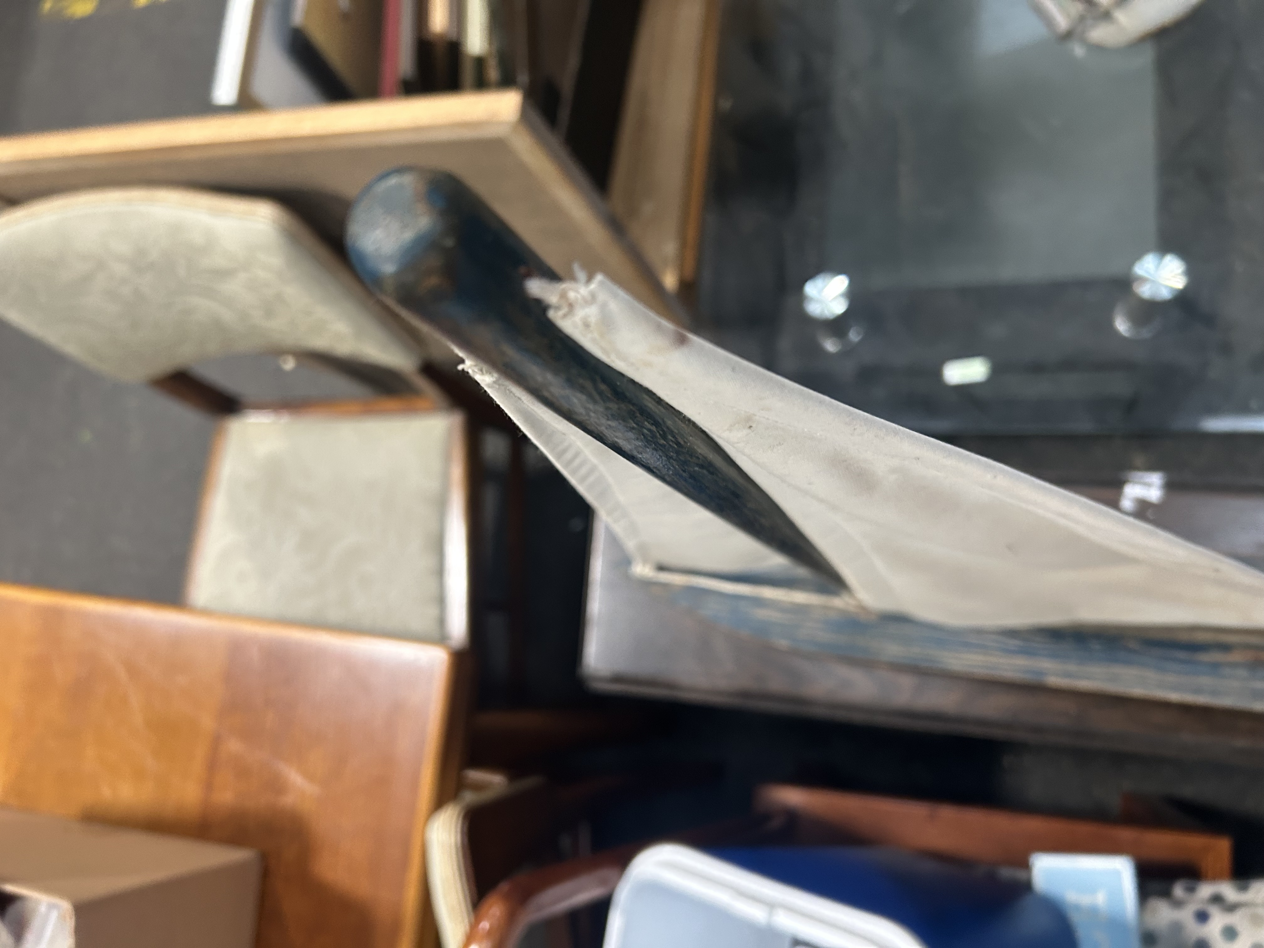 This lot comprises a variety of household furniture and decorative items. Included is a large, hand-crafted decorative model sailboat featuring a wooden hull with a prominent grain and a distressed dark blue-green paint finish. It is rigged with a single wooden mast and boom, white cordage, and off-white fabric sails. The furniture selection includes a modern farmhouse-style dining table in a light-toned wood, a glass coffee table with a clear top and cylindrical chrome-finished metal legs, and a mid-century modern style table in a medium-toned hardwood. Also included is a set of dining chairs with light-coloured, patterned fabric upholstery. Further items in the group consist of a blue and white cooler and a set of vintage mechanical scales. The sailboat hull bears a printed label from Liskeard Auction Rooms for Lot 894 and a smaller white sticker marked 754.