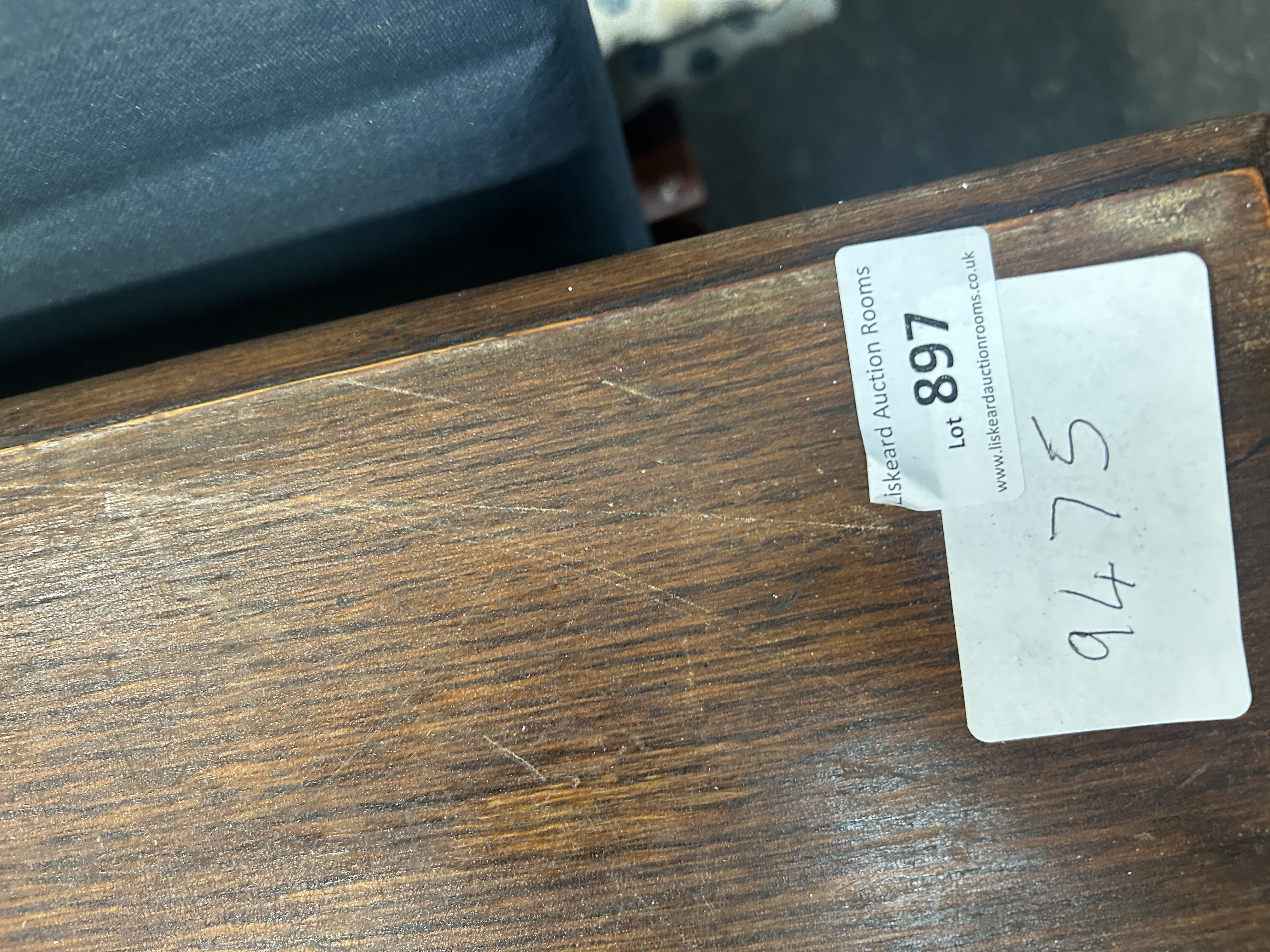 This is an early 20th-century oak side or occasional table designed in the Jacobean revival style. The table features a solid oak rectangular top with a simple moulded edge. It stands on four legs with barley-twist turnings, which are connected by low-positioned rectangular stretchers that form a perimeter base. The construction is typical of English revival furniture from the period, referencing 17th-century design elements. There are no drawers or leaves associated with this piece. A modern auction label from Liskeard Auction Rooms is present on the top surface, identifying it as Lot 897.