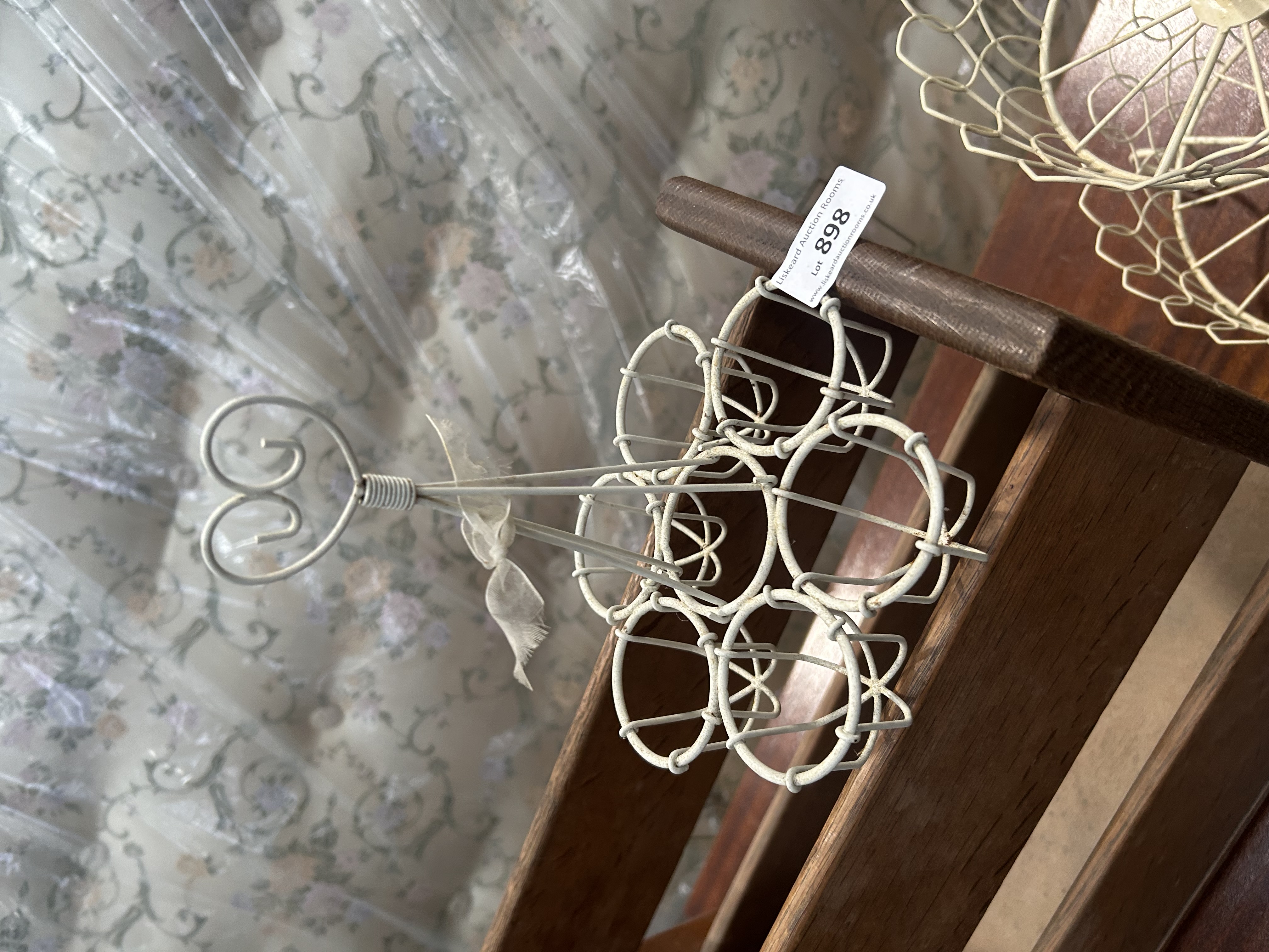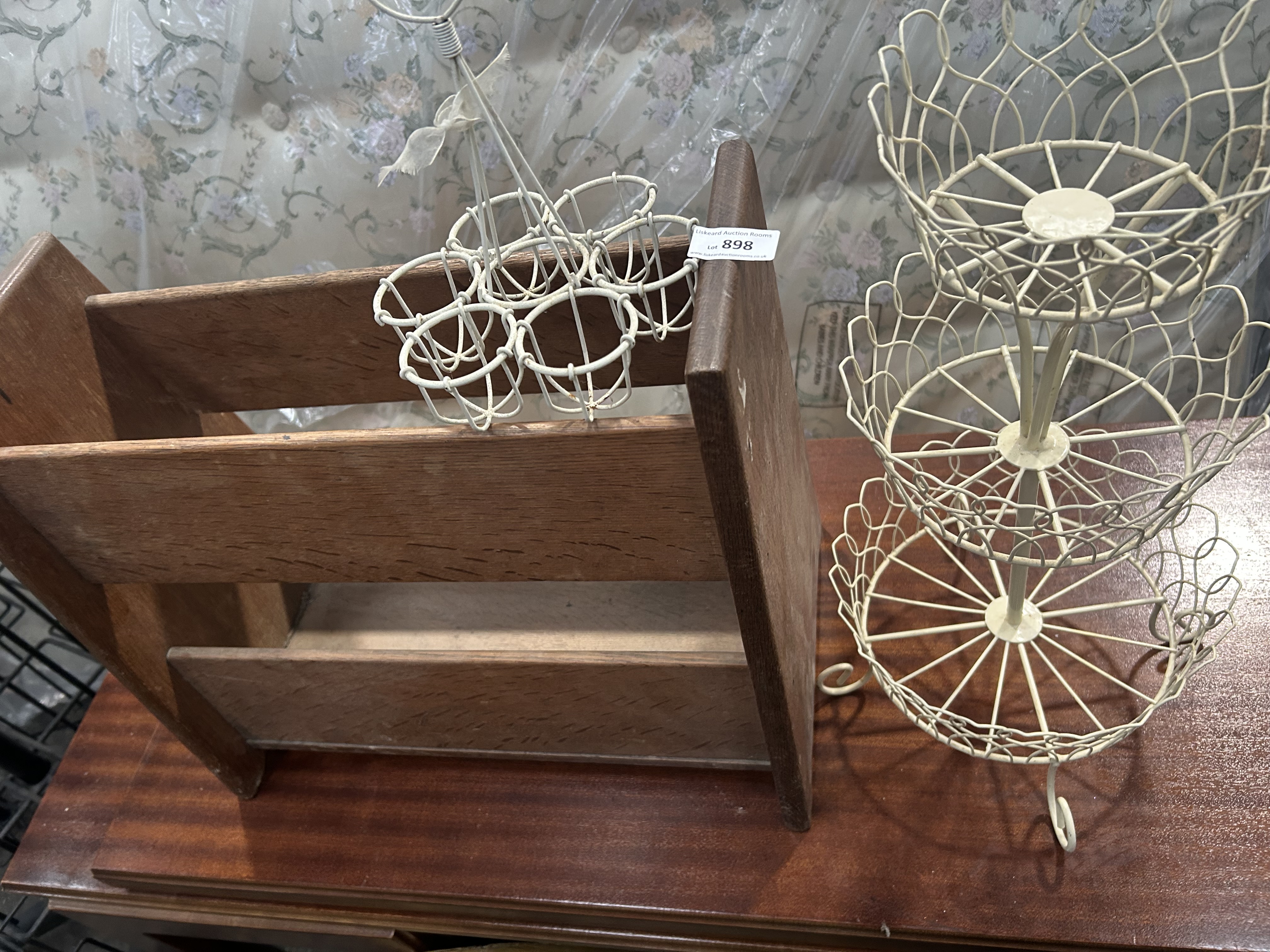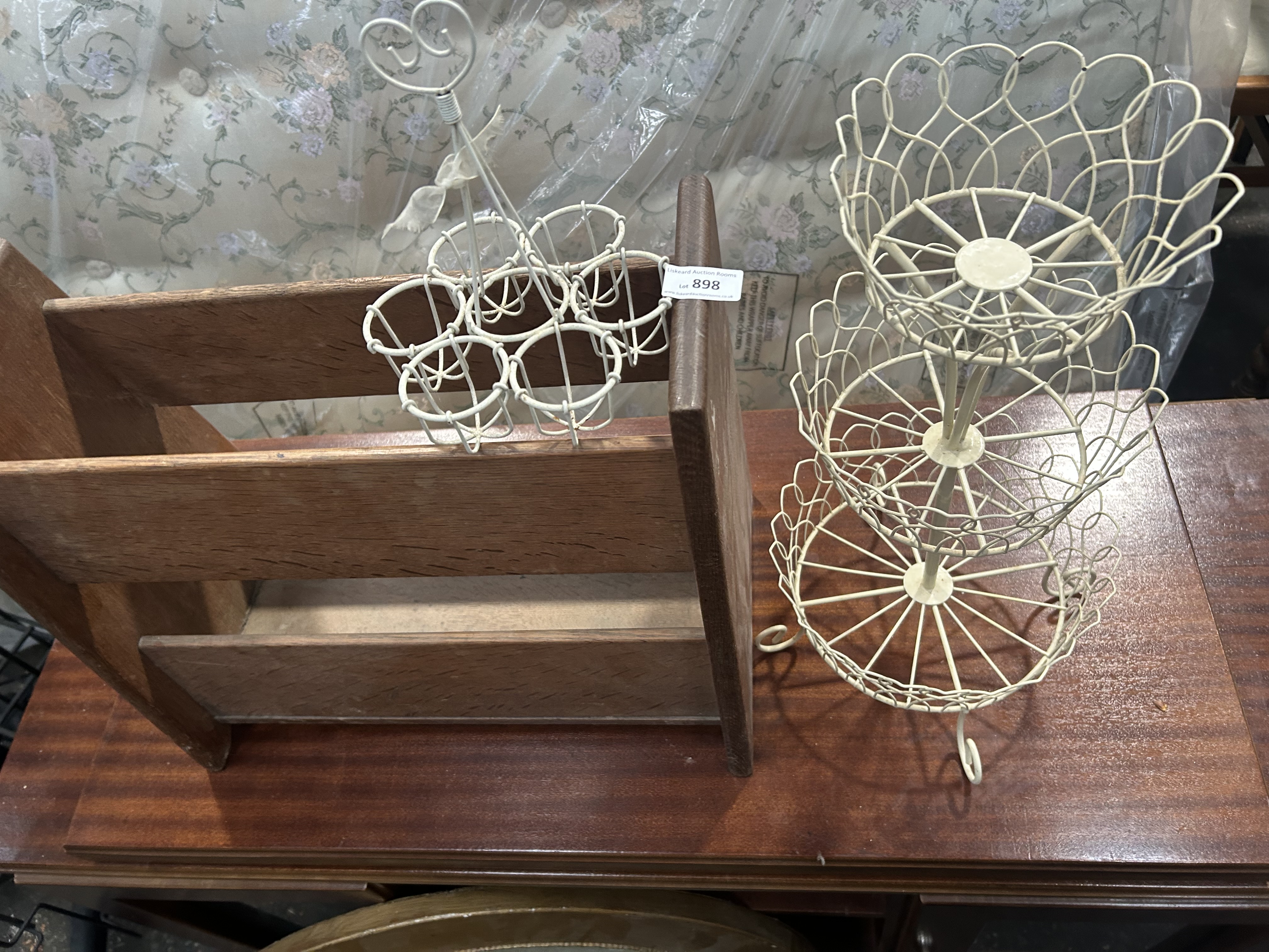 This lot contains three items of domestic utility and decor. Included is a freestanding wooden magazine rack crafted from a stained hardwood with a prominent grain, designed with three horizontal slats on either side and solid, angled end panels. Accompanying this are two cream-painted wirework items: a six-compartment carrier with a central handle topped by a heart-shaped motif, and a three-tiered stand. The stand features three circular baskets with scalloped rims, mounted on a central column and supported by a tripod base with scrolled feet. An adhesive auction label from Liskeard Auction Rooms is present on the wooden rack and one wire item.