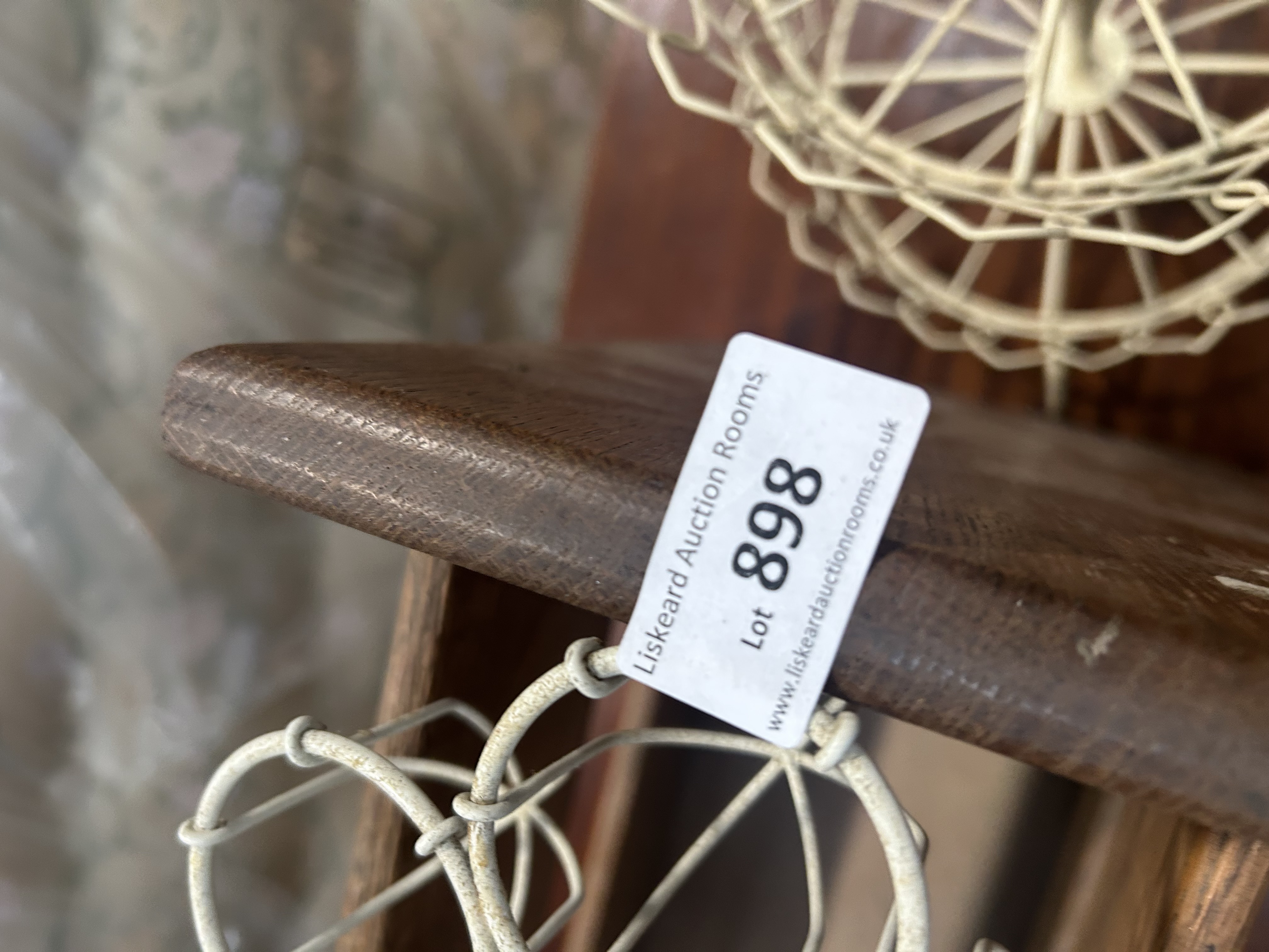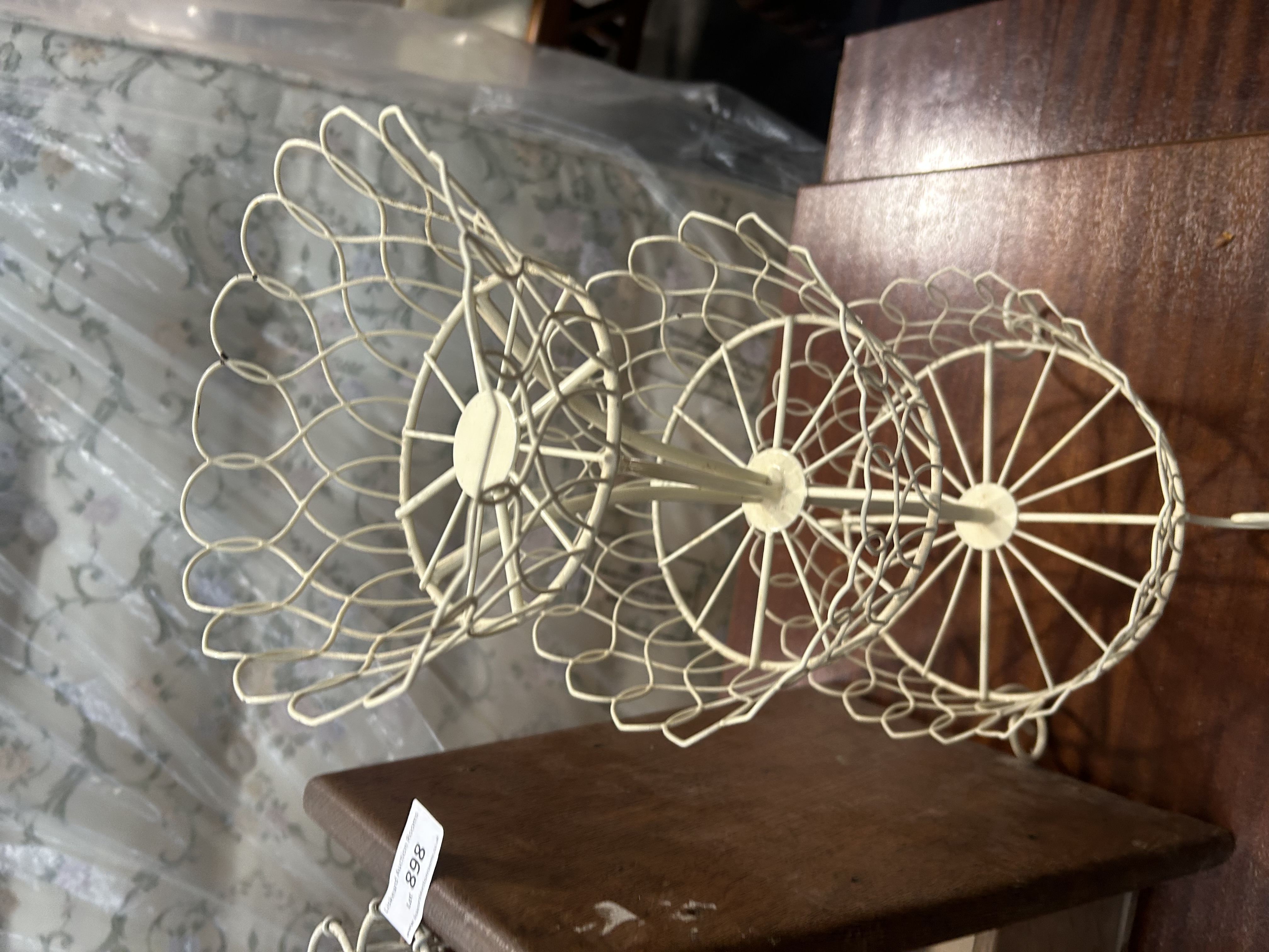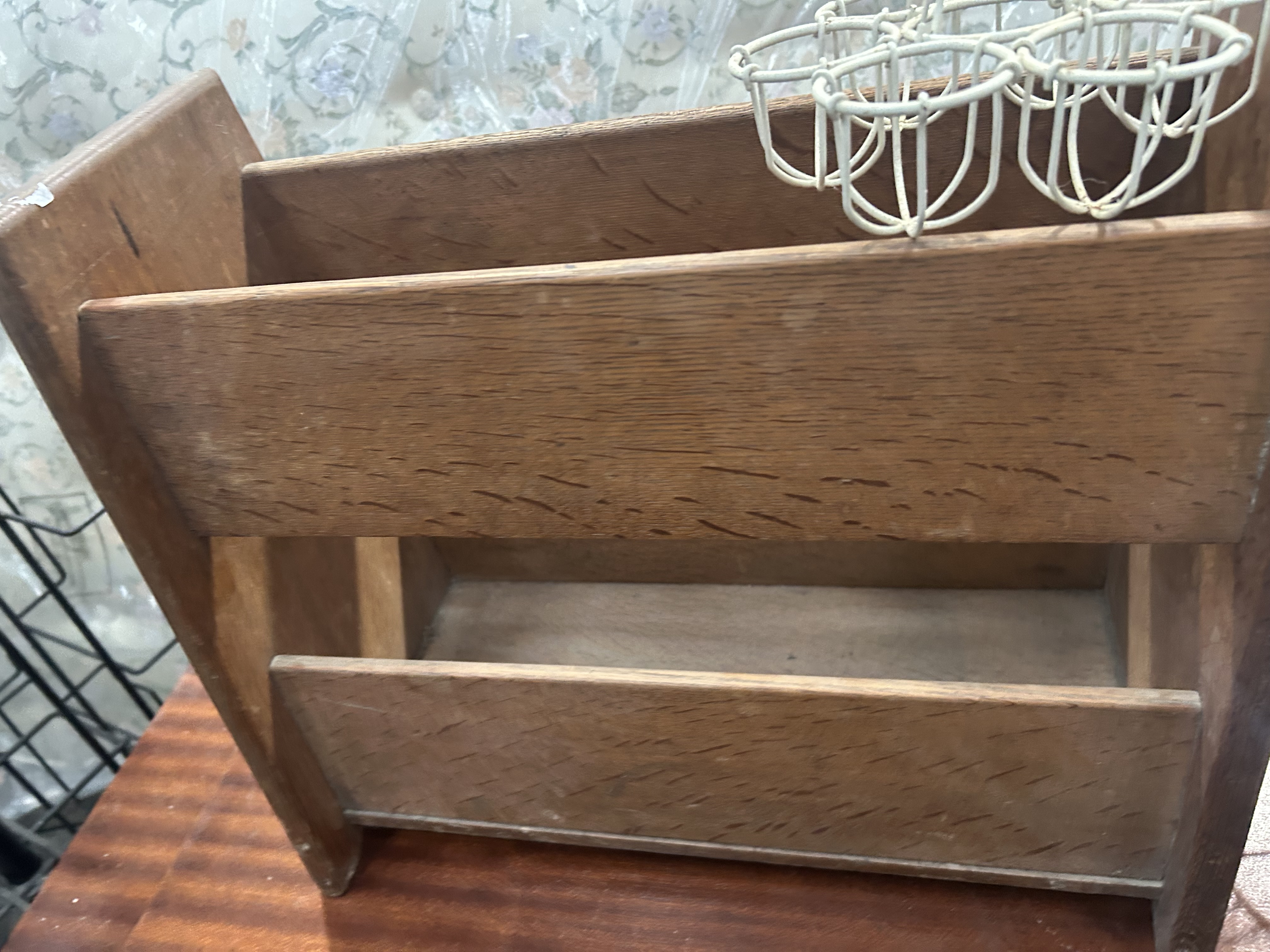 This lot contains three items of domestic utility and decor. Included is a freestanding wooden magazine rack crafted from a stained hardwood with a prominent grain, designed with three horizontal slats on either side and solid, angled end panels. Accompanying this are two cream-painted wirework items: a six-compartment carrier with a central handle topped by a heart-shaped motif, and a three-tiered stand. The stand features three circular baskets with scalloped rims, mounted on a central column and supported by a tripod base with scrolled feet. An adhesive auction label from Liskeard Auction Rooms is present on the wooden rack and one wire item.